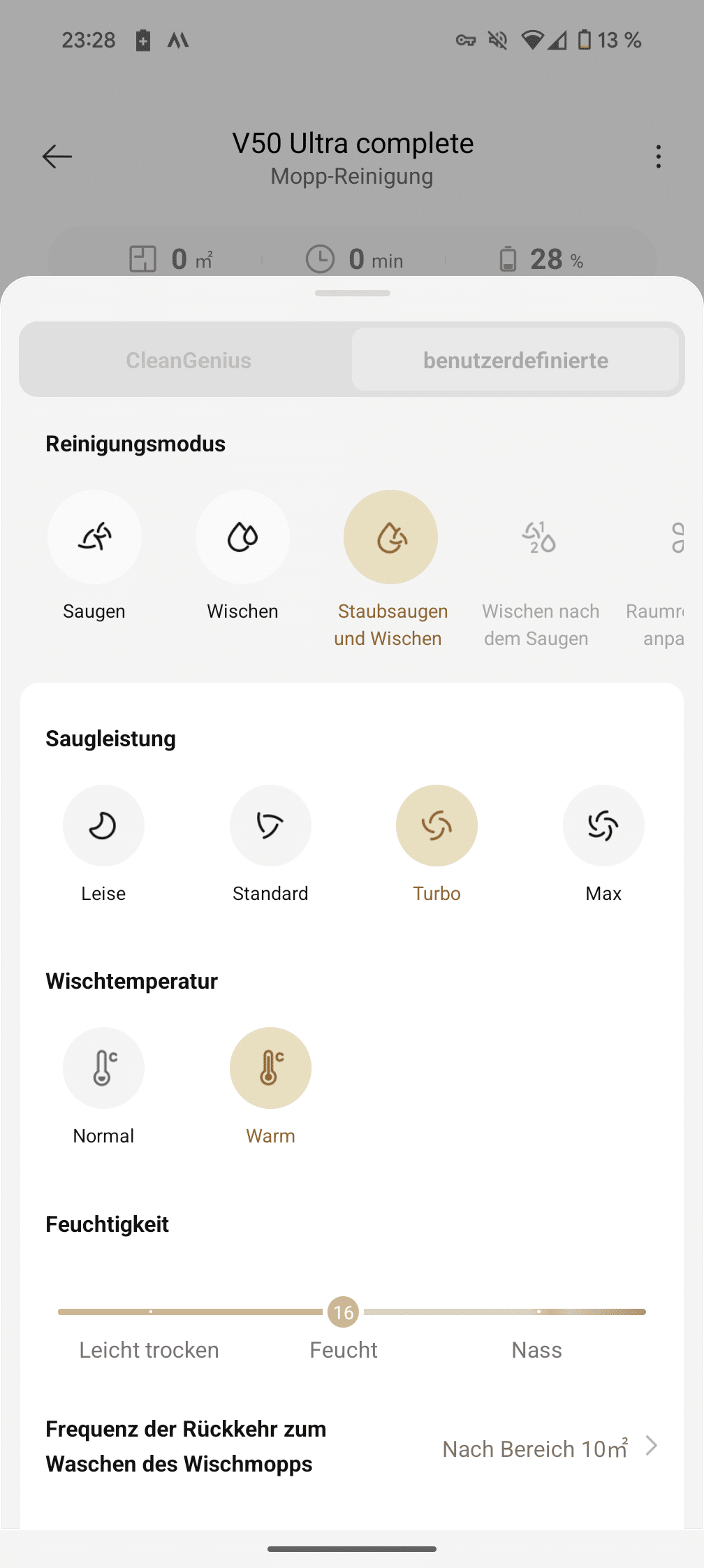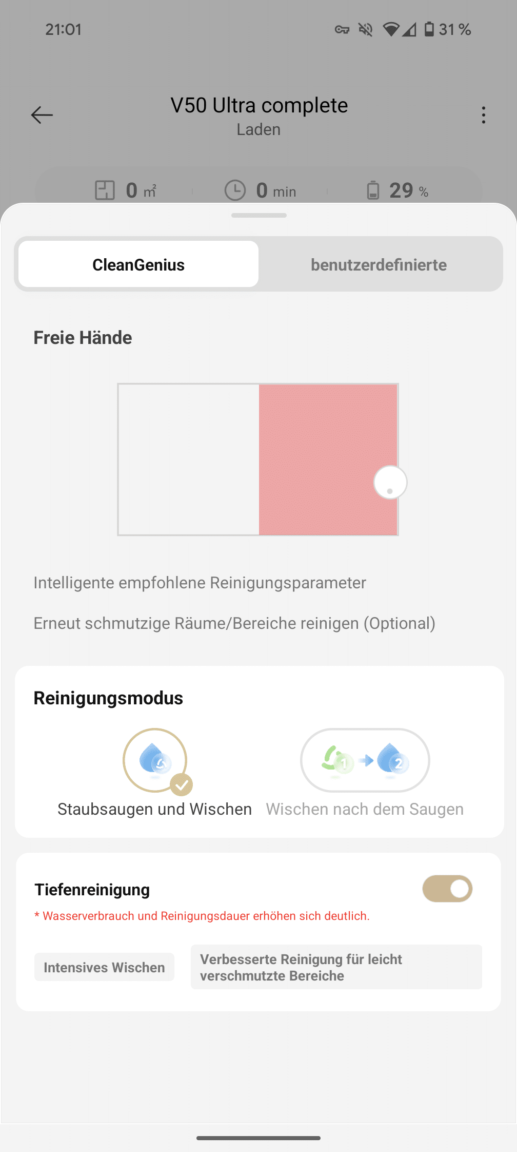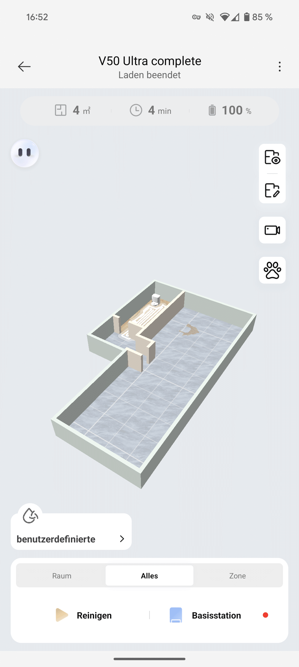 The Mova Home app really packs in everything that is technically possible. In addition to standard features such as schedules and restricted zones, there are individual cleaning intensities, CleanGenius mode and a live camera. The German translations are still bumpy in places and can be a little confusing, but functionally everything works. Over time, you get used to it and know what is meant.