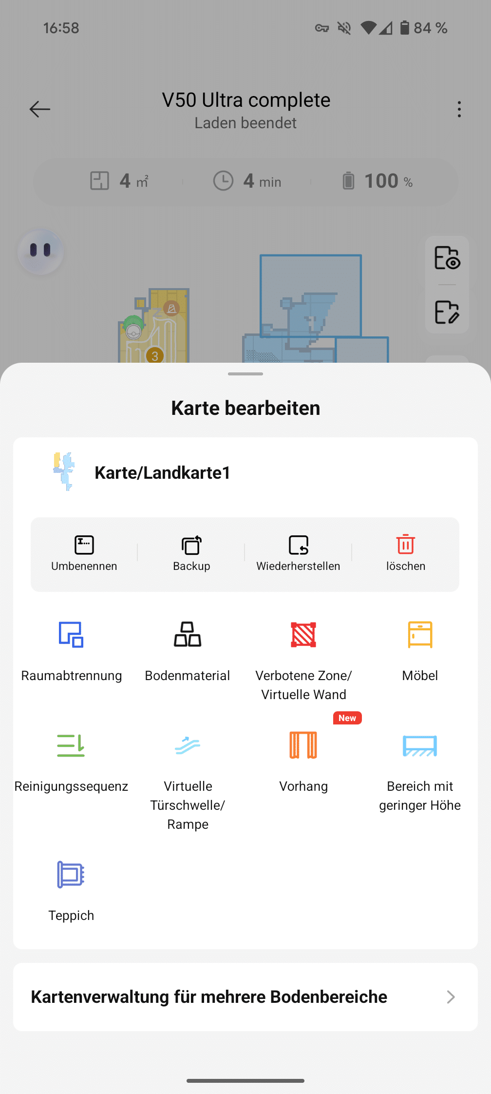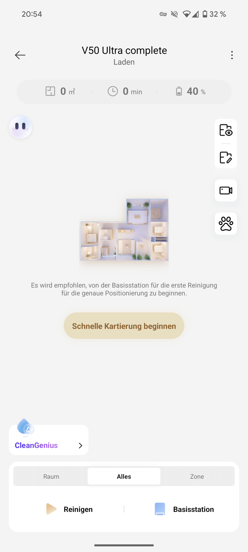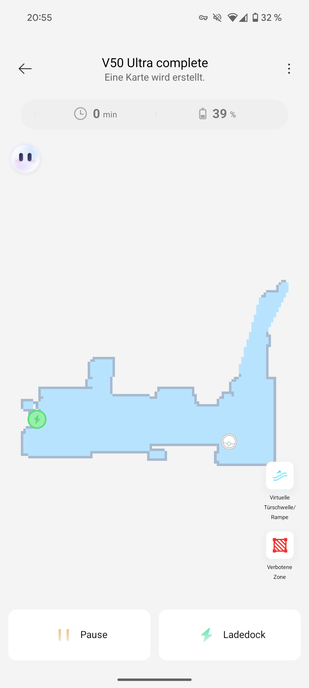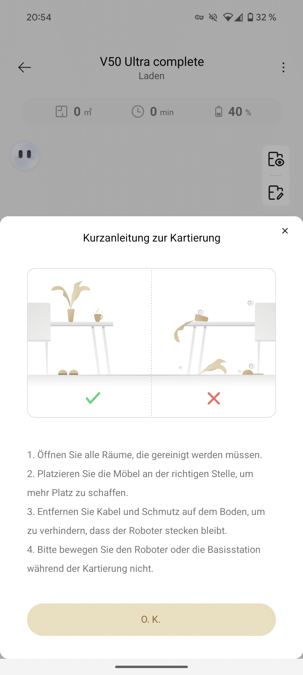 The app connection basically works smoothly – even though we initially thought the QR code was absolutely necessary. We simply downloaded the app directly from the store and set up the robot as normal – it worked without any problems. It was only later that we discovered the QR code on the box, which would probably have made the process a little easier. After entering the Wi-Fi data and a brief firmware update, the V50 Ultra was ready to go in around ten minutes.