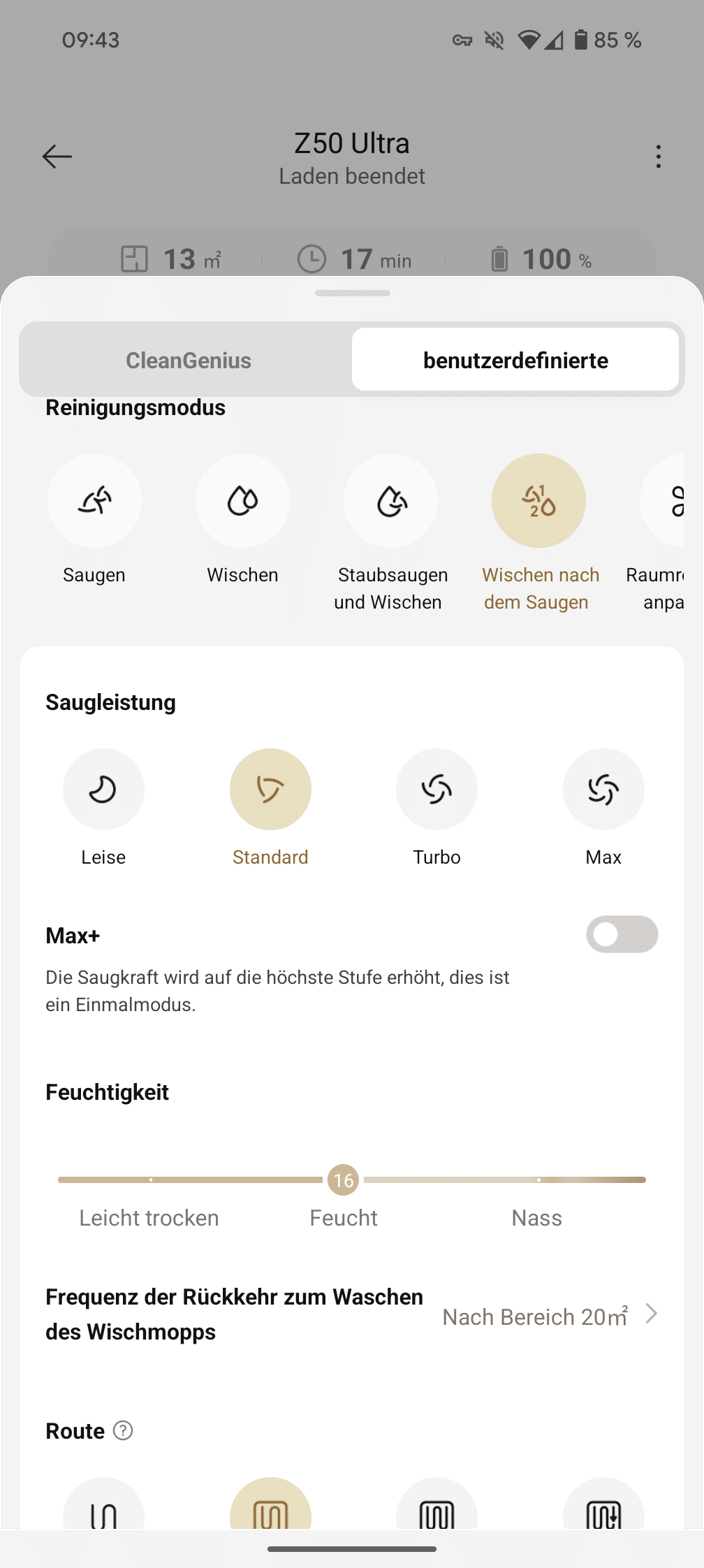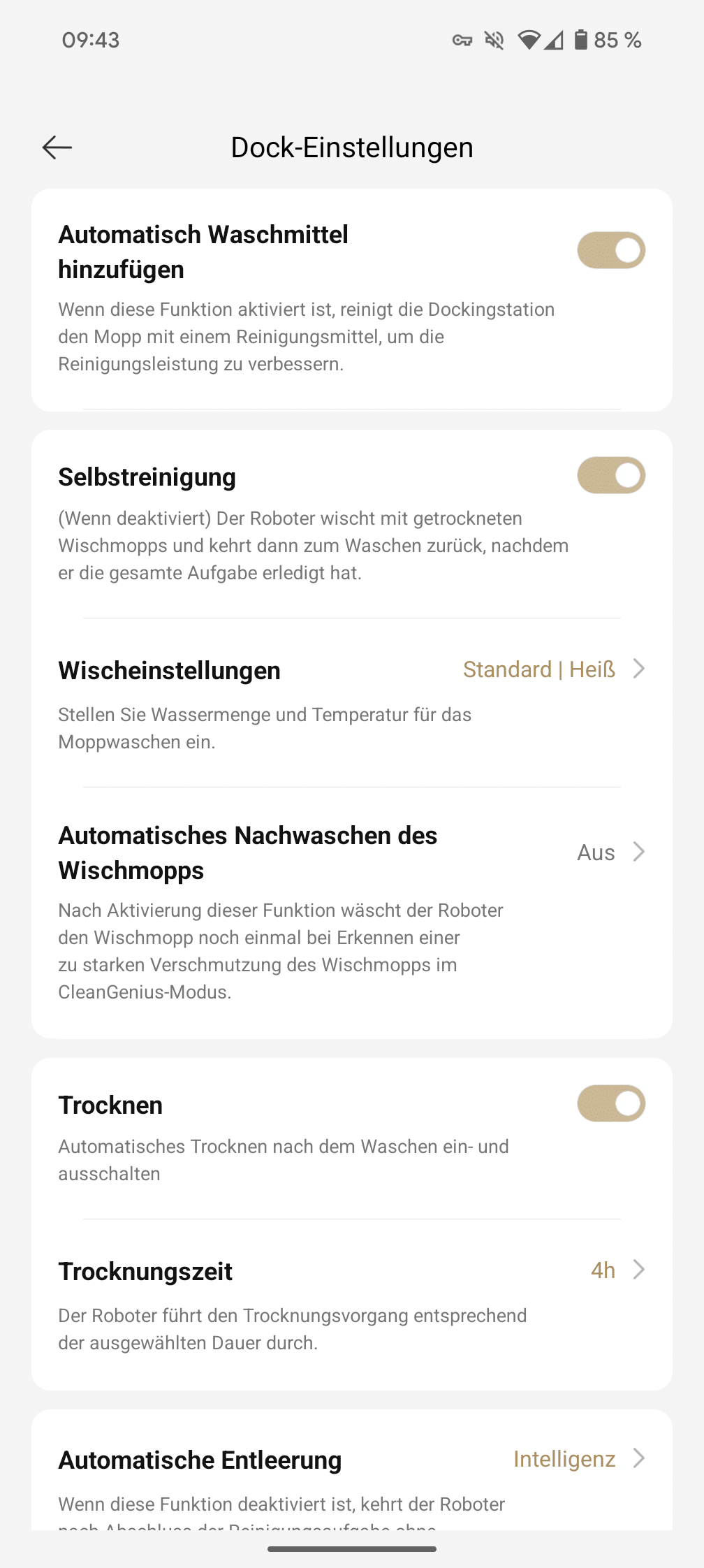 Particularly practical: CleanGenius mode does the thinking for you and automatically adapts the cleaning to each room. If you want more control, you can choose between 4 suction levels and 30 water flow rates – very detailed.