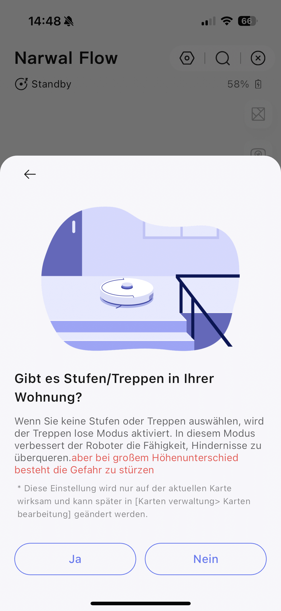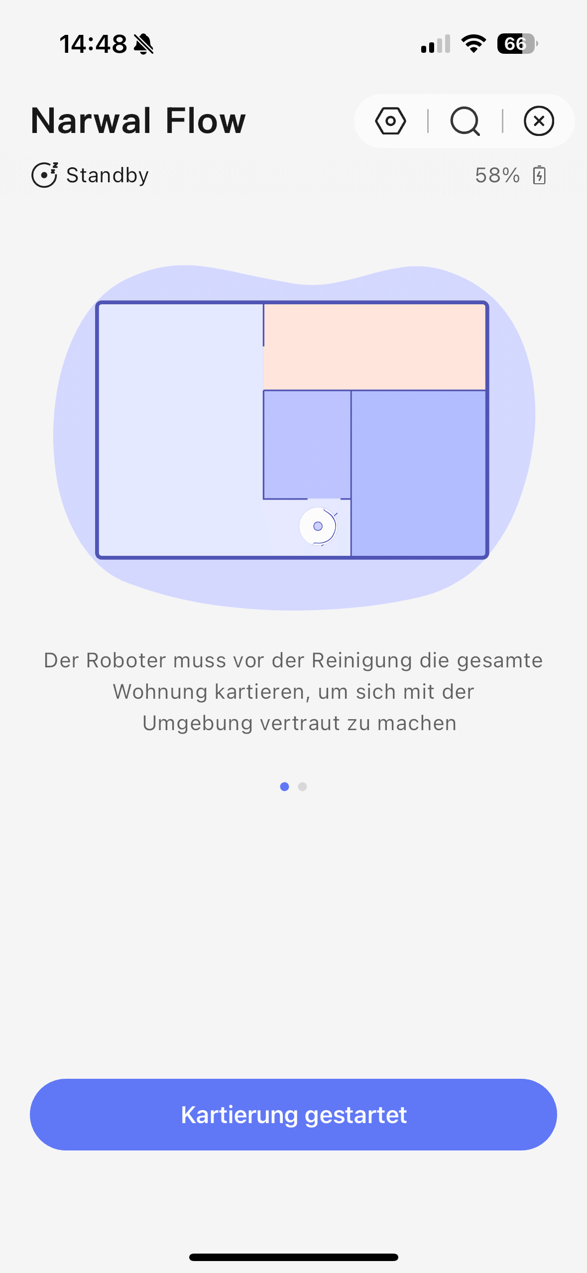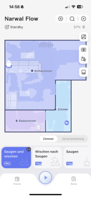 Before you let off steam in the numerous setting options here, you should first carry out a quick mapping. This is done in just a few minutes, as the narwhal does not yet clean, but simply creates a floor plan of your home. It will then automatically assign different rooms. If its calculations are not correct, you can easily make adjustments. The Narwhal Flow is now fully operational.