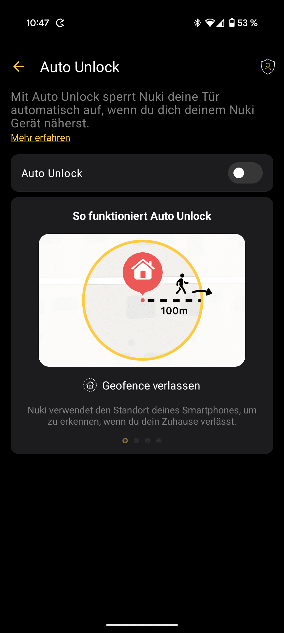 The latter is particularly interesting: Auto (Un)Lock automatically locks the door as soon as you move 100 meters away from the door (geofence) or opens it as soon as you get close to the smart door – thanks to the Bluetooth connection.