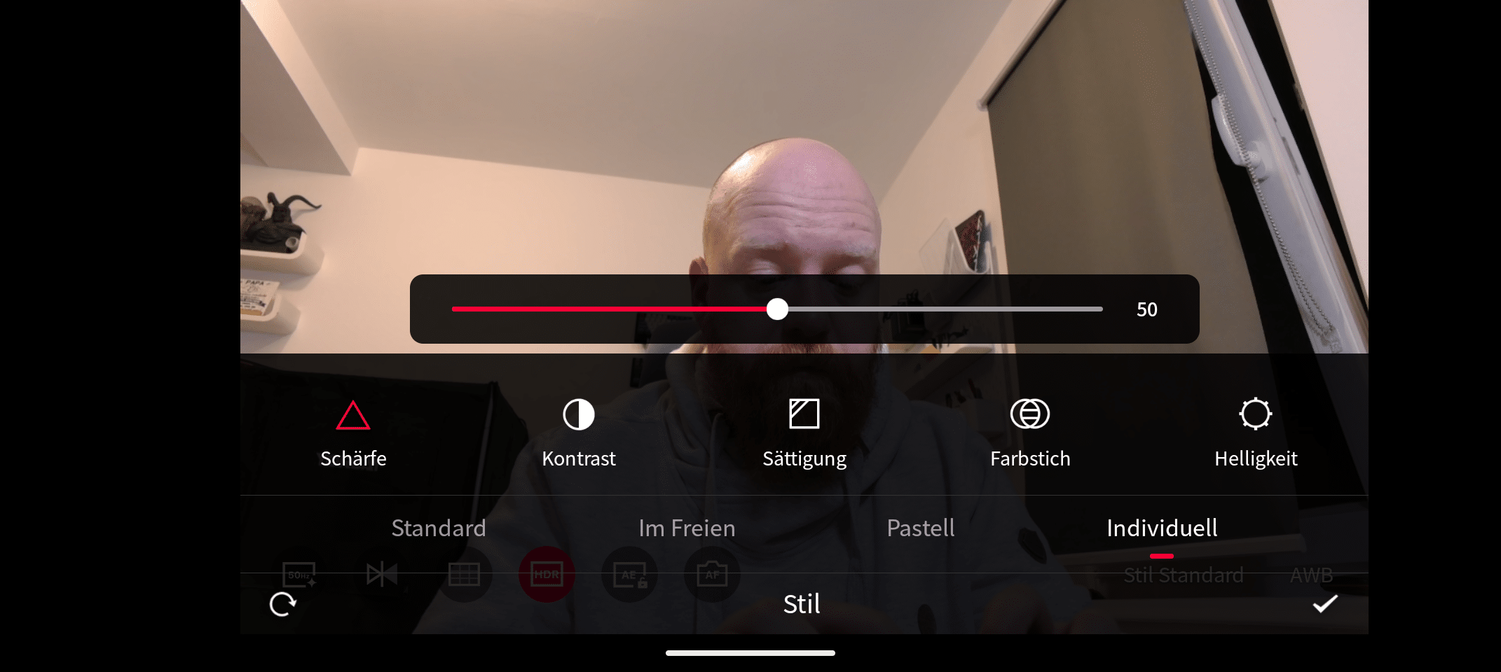 Of course, there are also professional settings to influence the image. For example, the ISO range can be adjusted between 100 and 6,400, with exposure corrections of +/-3EV possible. The white balance can be set manually between 2000K and 10000K. The shutter speed can be set between 1/8000s and the limit of frames per second (i.e. 60 fps or up to 120 fps slow motion).