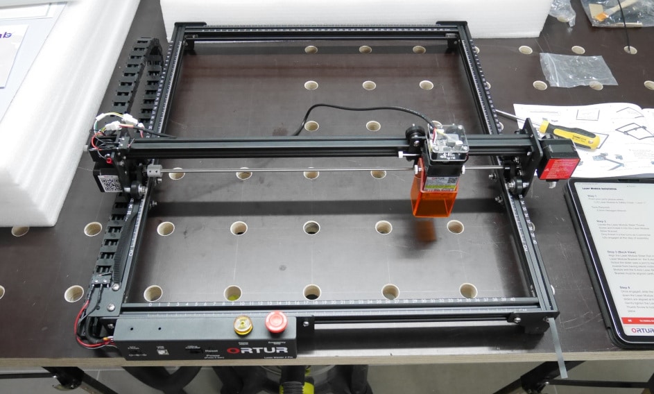 Both the material and workmanship look very high quality. We are not dealing with typical “Chinaware” here. All mechanically stressed parts, such as the frame and the guide rails of the laser, are made of a solid aluminum profile, which is reinforced by additional angle internal connections. Acrylic and plastic parts are not used by Ortur. The overall impression is therefore excellent.