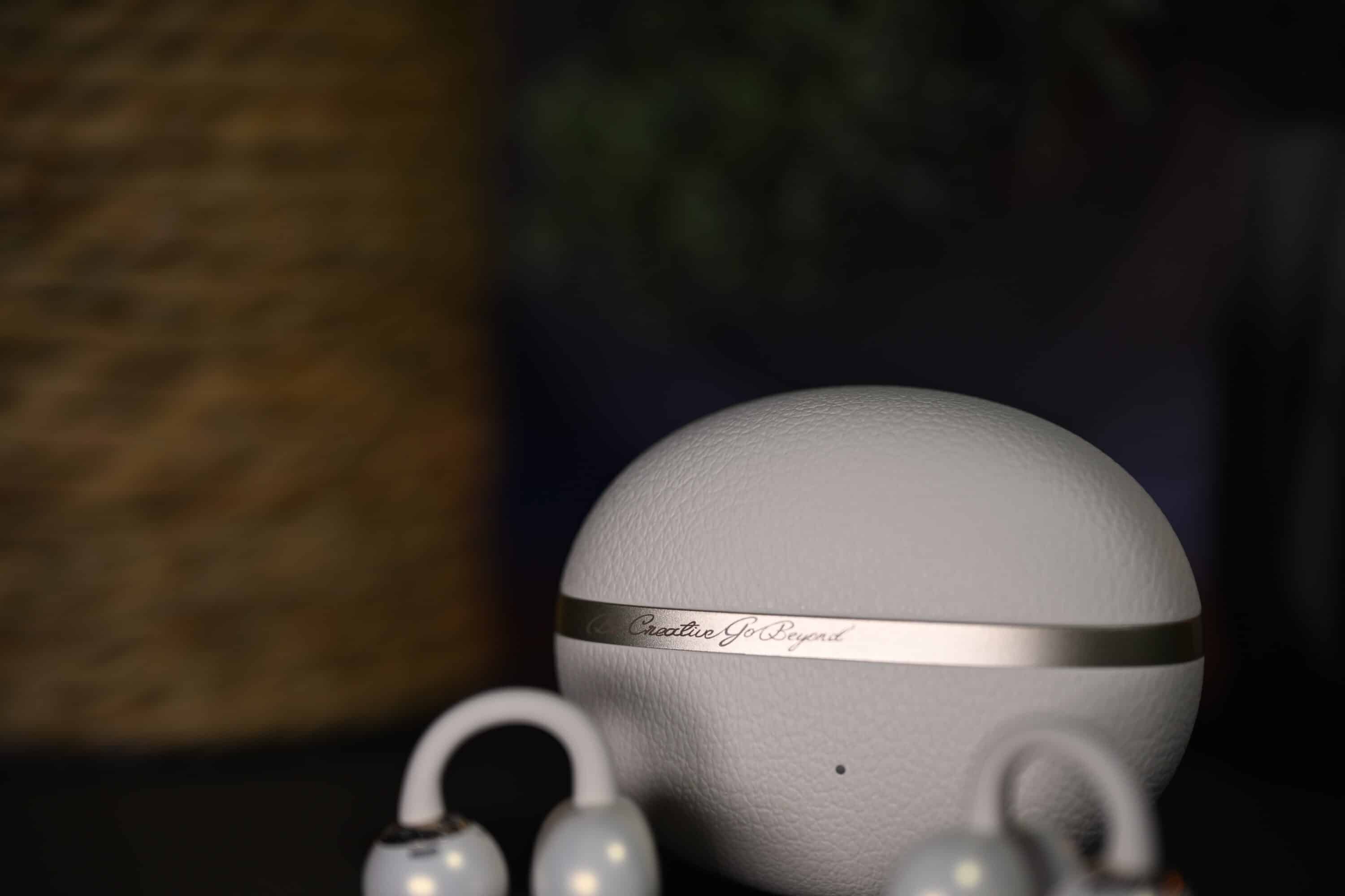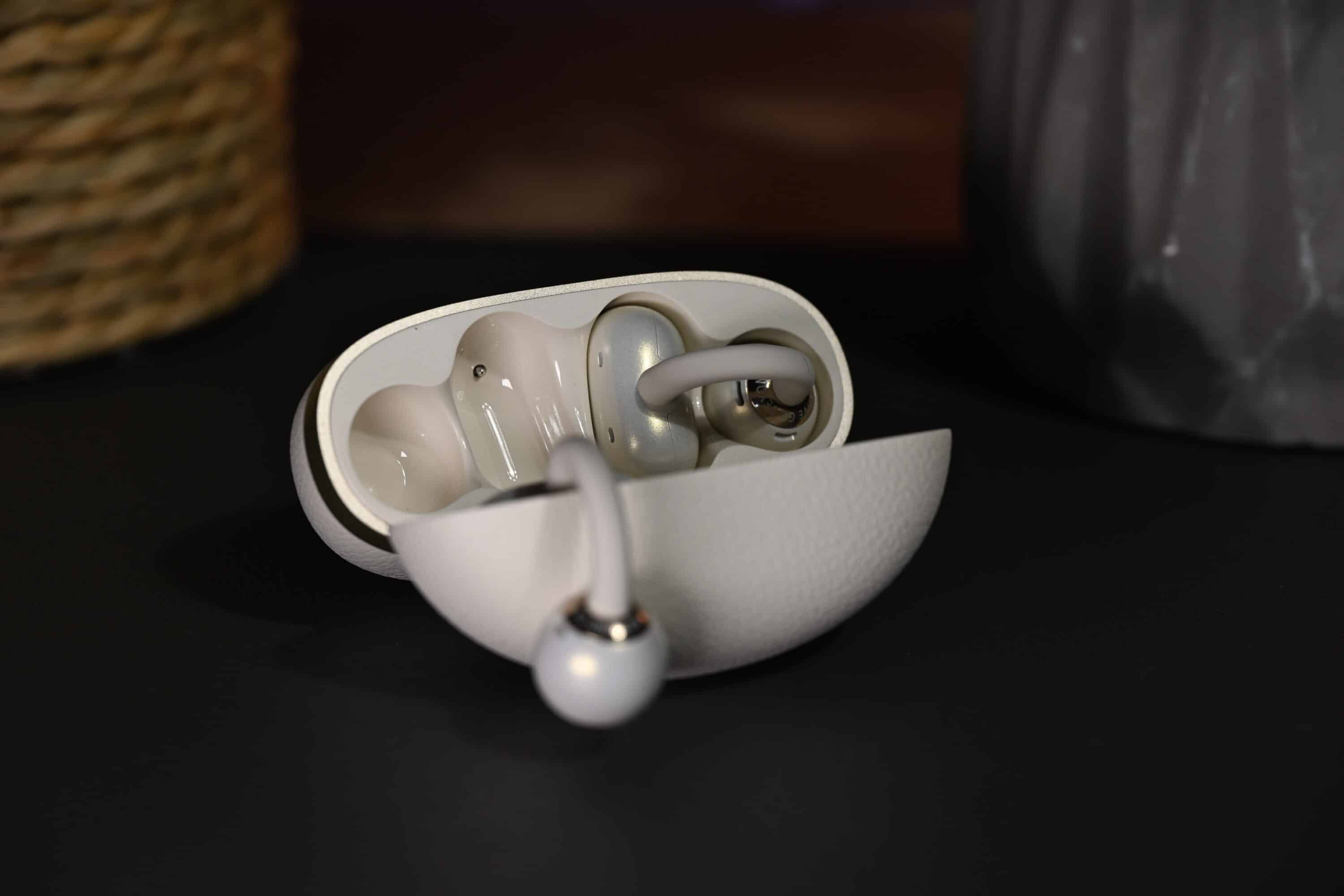 They therefore offer a high level of comfort, especially during long listening sessions, and are particularly suitable for users who find traditional in-ears uncomfortable or who value the perception of their surroundings during sport. The case is compact, extremely lightweight and covered with a matt synthetic leather texture, which not only looks stylish but also minimizes everyday scratches and fingerprints.