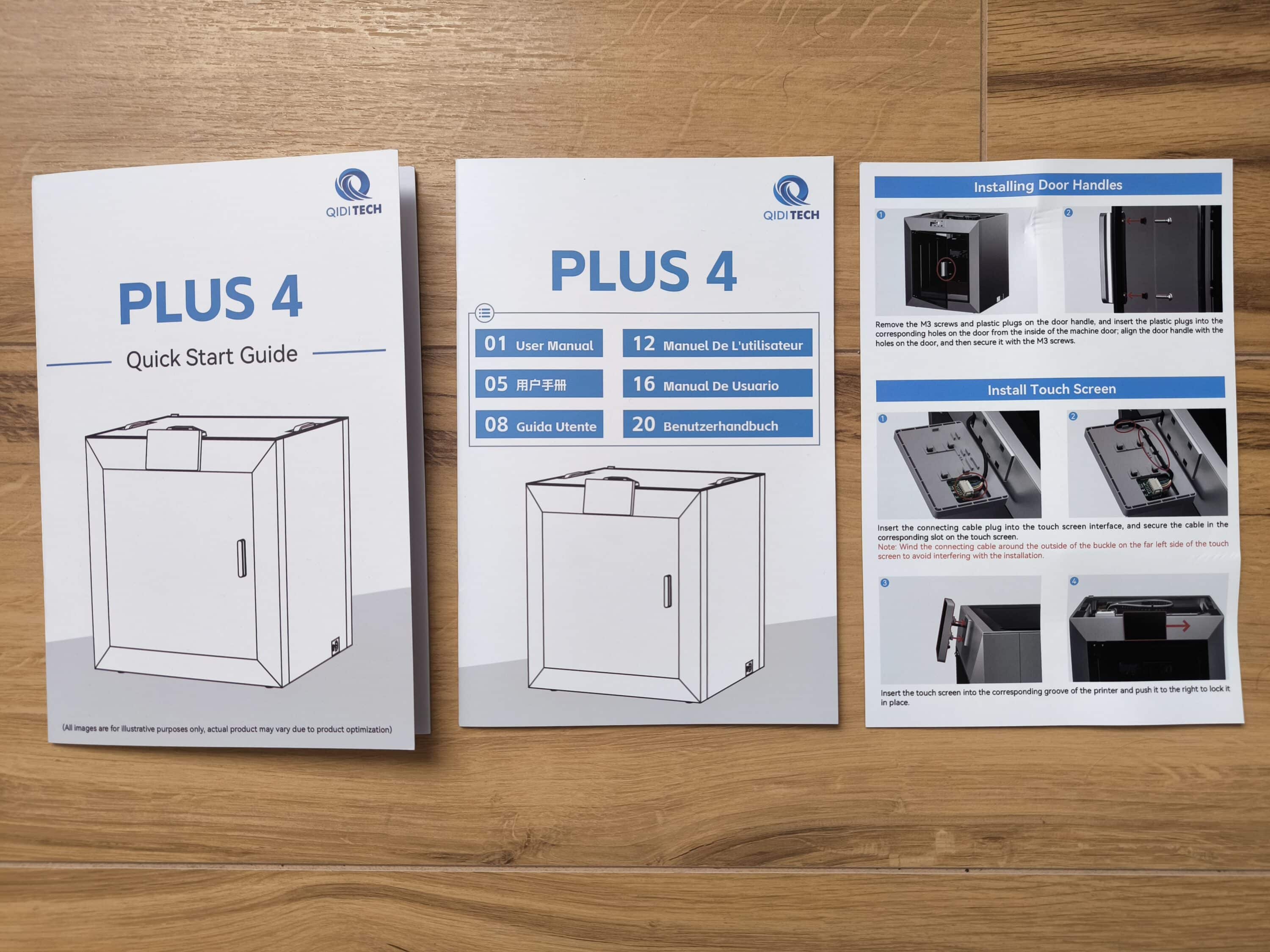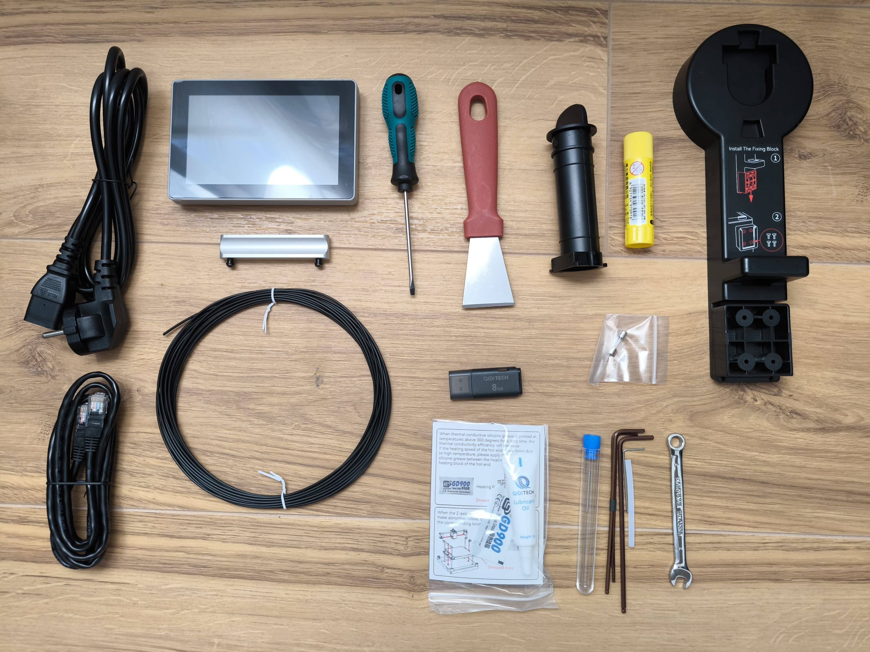 In addition to the 3D printer itself, the scope of delivery also includes various accessories. In addition to the power supply unit and Ethernet cable, this also includes tools in various sizes, a USB stick, glue and various spare parts. The screen, the door knob and the filament holder are included separately and must first be mounted on the QIDI TECH Plus4.
