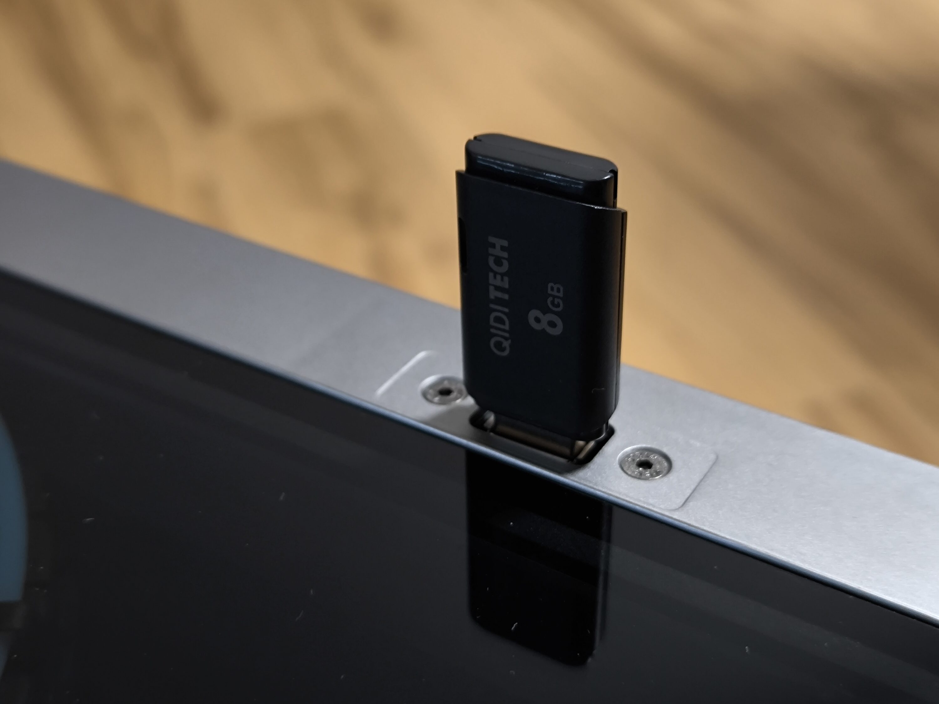 The QIDI TECH Plus4 can be accessed either via WLAN, Ethernet or the old-fashioned way via a USB stick. For the latter two cases, an Ethernet cable and an 8 GB USB stick are included, on which some test models are already pre-installed. Regardless of the selected operating mode, the current printing process is shown on the 5-inch display on the front. The screen with touchscreen and a resolution of 800 x 480 pixels responds appropriately to inputs, but sometimes swallows light touches.