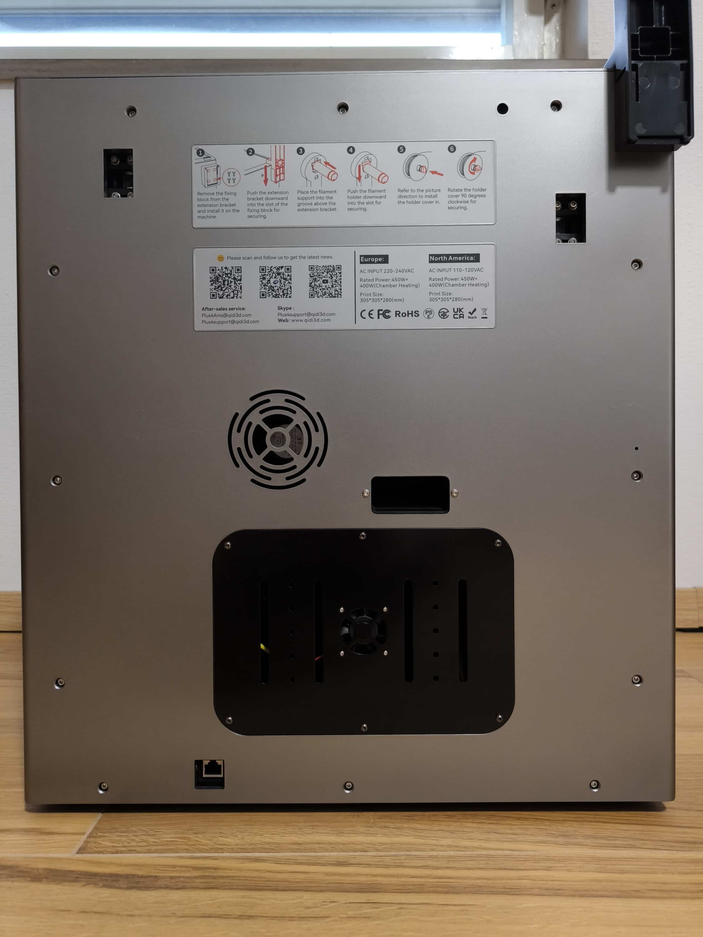 PLA is supplied via the filament holder, which is located on the back of the lid. This is also where the USB port is located if you want to use any print samples in this way. If you now turn the QIDI TECH Plus4 by 180 degrees, you will find both the Ethernet port and the filament ejection chute on the back. Only the power switch and the power connection are located on the right-hand side.