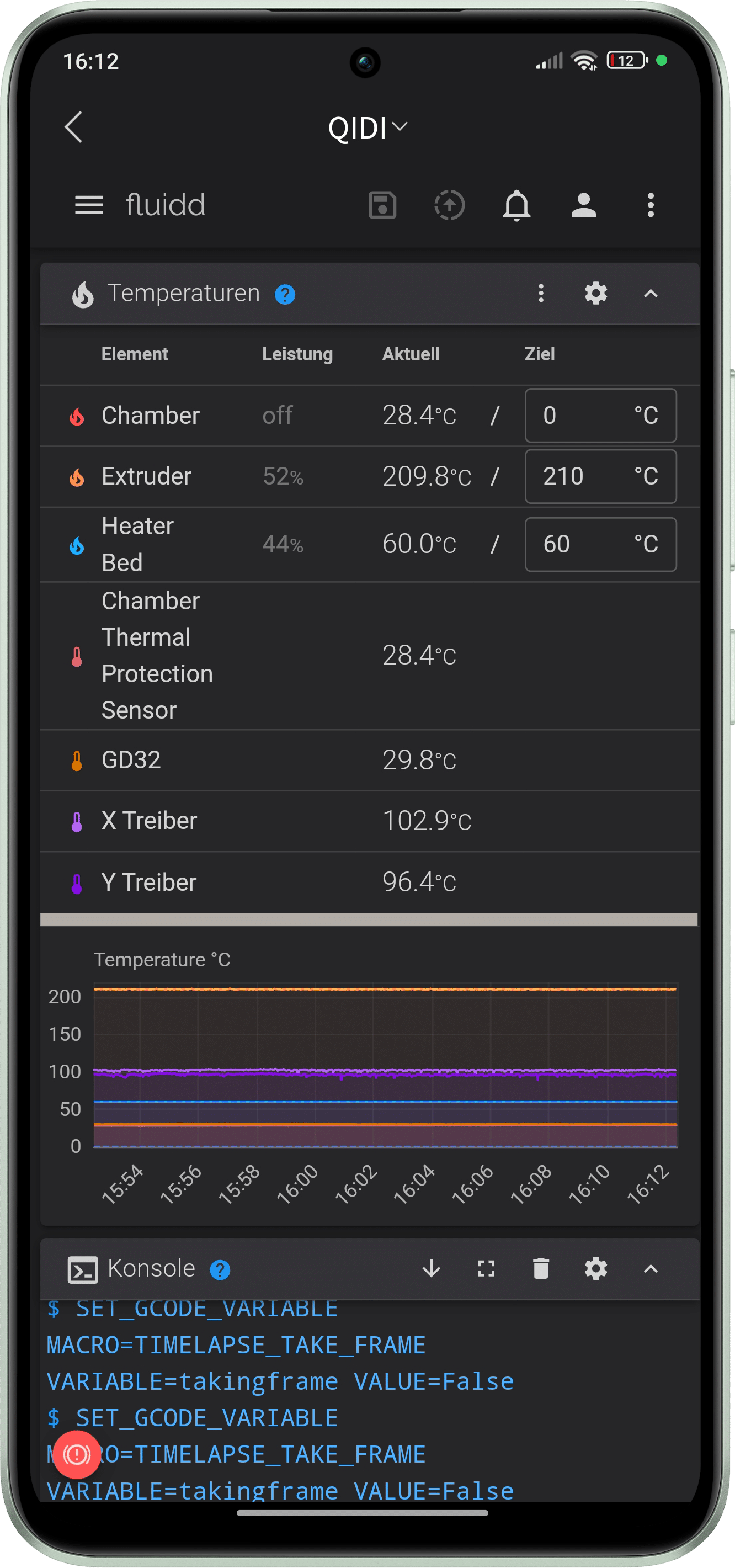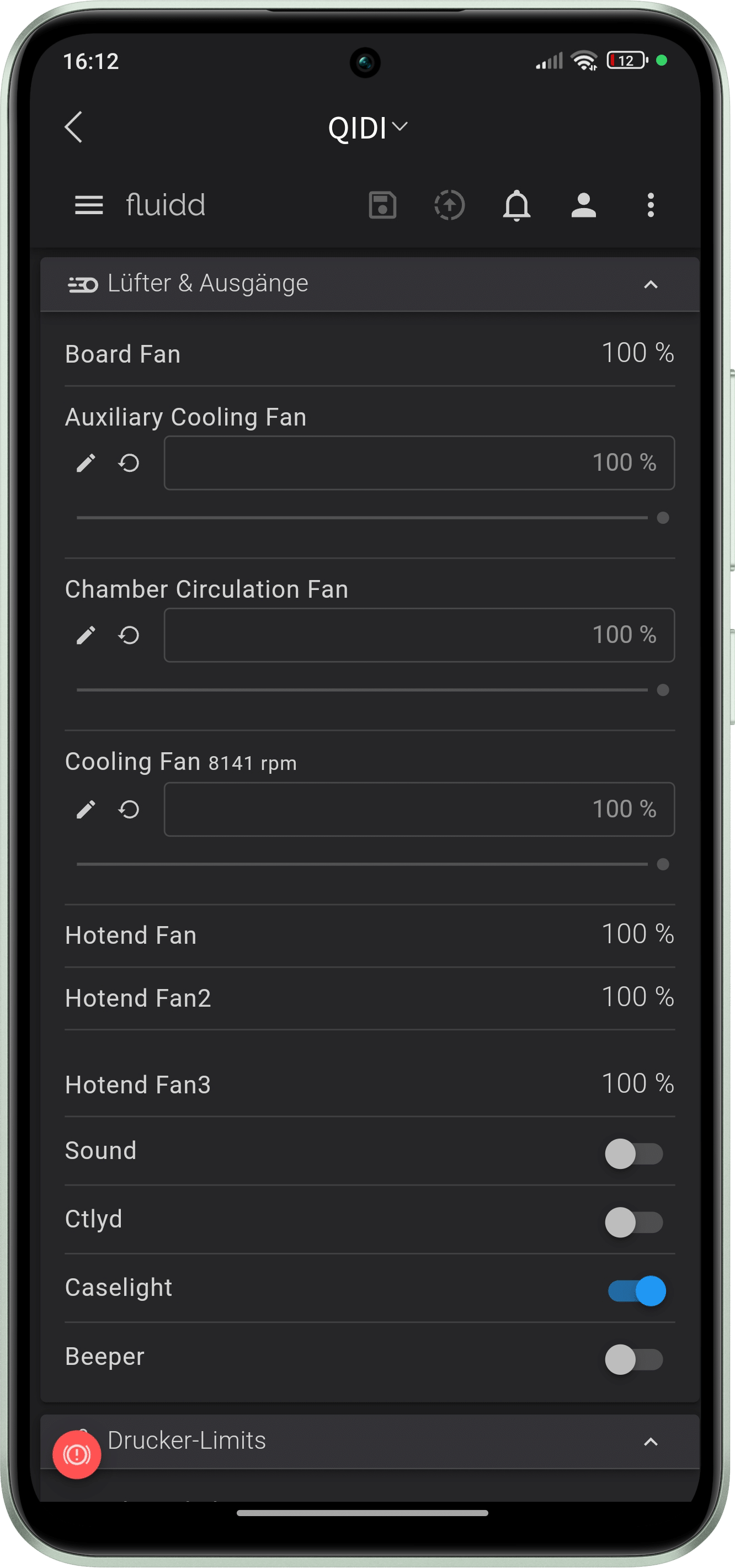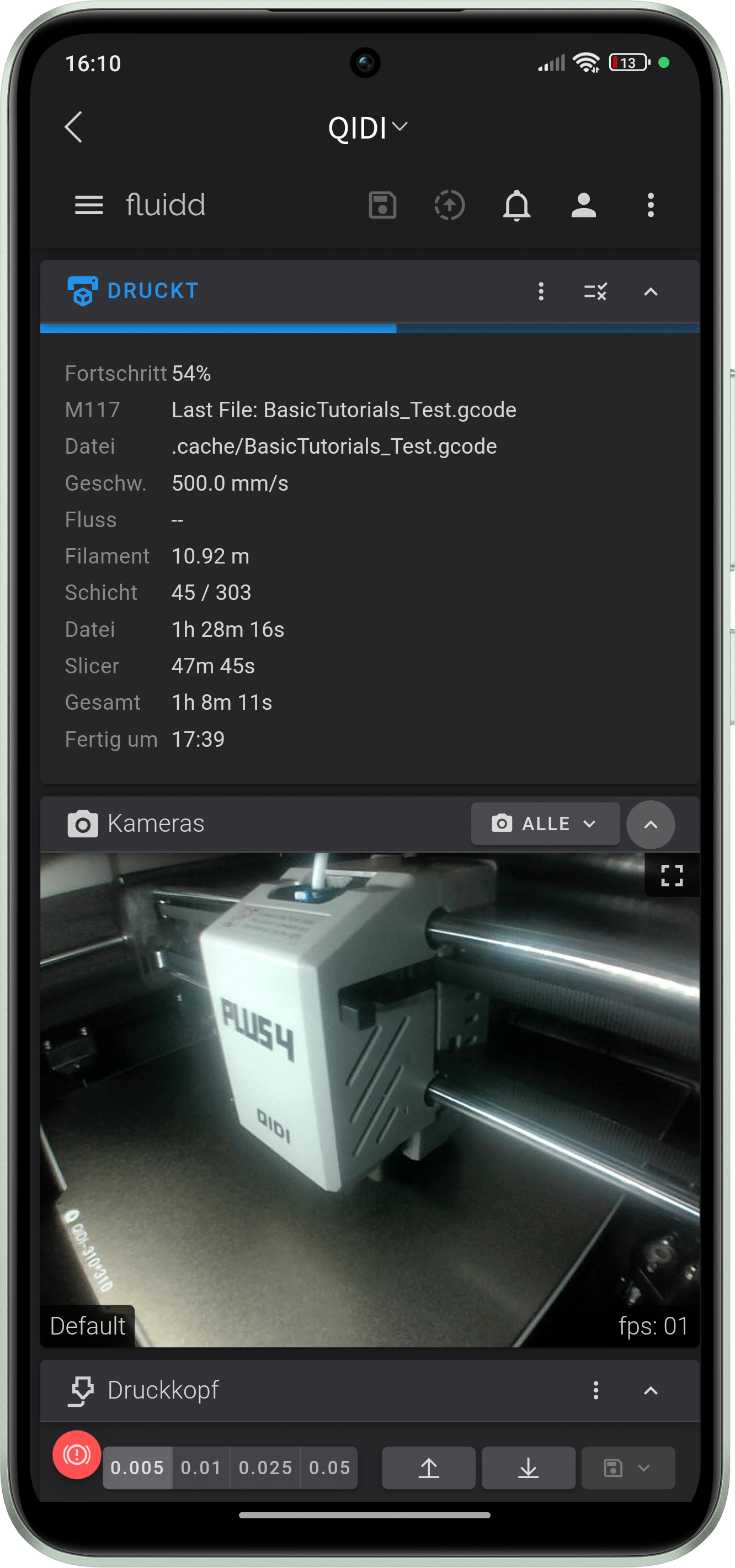 As the 3D printer has a camera inside, the app also displays the print status in real time. Although the frame rates are not quite as smooth as with the QIDI Studio PC software, they are perfectly adequate for simple tracking. Other QIDI Link functions include the display of print parameters such as temperature, progress or estimated print duration. If required, it is possible to adjust individual print parameters, control fans or start, pause or even stop print processes.