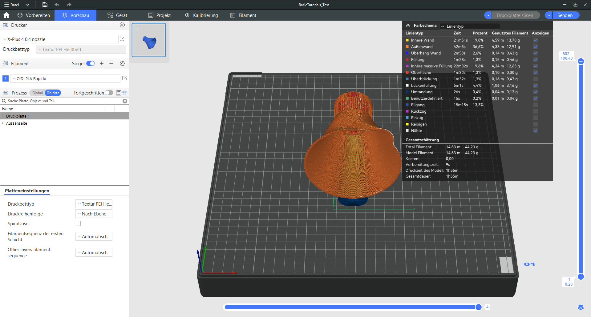 After adding your own printer model and specifying the filament, the first print job can be triggered. The default settings recommended by QIDI TECH are already loaded from the printer profile and deliver decent quality right from the start. Of course, none of these values are set in stone and can be adjusted depending on the type of filament and your own preferences.