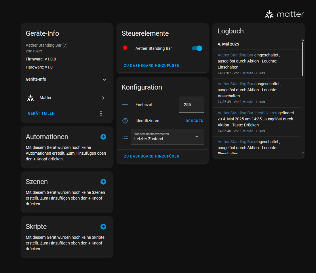 If you want to use your own systems, you can also integrate the RGB cylinders into Home Assistant, for example. To integrate the Aether Standing Light Bars, simply use Matter, just like in the Razer app. The whole thing is advantageous if you use an external power supply unit for the power supply. You can use Home Assistant or other smart home systems to switch the RGB lights via various automations and react to events or conditions.