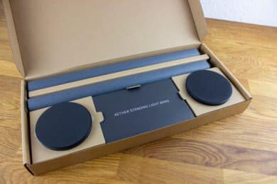 The box contains the two light strips and two stands. Everything is neatly packed to avoid scratches. There is a USB-C plug at the end of the cable for connection to the computer. At half the length of 2 meters, the cable splits. The two light strips are located at the end and the cable is permanently attached.