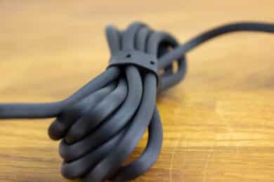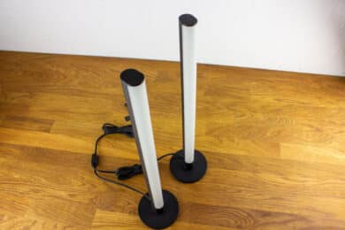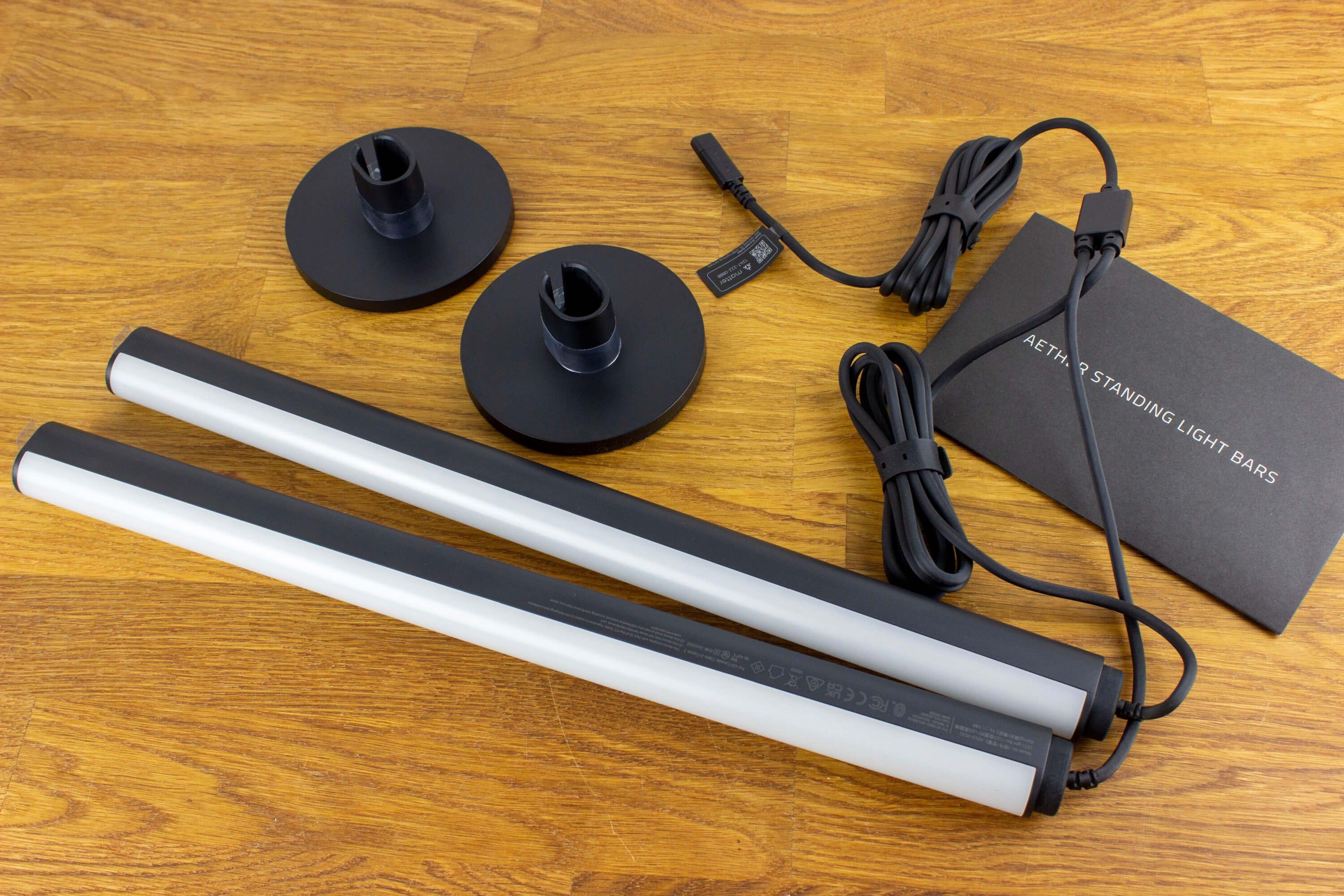 Although the housing is made entirely of plastic, there is nothing to criticize about the workmanship. A little weight would be desirable in the base, as the cylinders wobble a lot when they are bumped or touched. The matt black housing should fit into any setup. We can almost completely dispense with complex cable management, as the Aether Standing Lights Bars manage with a single cable. It only splits in half.