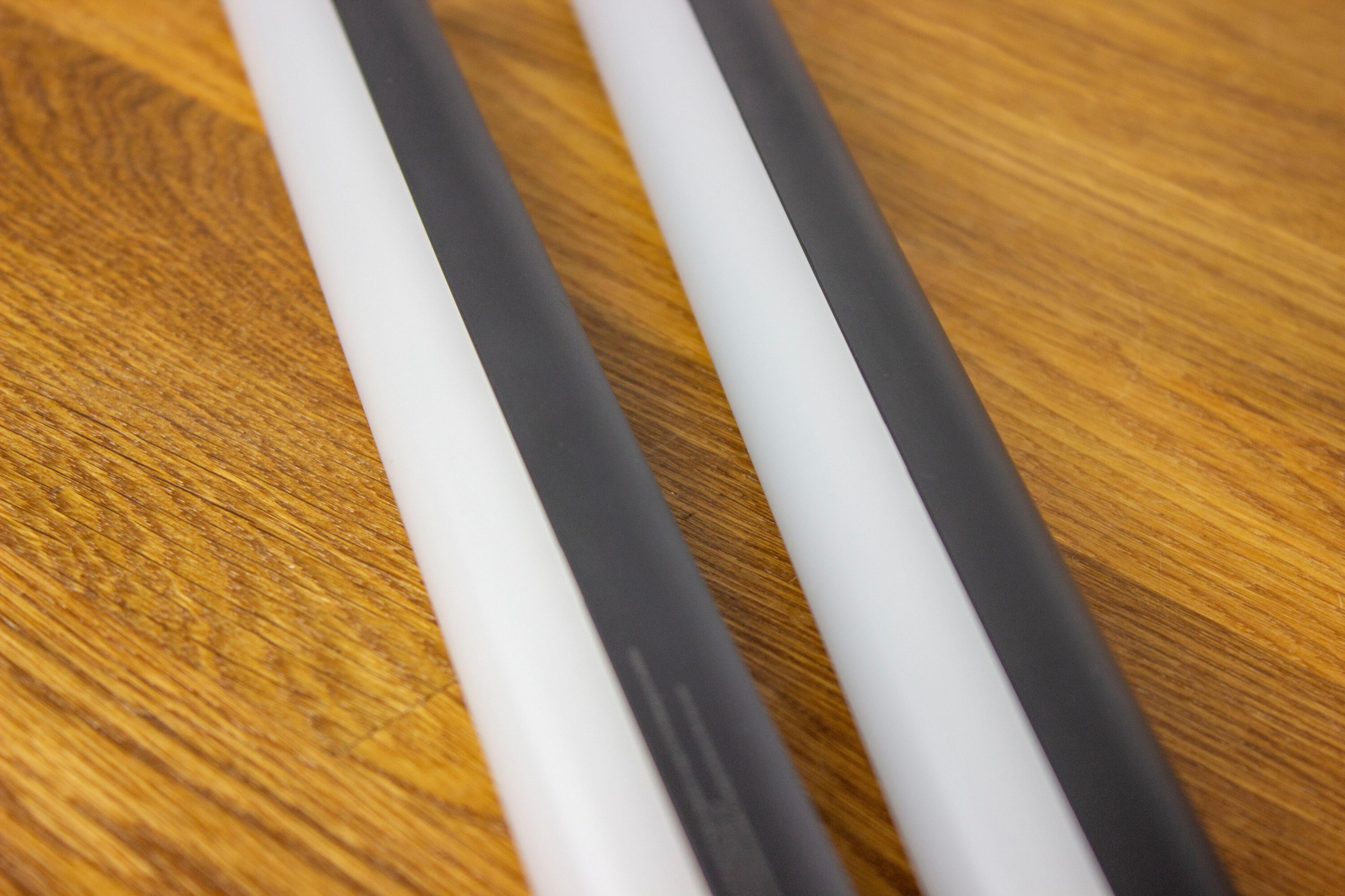 The product consists of two cylinders in black. On one side we find a continuous RGB strip behind milky plastic, which makes the light appear diffuse.