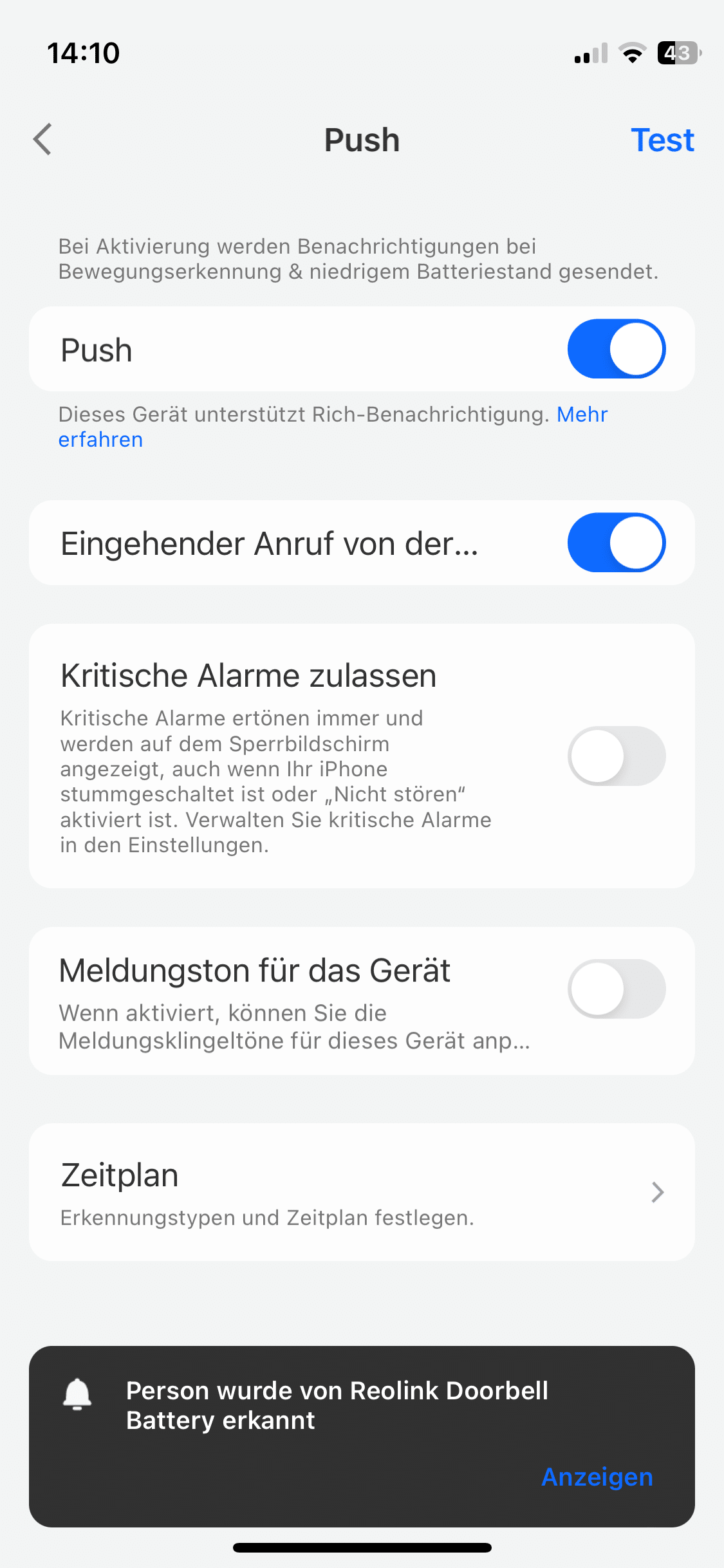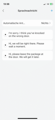 Alternatively, you can also record and play back answers yourself in advance. This is anything but a matter of course and is not supported by the industry leader Ring, for example. The pre-recorded answers can have a maximum length of 10 seconds. However, I noticed that the pre-recorded voice messages suffered from quite poor audio quality. But you could still understand them.