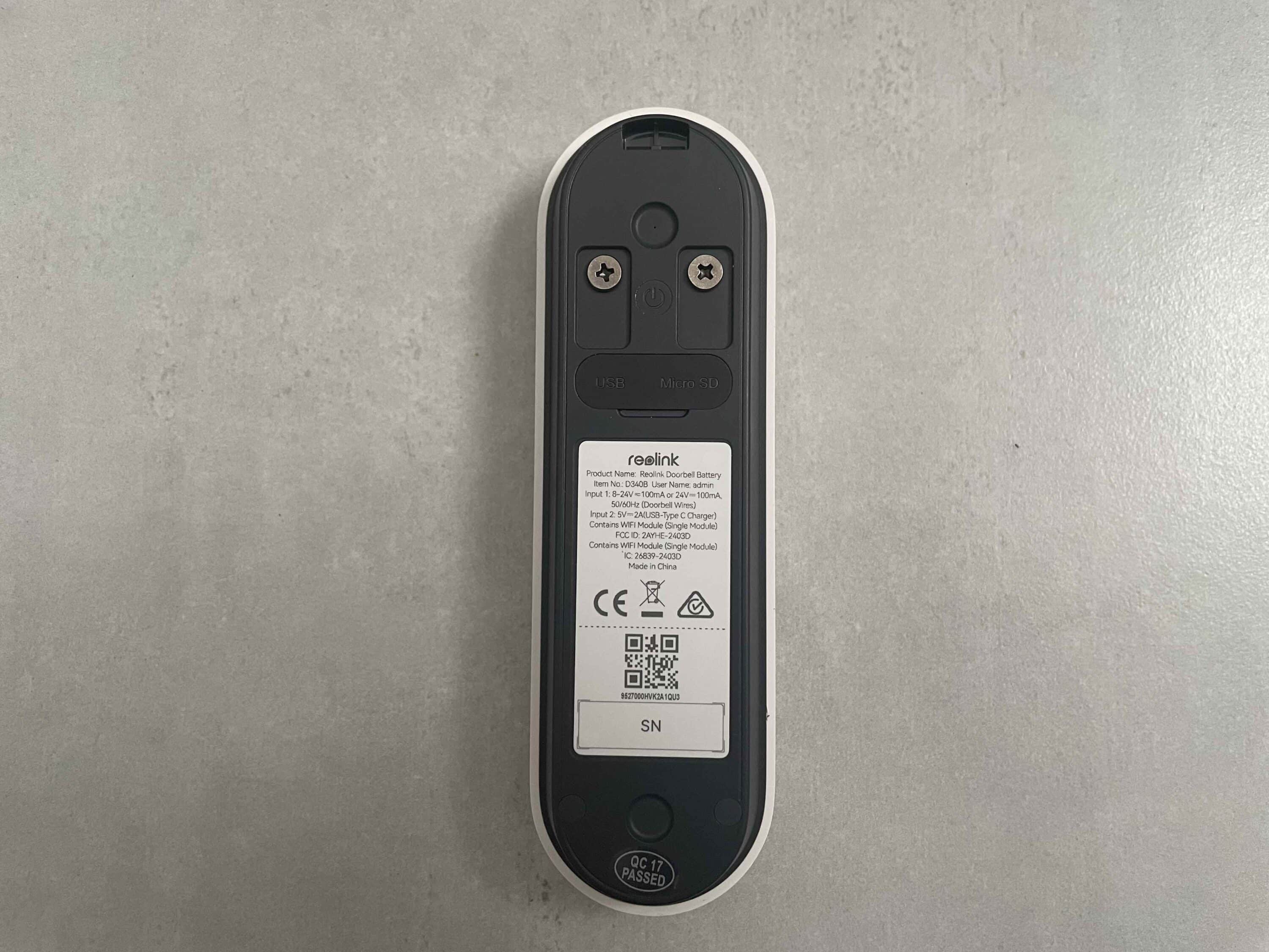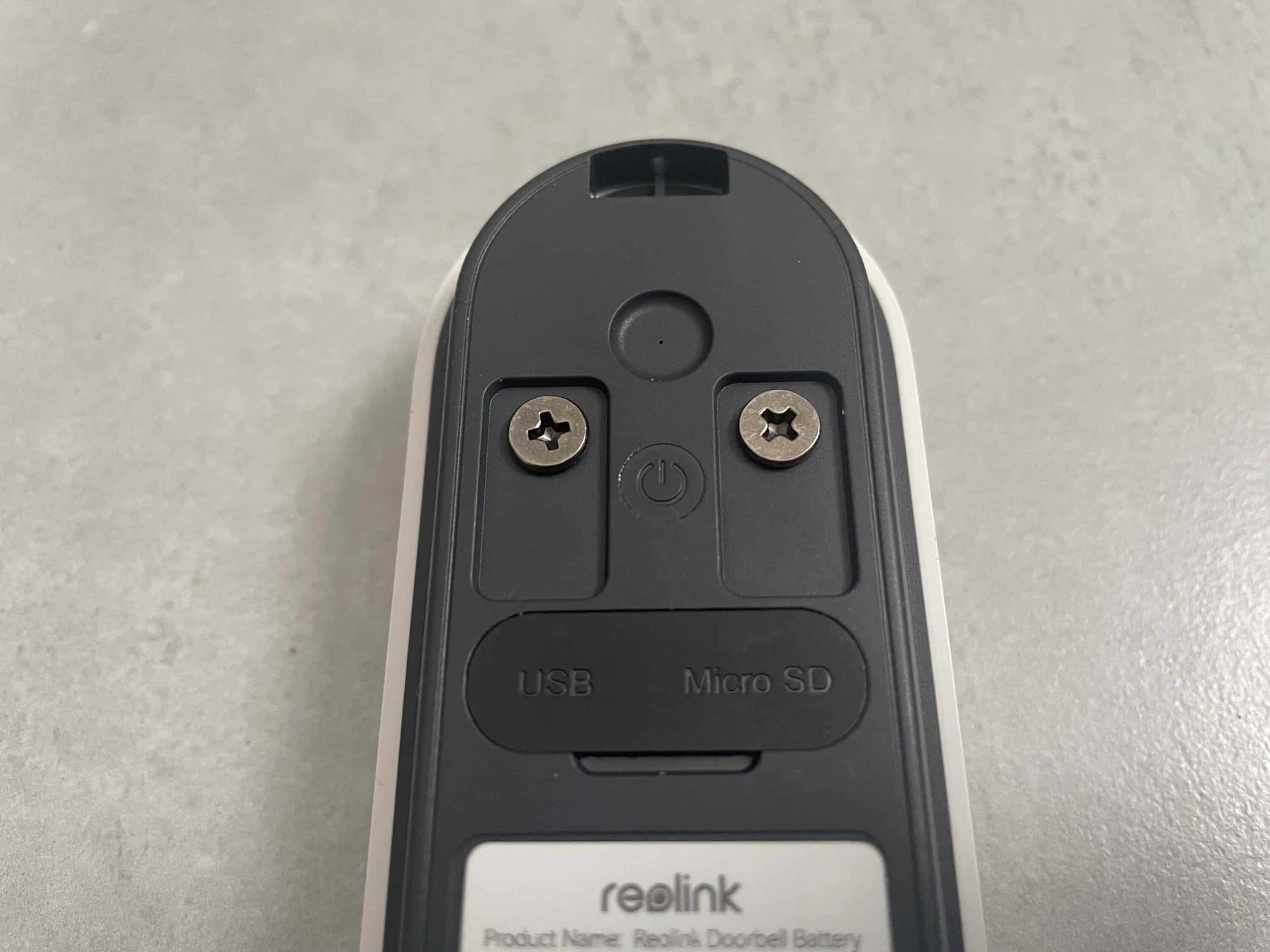 In the center is a company logo that is not too conspicuous. On the back there is an on/off button and the two connections for optional cabling via a fixed connection on the power cable. The USB-C port for charging the battery and the microSD slot for inserting a memory card are also located under a practical rubberized plastic cover. The build quality of the smart video doorbell, which is primarily made of plastic, is of a high standard.