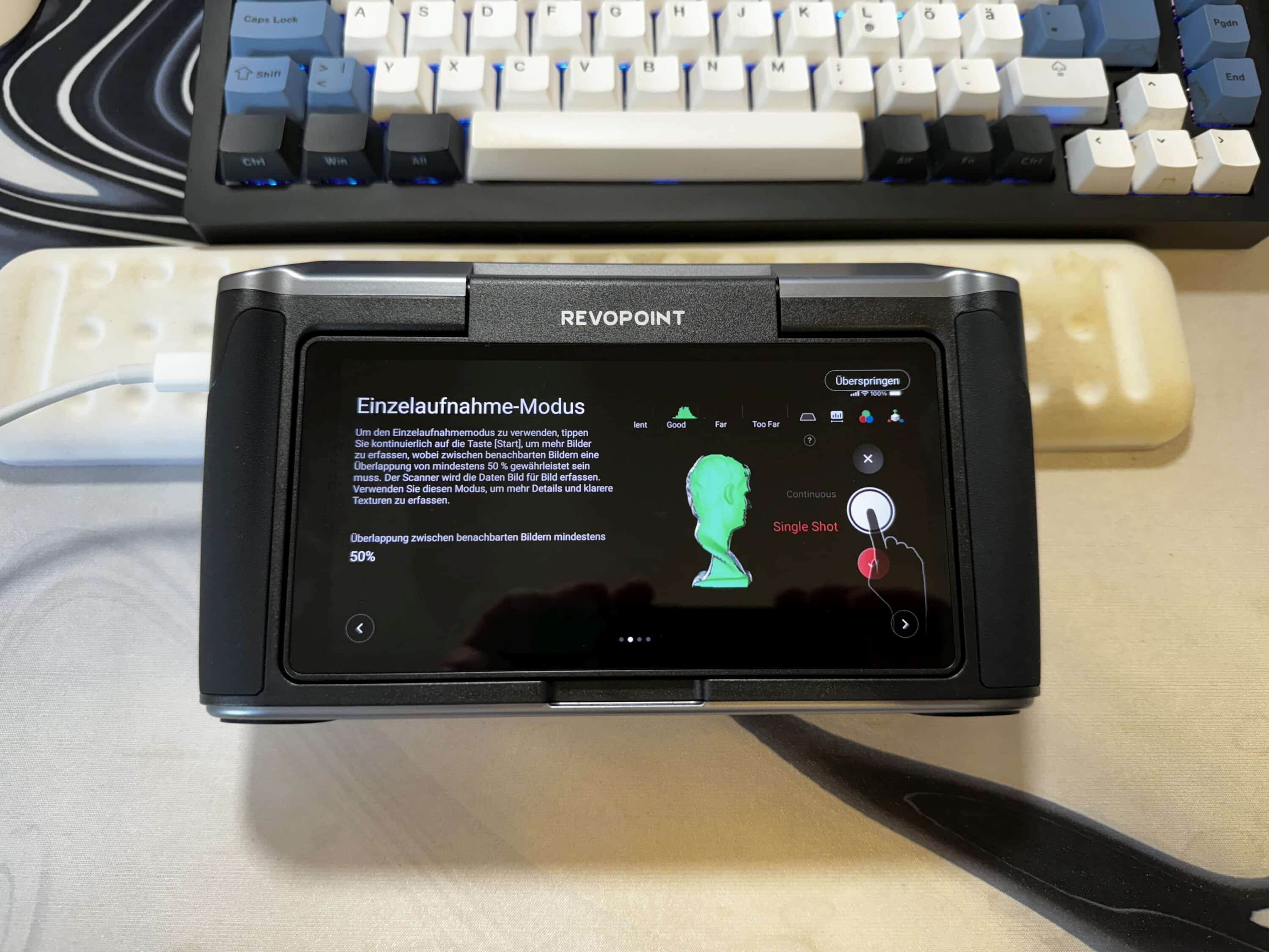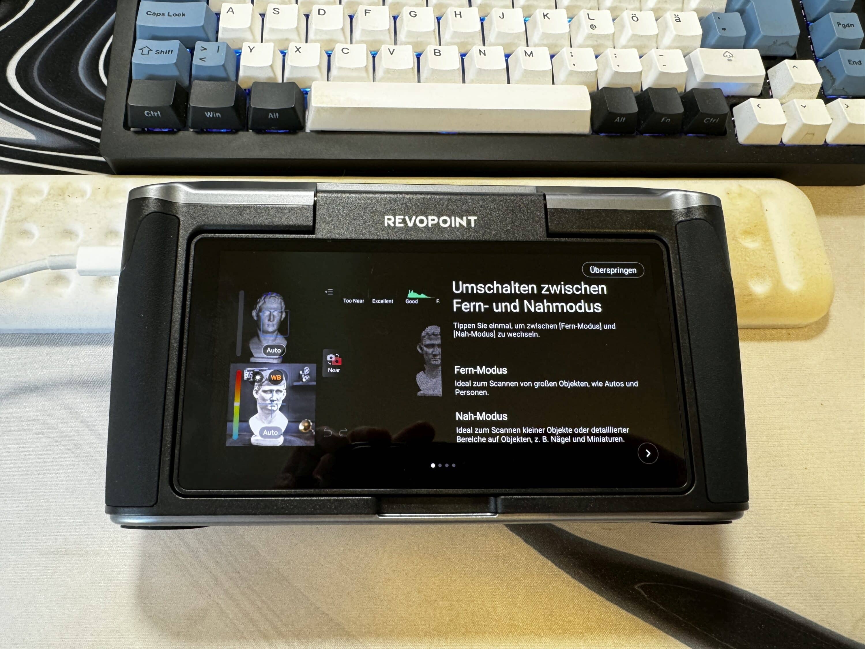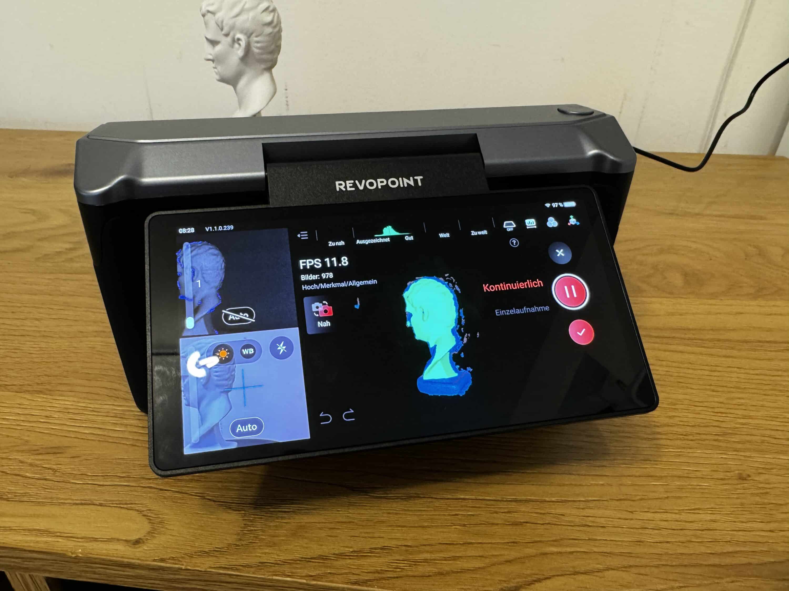 Setting up the Revopoint Miraco is very simple. After switching on, the menu language German can be selected. A connection to the WLAN is then established, which is used to transfer files wirelessly to the PC or notebook. Two or three steps later, you are already in the main menu and you’re ready to go.