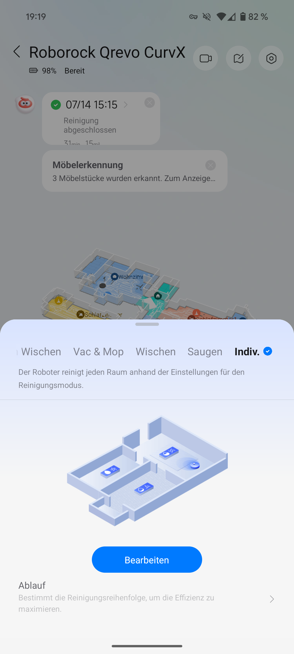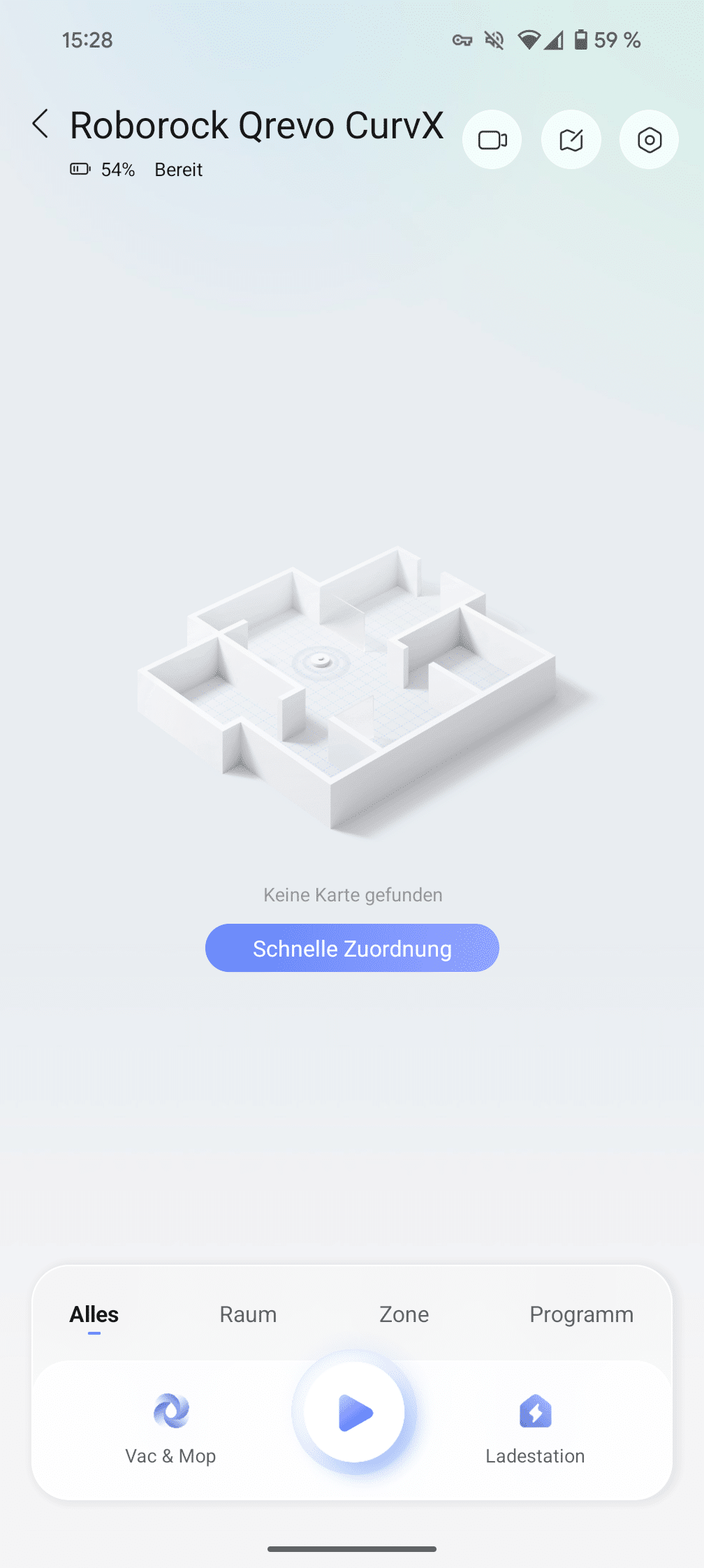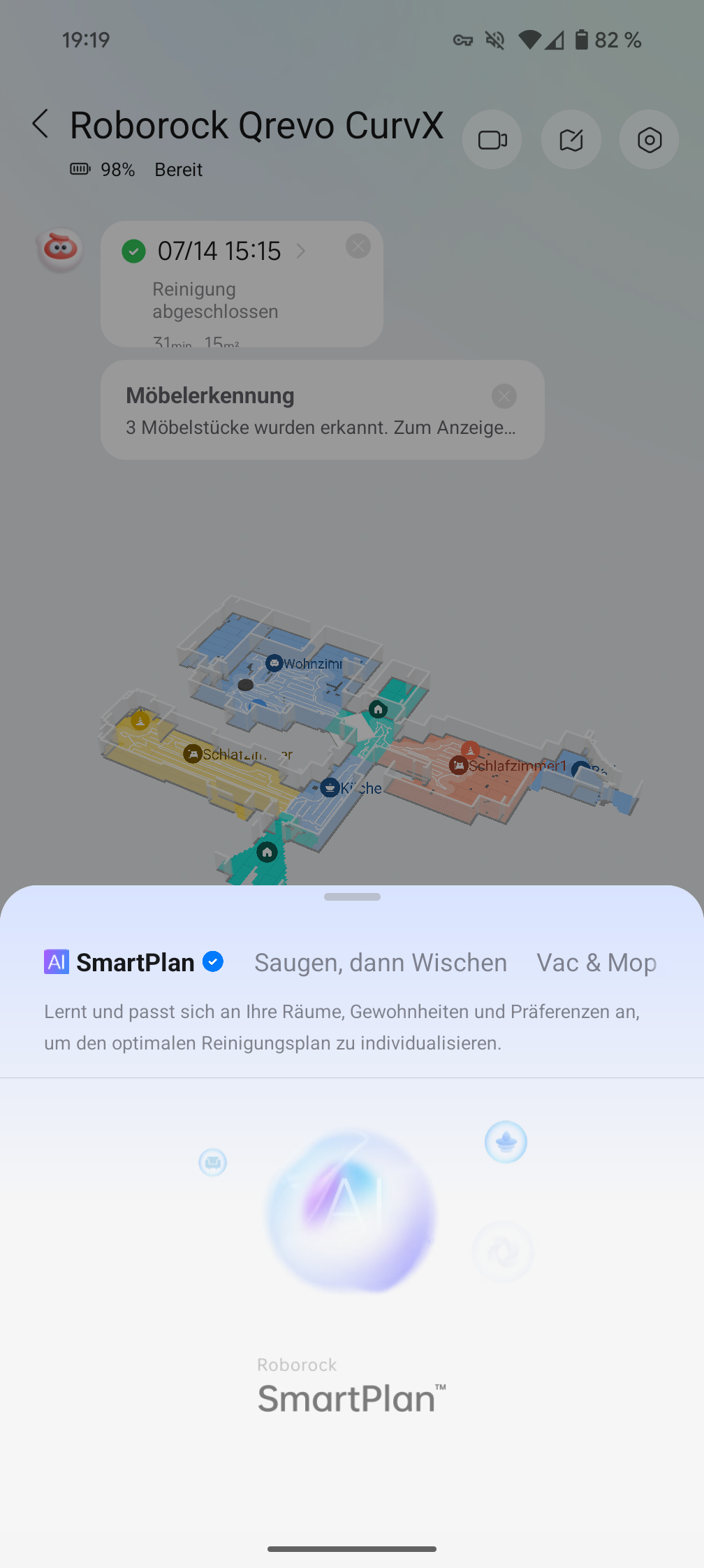 The first mapping run through our test apartment takes around 5 minutes and runs fairly smoothly. The automatic room recognition works quite well – even if not every room is assigned correctly straight away. Overall, Roborock has a very good command of mapping anyway, and there are no major negative surprises with the CurvX either.