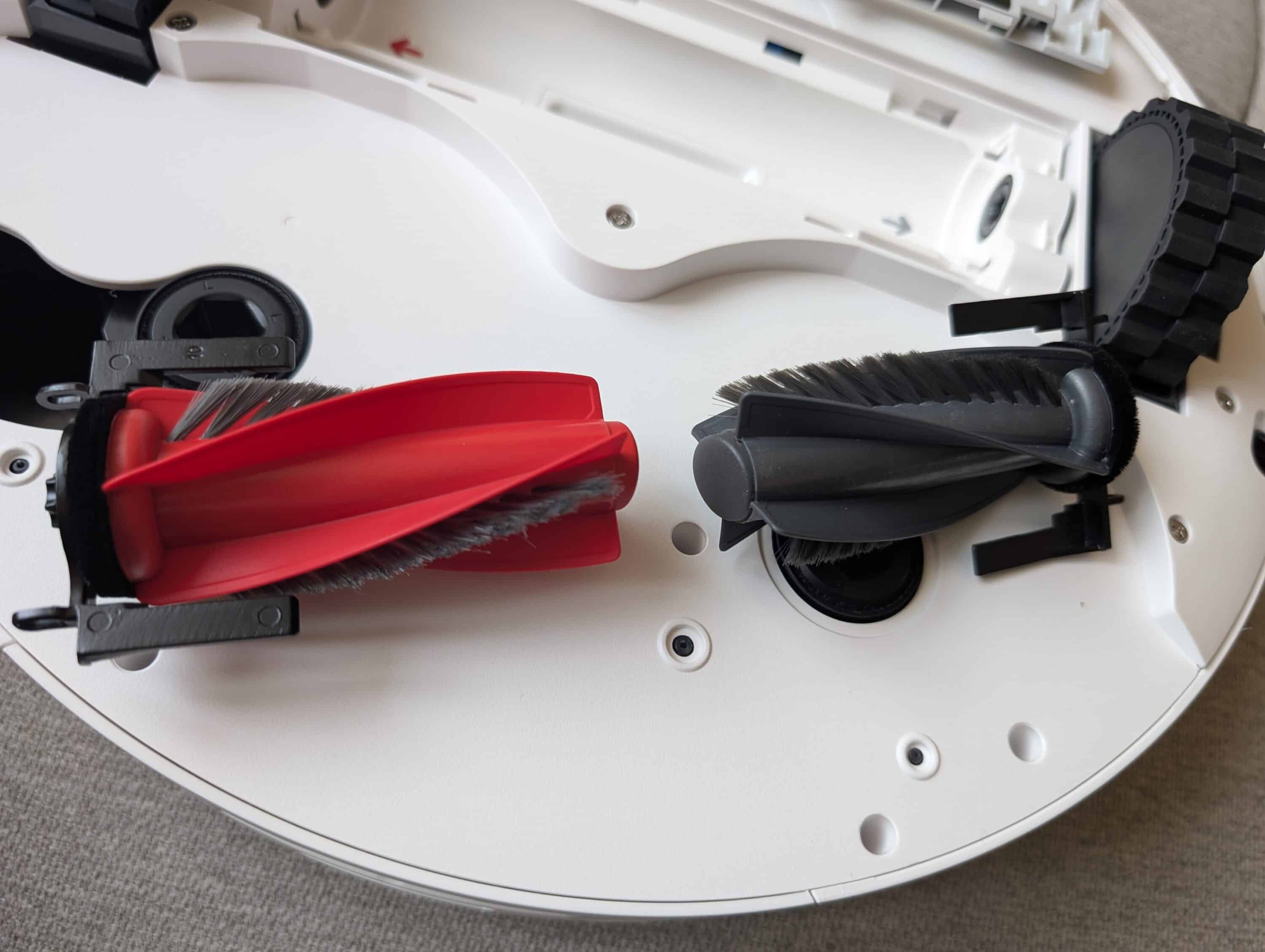 The Dual Anti-Tangle system is perhaps the best practical innovation on the entire Roborock Qrevo CurvX and solves a problem that has annoyed every robot owner with long hair or pets for years, even in the test. The DuoDivide main brush consists of two separate rollers with a gap in the middle – hair can no longer wrap around a continuous brush, but is instead transported through the central gap directly into the suction chute.