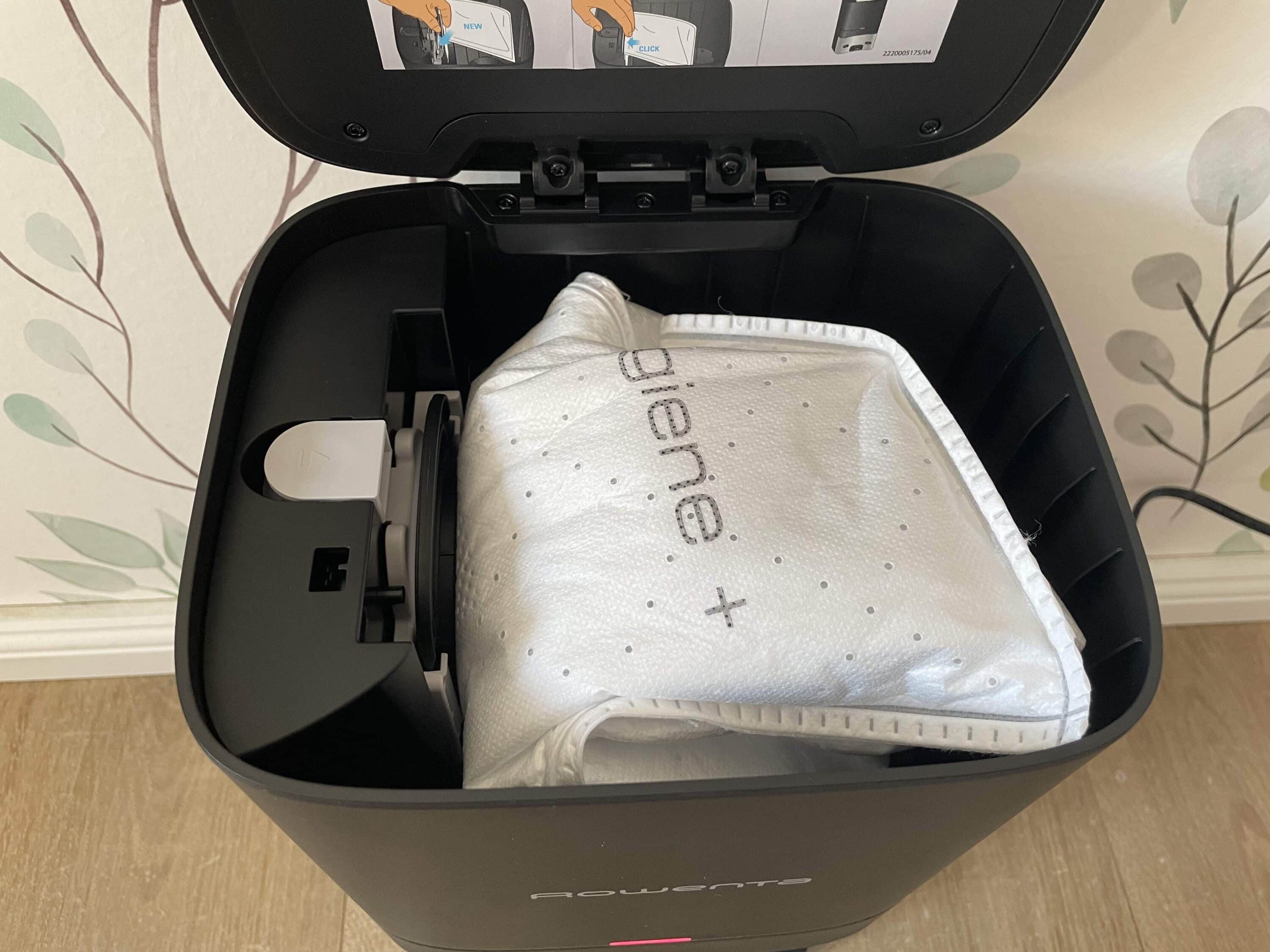 Together with the robot hoover, the cleaning system is 32.5 cm wide, 38 cm high and 51.7 cm deep. In addition to the brand logo, there is a small status LED on the front of the station, which signals processes such as charging the robot. The lid on the top provides access to the dust bag inside. Unfortunately, Rowenta does not use a bagless system either. The closed system may please allergy sufferers, but it inevitably leads to follow-up costs and unnecessary waste.