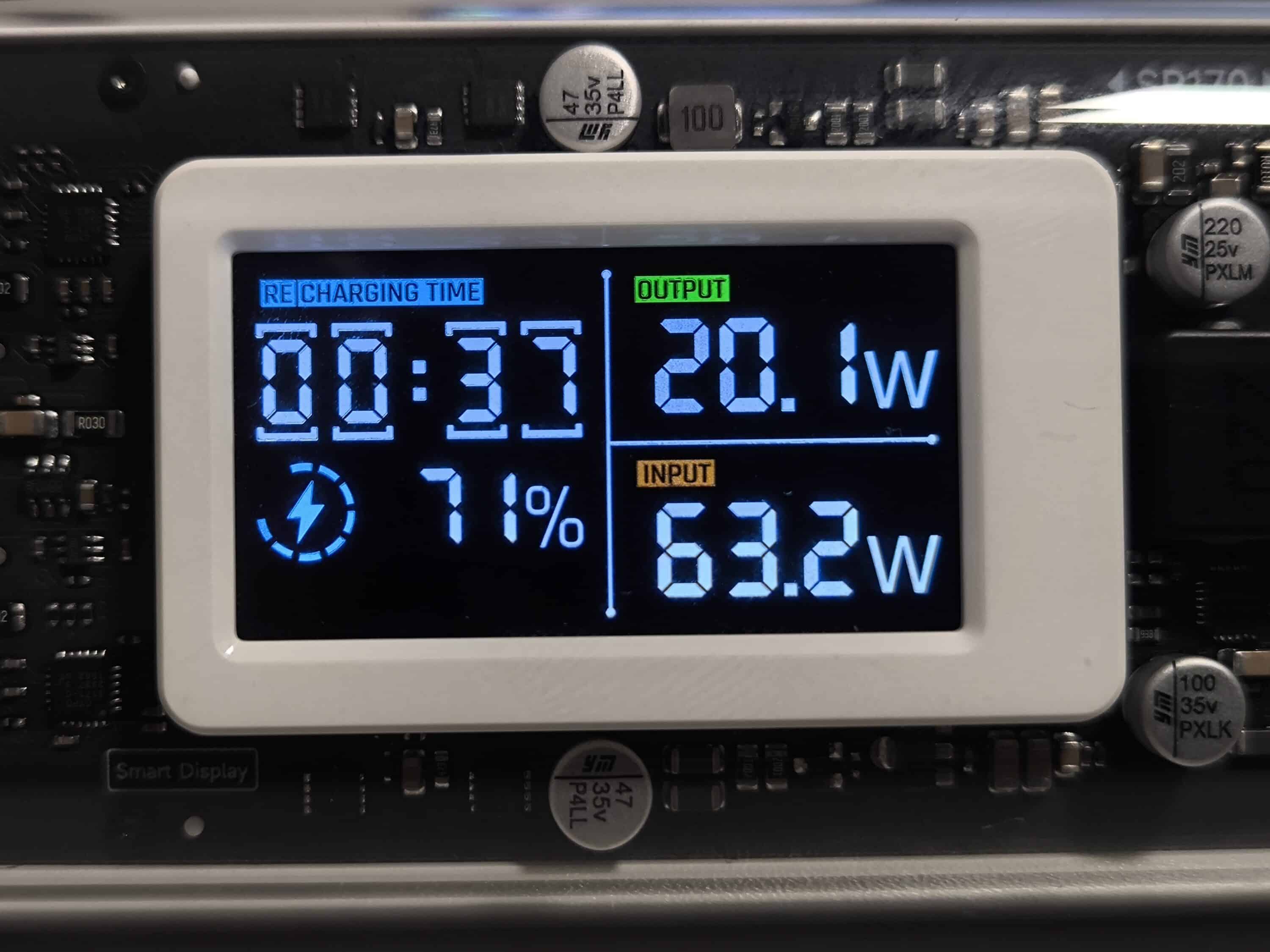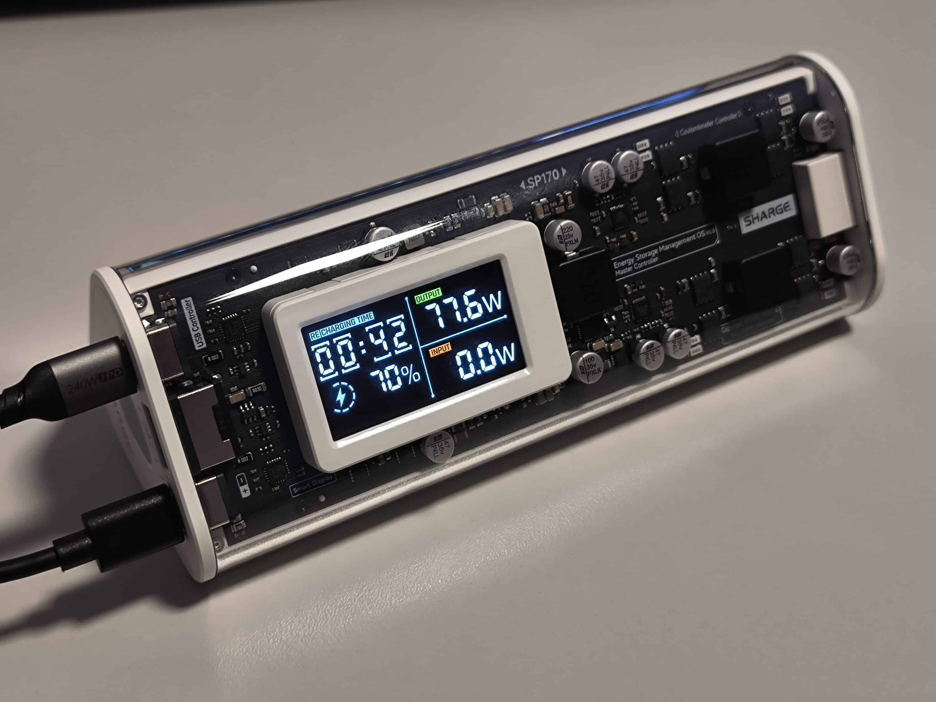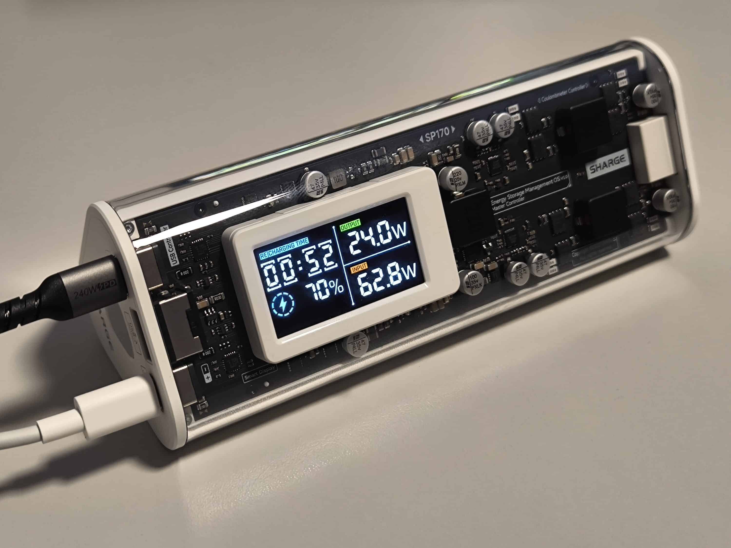 In terms of workmanship, the Shargeek 170 shows its best side and does not make any major blunders. The accuracy of fit of the individual components is flawless and neither sharp edges nor visible gaps appear in the test. In addition, the display of the power bank proves to be extremely bright and offers a first-class presentation. However, the glass housing is likely to suffer a scratch or two over the course of time if you travel a lot. In any case, it has to be said that the power bank can attract attention when traveling due to its transparent design. Curious glances or possibly a conversation with security staff at the airport could be the result. However, as the power bank with 86.4 Wh is below the maximum permitted capacity of 100 Wh, it can also be taken on the plane.