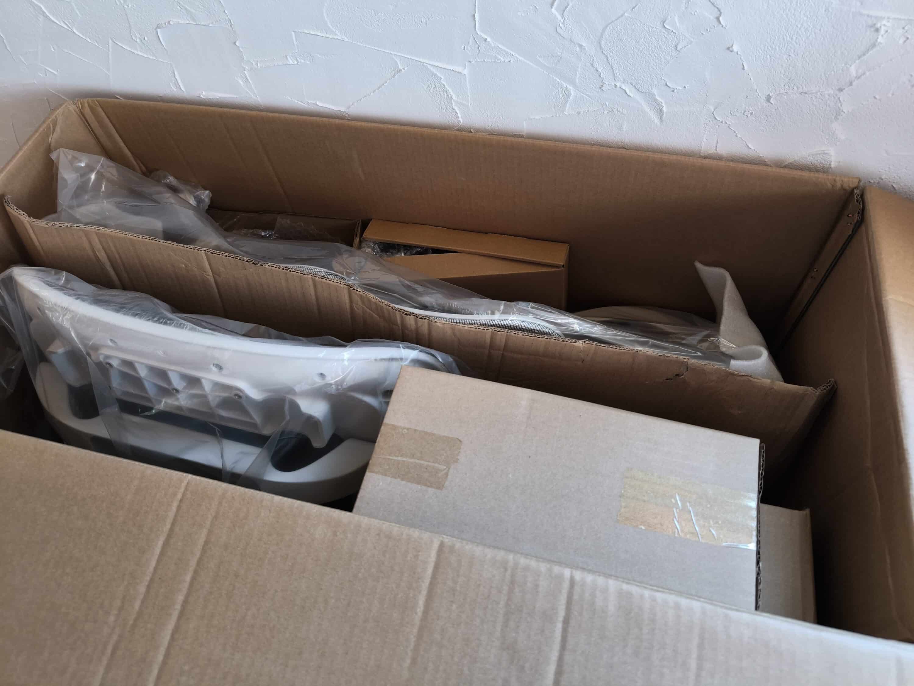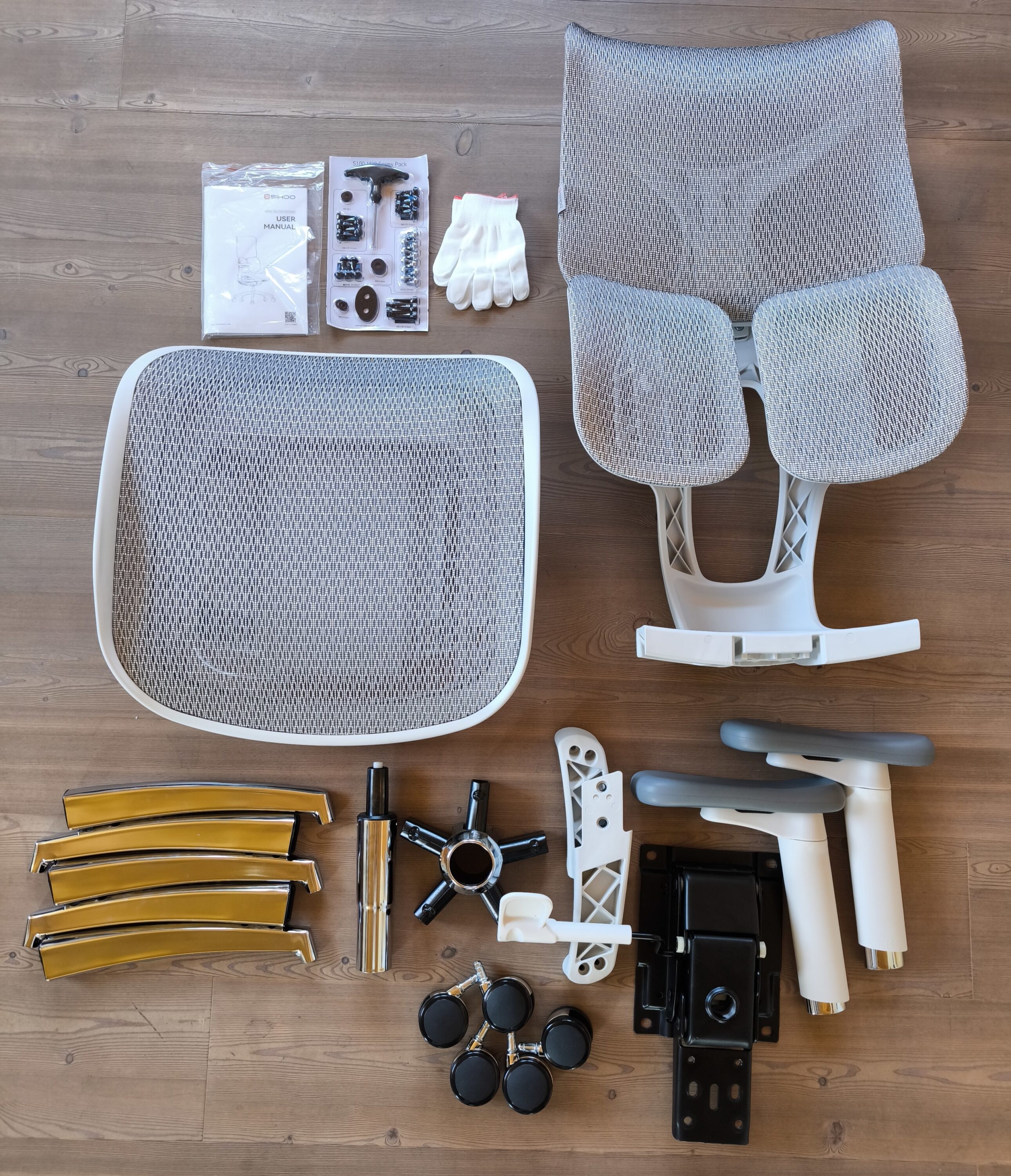 As you can see right at the start, the box is packed full of individual parts. The SIHOO Doro S100 is divided into a seat cushion and backrest. In addition, there is the mechanism, the two armrests with brackets, the base and five chair leg tubes as well as just as many wheels. The gas spring and a decorative cover for the base are also included in the scope of delivery. Additional assembly material with instructions and protective gloves round off the offer.