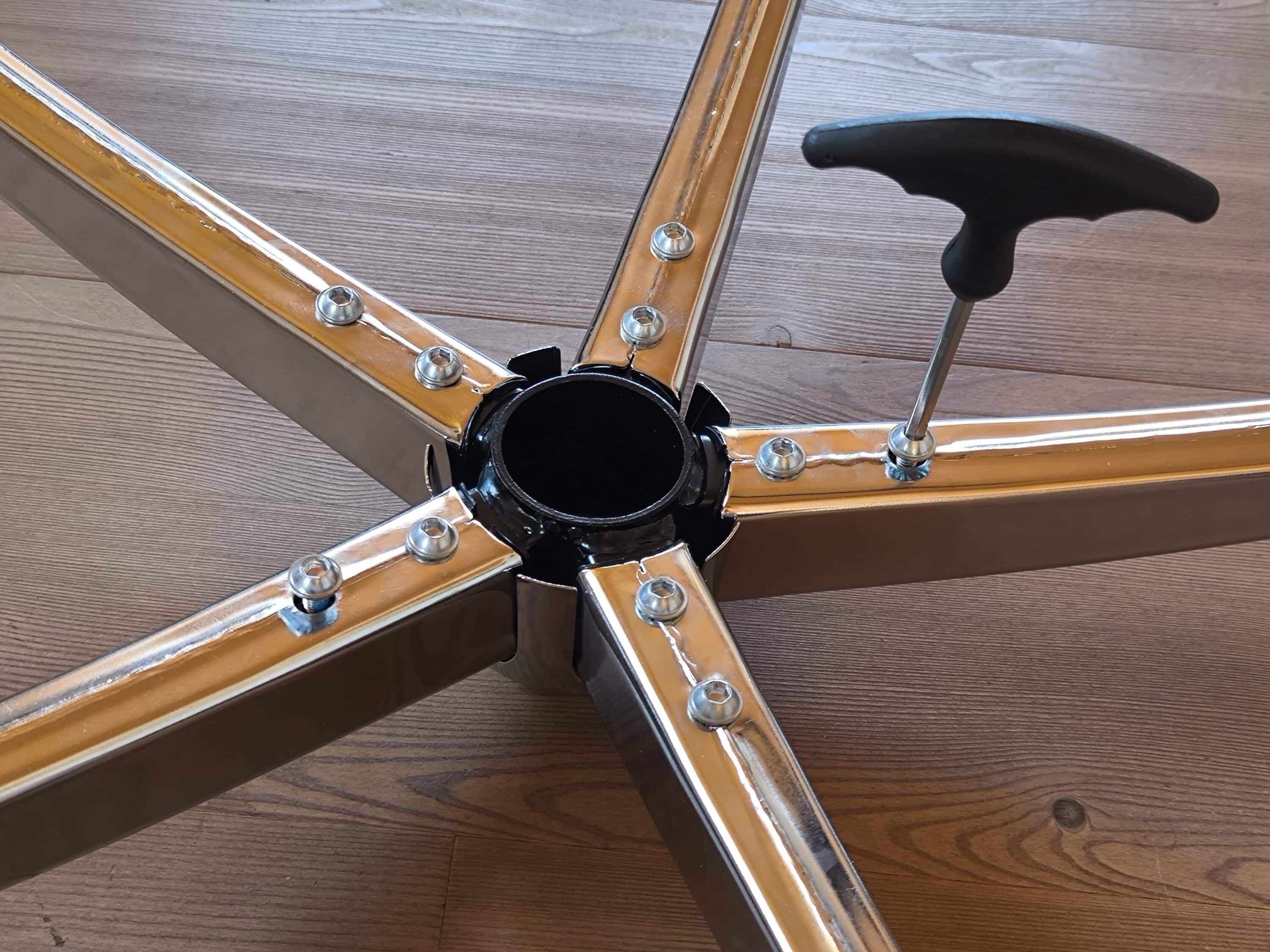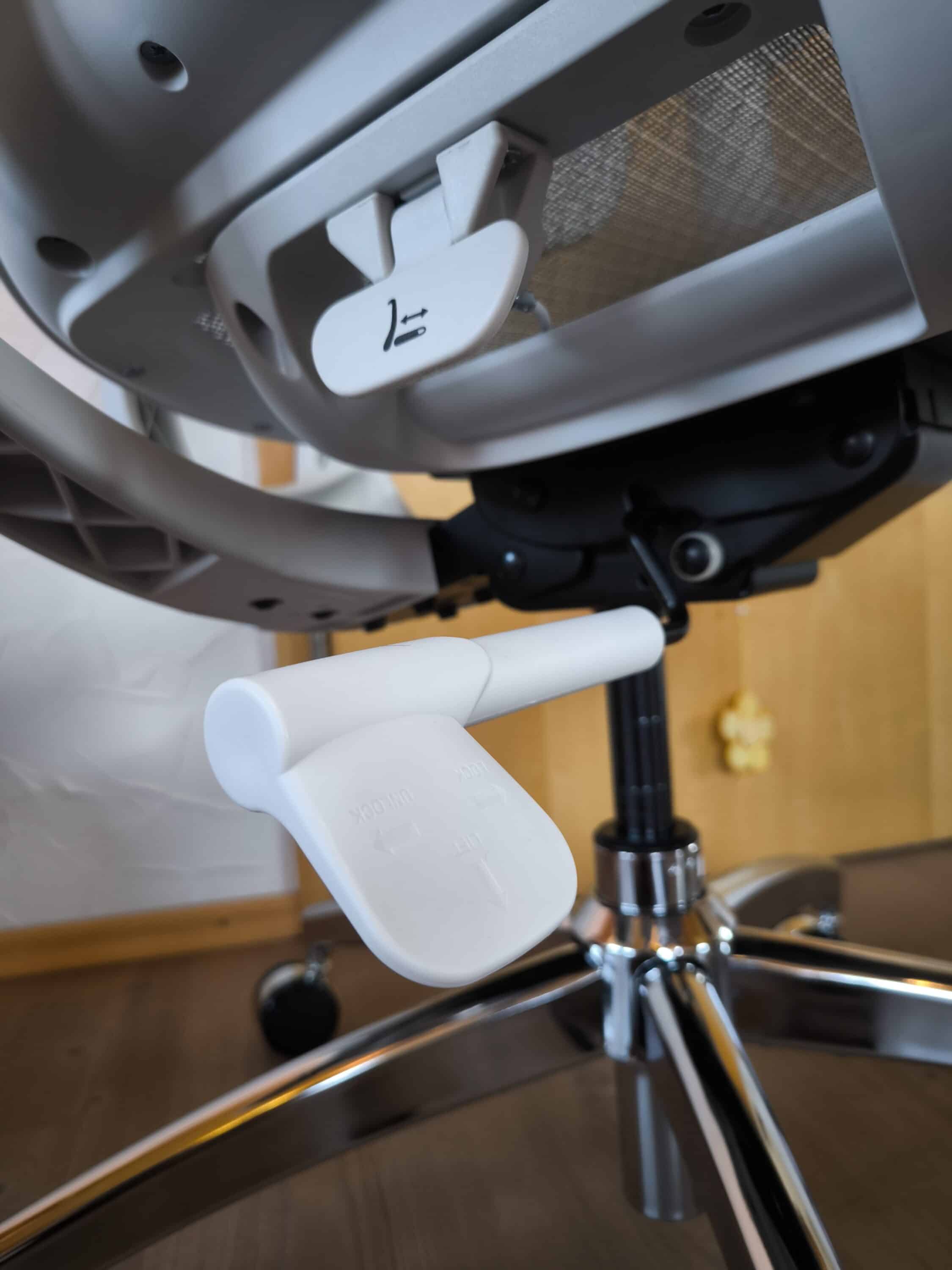 The chair is further adjusted using the long lower handle of the mechanism. The height of the chair is adjusted by pulling it up, and the tilt is adjusted by pulling it out. The locking mechanism can be adjusted in three stages up to an angle of 135 degrees. And there really is room for improvement here, as the increments are too large. A gradation of seven units, for example, would be desirable here, as the transition from sitting upright to the next possible position makes a significant difference. There is also no lock for the 4D armrests, which currently move forwards, backwards or to the side unintentionally. In the long run, this can be a real hindrance in everyday life.