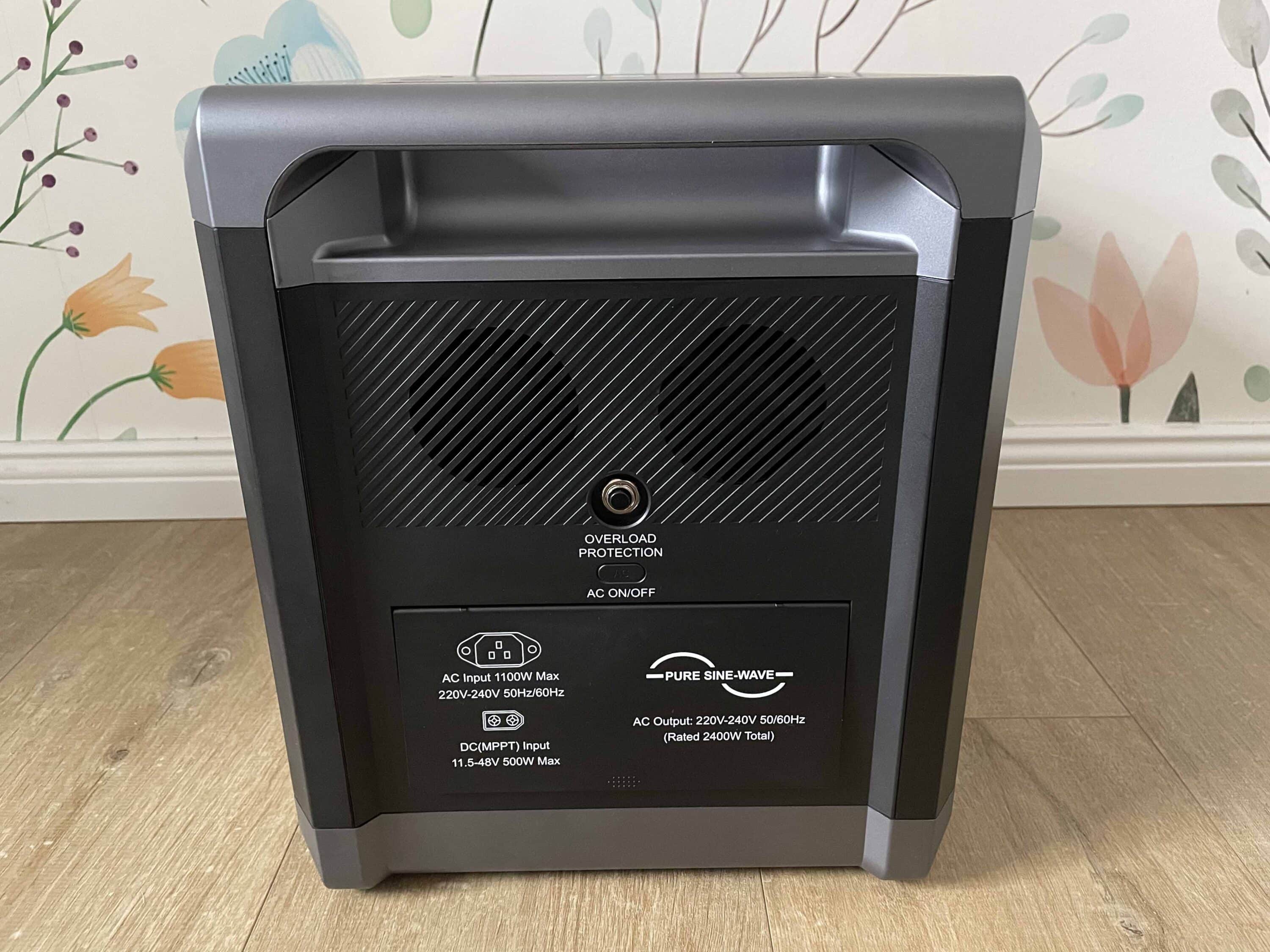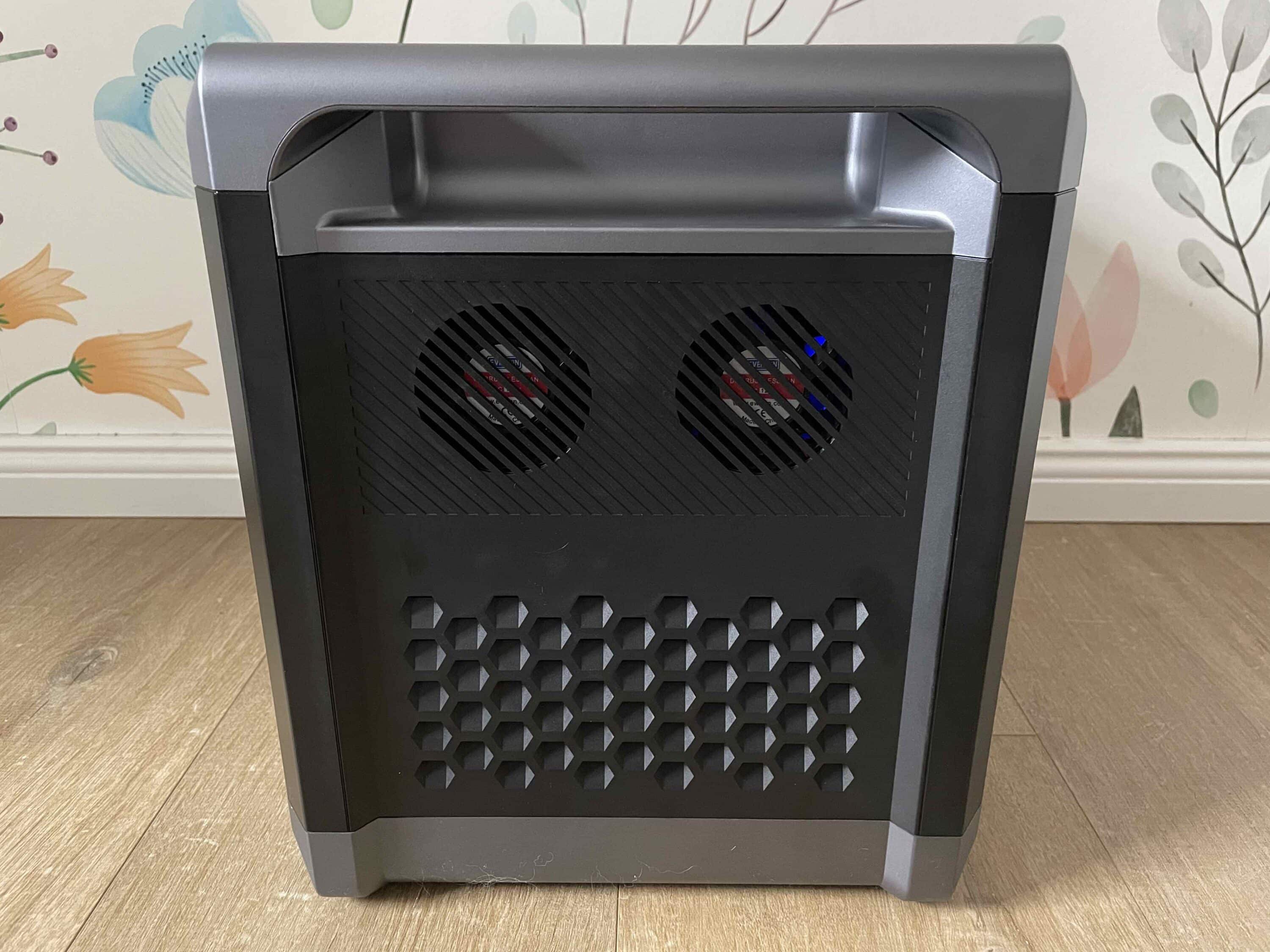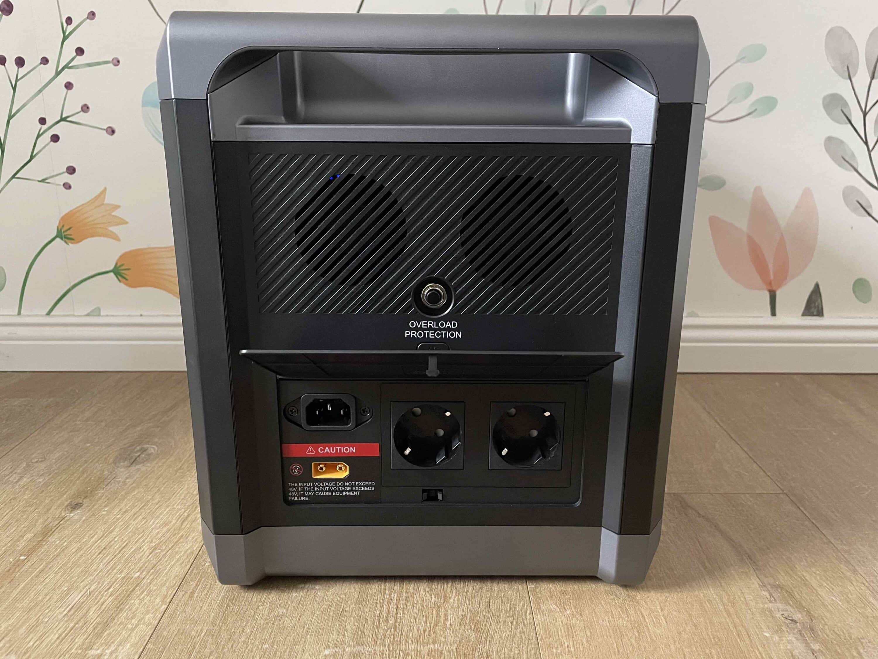 The integrated LiFePO4 battery can be charged via these connections. On the left are two powerful fans that regulate the temperature of the mobile energy storage unit. All in all, the power station impresses with its solid build quality. Although flagship models from EcoFlow or Bluetti are even better made, they are also significantly more expensive.