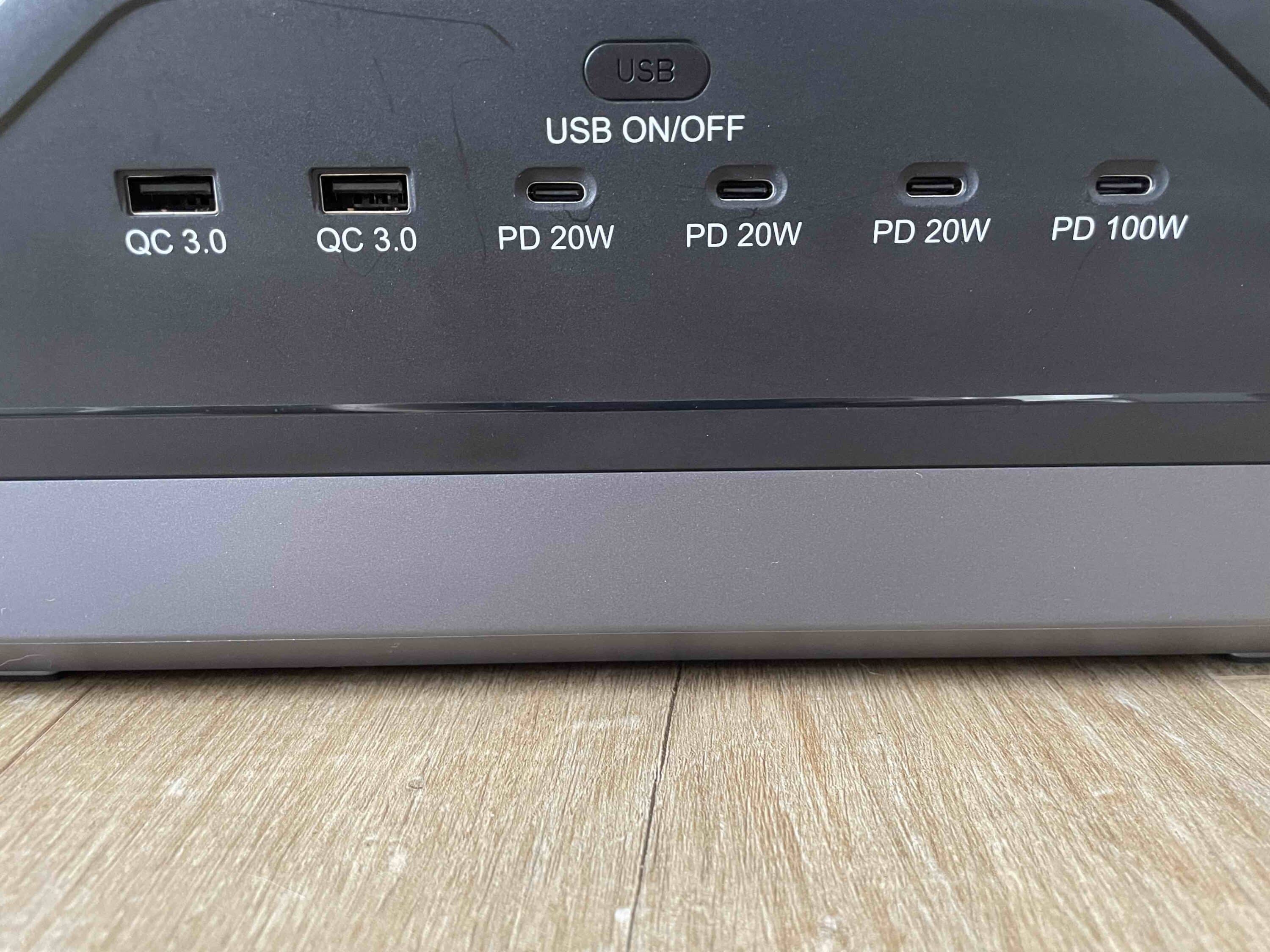 | Outputs | – 2 x AC (2400 W constant, 4800 W peak) – 2 x DC (12 V / 3 A) – 1 x XT60 (12 V / 25 A) – 1 x car connection (12 V / 10 A) – 2x USB-A QC 3.0 with 18W – 3x USB-C PD 20W – 1x USB-C PD 100W) |