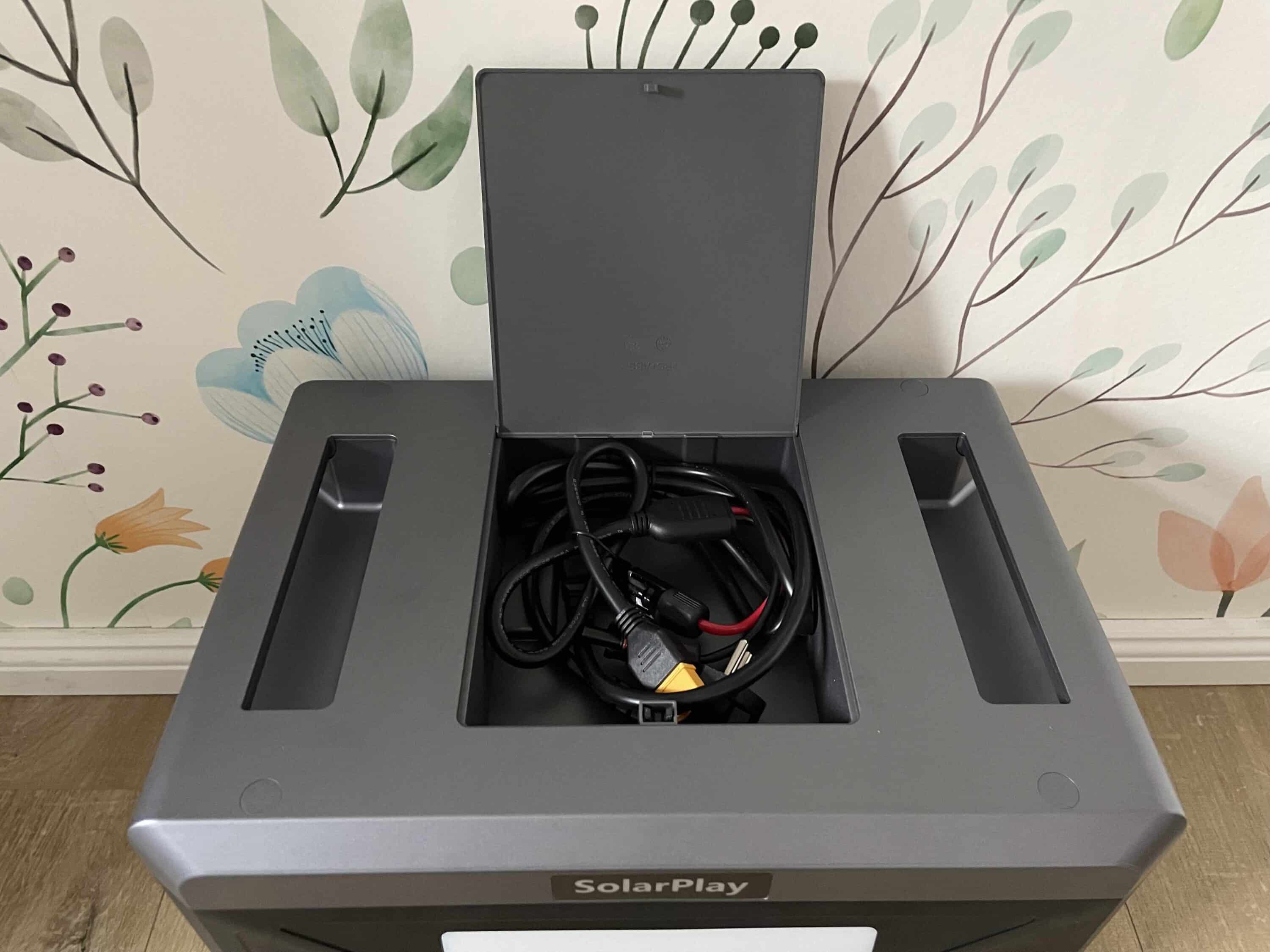 With a weight of 21.7 kg, the SolarPlay is of course no lightweight. However, to make transportation possible, the manufacturer uses two practical handles that are embedded in the housing. This reminded me of models such as the Dabbson DBS2300 (review, € 1,299.00 *) or Bluetti AC70 (review, € 499.00 *). Another trick on the top is the lid, under which the supplied cables can be stored. Unfortunately, this is a little rickety.