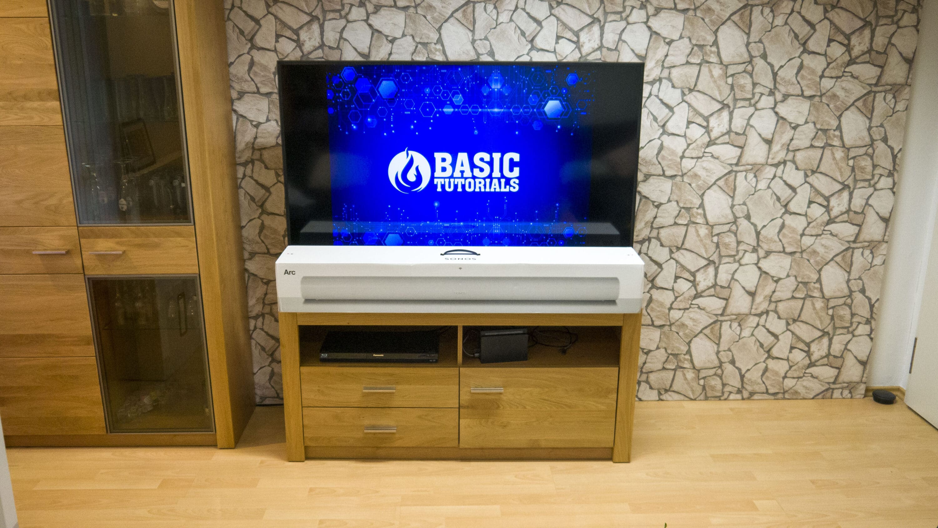 A lot of sound wants to have space. At least that’s how it looks when you get the Sonos Arc as a package. Since the dimensions get the first time a real equivalent. But as for the package itself, the Sonos Arc is very well protected in it and protected by two locks on the sides from accidentally falling out. The Arc itself is wrapped in a fabric and can be placed directly in front of the TV without any major problems. There it is, the Sonos soundbar. Even though a 58-inch TV is already relatively large, it almost seems too small for the Sonos Arc. The TV is barely wider than the soundbar, so it’s safe to say that you’ll be much better off with the Beam if the TV is 40 inches or smaller. But enough of the first impression, now first set up.