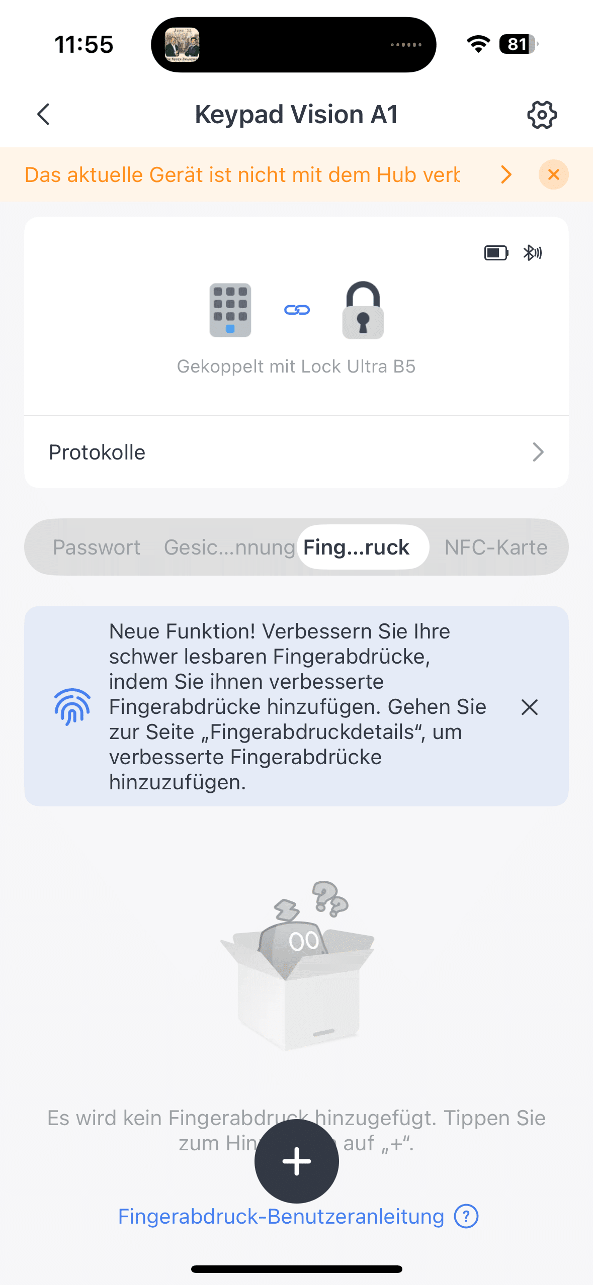 Alternatively, you can also unlock the lock using your fingerprint. Fingerprints are also saved via the app. As with saving fingerprints in smartphones, you have to place your finger on the scanner several times. In the test, the scanner worked quickly and reliably. Only my young daughter’s fingers sometimes caused problems. The fingertip may be too small for the scanner.