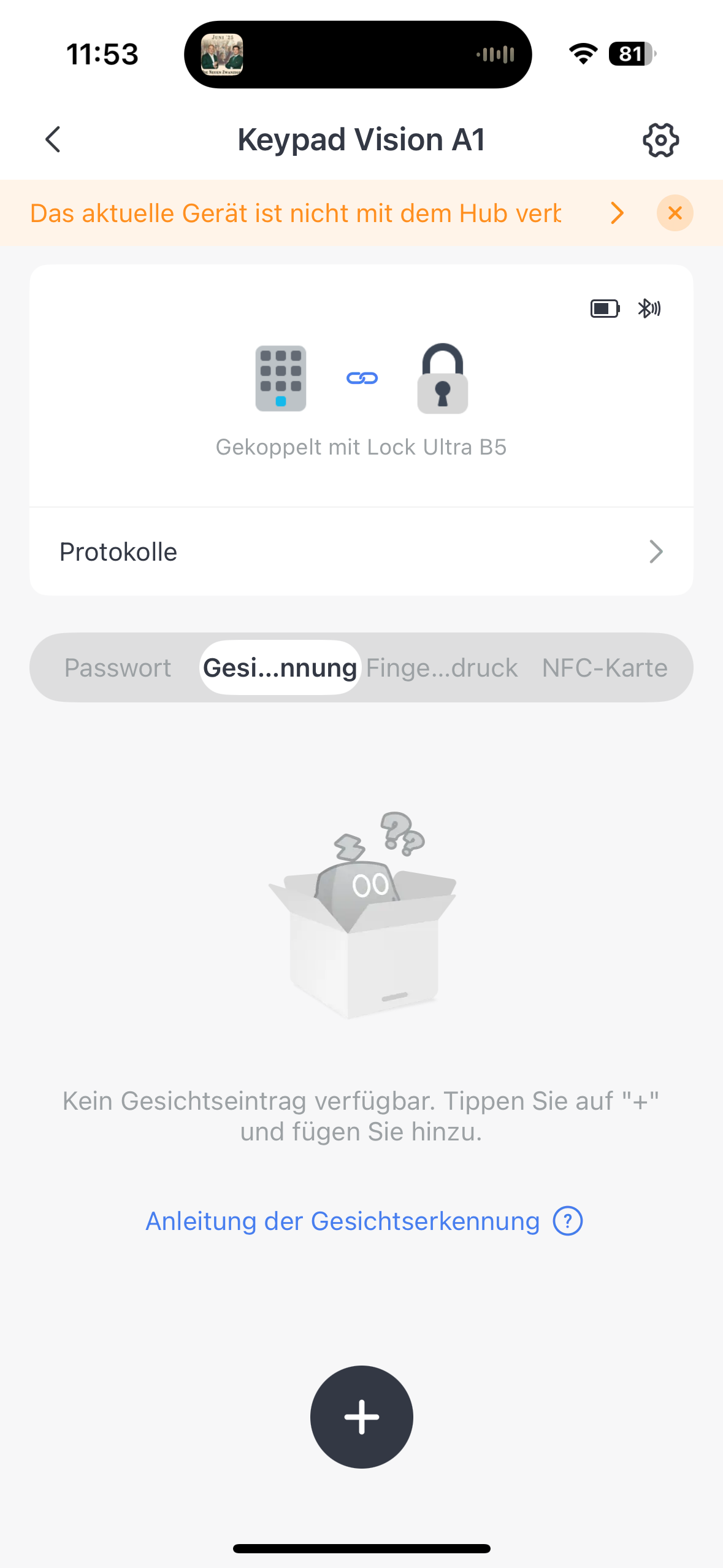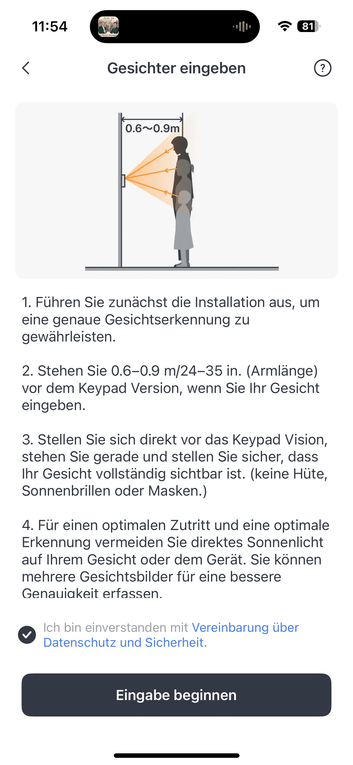 The use of NFC cards is certainly most similar to the classic method of opening with a key. Everything worked perfectly with the three methods mentioned. But anything else would have surprised me, as these unlocking methods were already available on the SwitchBot Keypad Touch (€ 99.99 *). However, the highlight of the Keypad Vision is undoubtedly the 3D face recognition. In the test, the face scan worked pleasingly reliably. Only in excessively bright or dark surroundings did the scans sometimes fail.