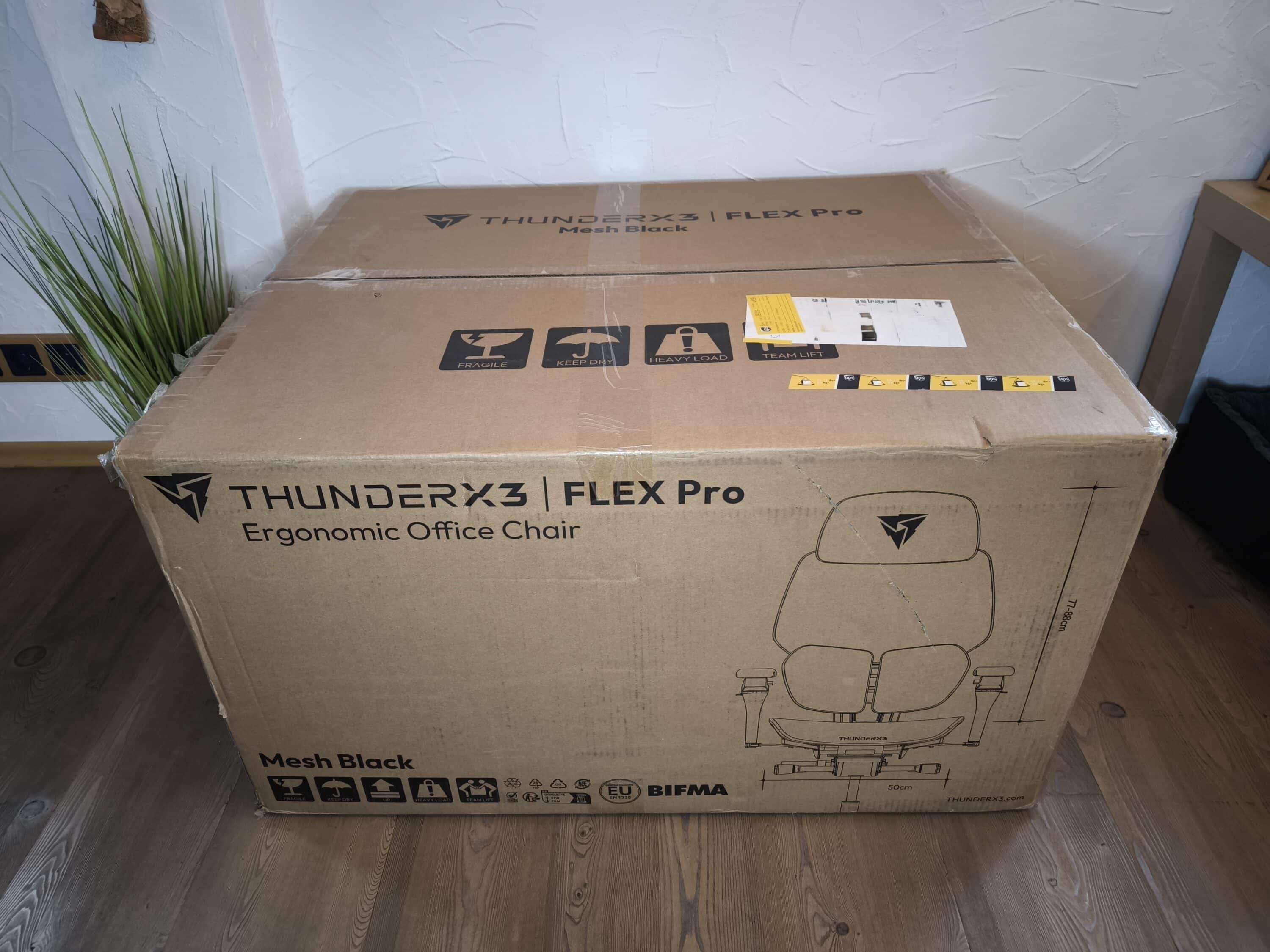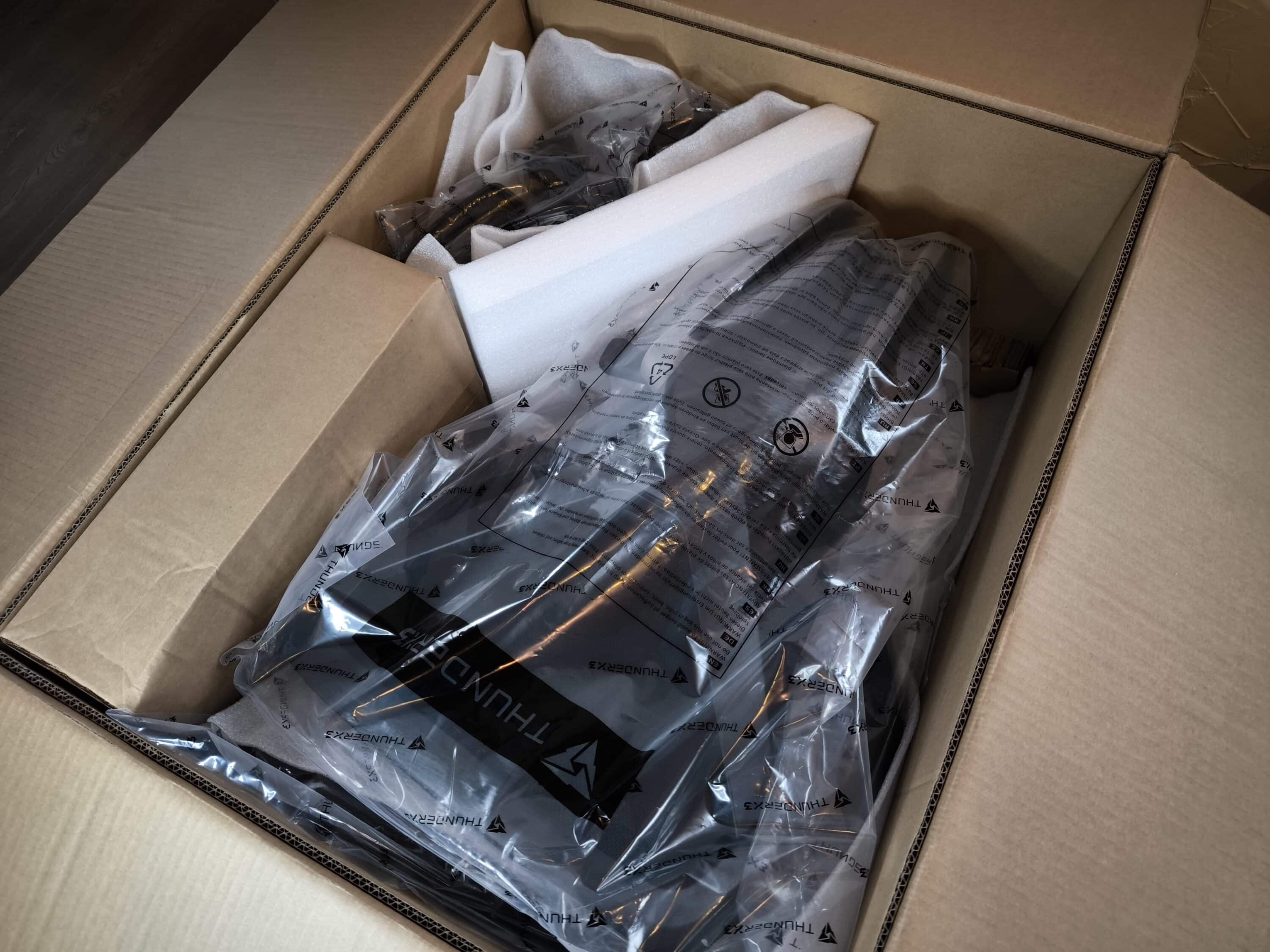 The ThunderX3 FLEX Pro | MESH is delivered in a generously sized and heavy box that weighs a whopping 33 kilograms. If you look at the individual components, you will notice that all relevant parts of the office chair have been wrapped separately in foil and protected from possible delivery damage with foam parts.