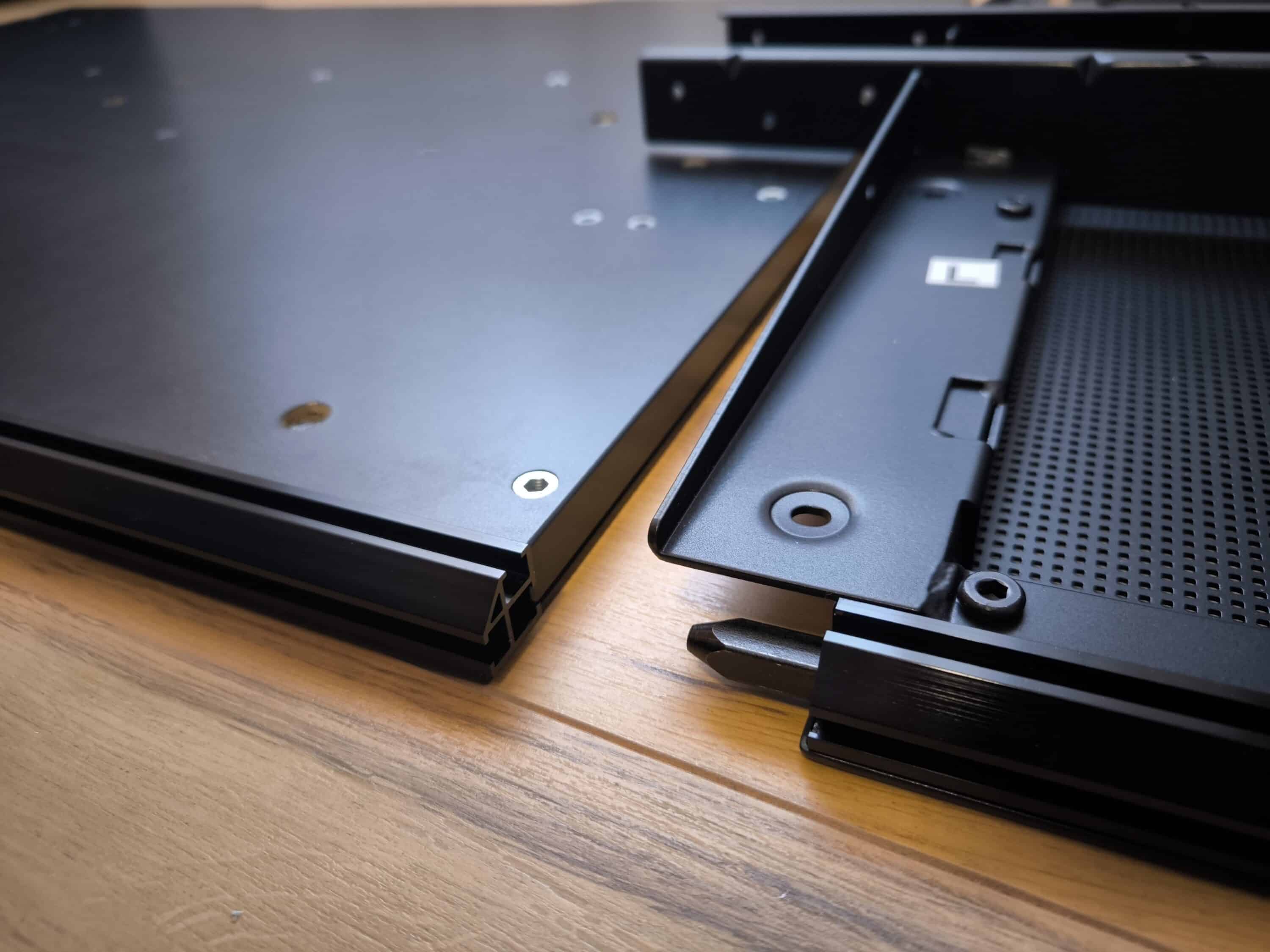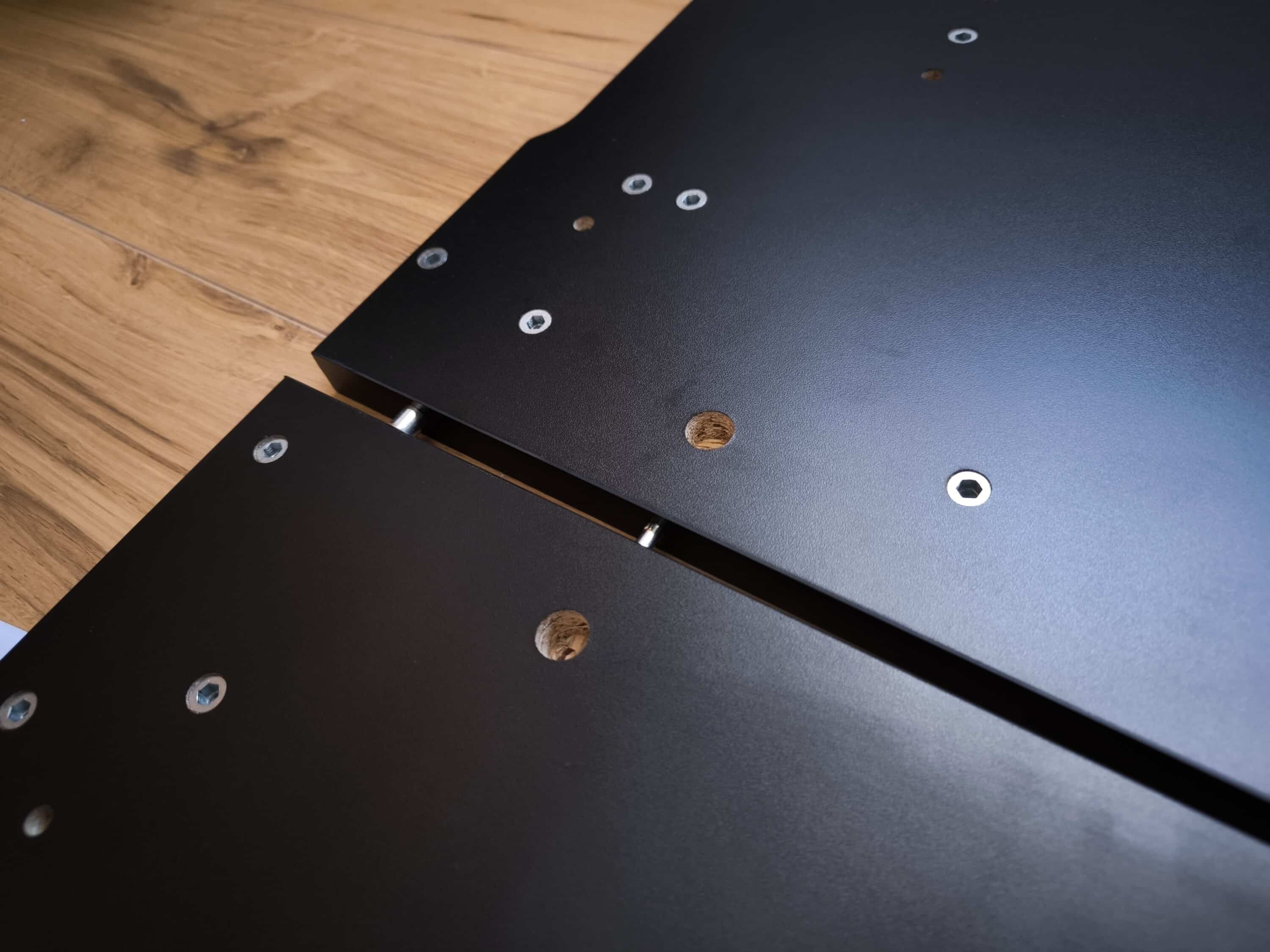The first step is to assemble and attach the two elongated panel elements that will later serve as the work surface. The two side mesh panels are then inserted on both sides and also fixed in place. After connecting the two central supports to the underside of the worktop, the two table legs are attached to each side. From this point on, the central drive shaft can be fitted to transfer the movement of the motor to both table legs. Most of the work has already been done and the next steps include attaching the table supports and installing the cable holder, headphone holder and cup holder.
