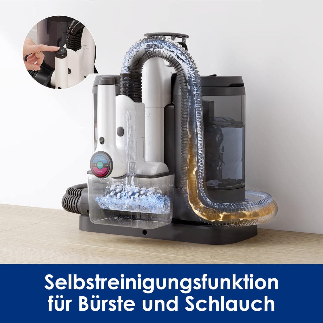 Carpet One Spot and Carpet One Spot Essentials also offer self-cleaning. For this purpose, there is a separate tray on the main unit into which the cleaning head is inserted. After pressing the self-cleaning button, the head is rinsed again. With the iCarpet Spot, you have to do this yourself by hand in the sink.