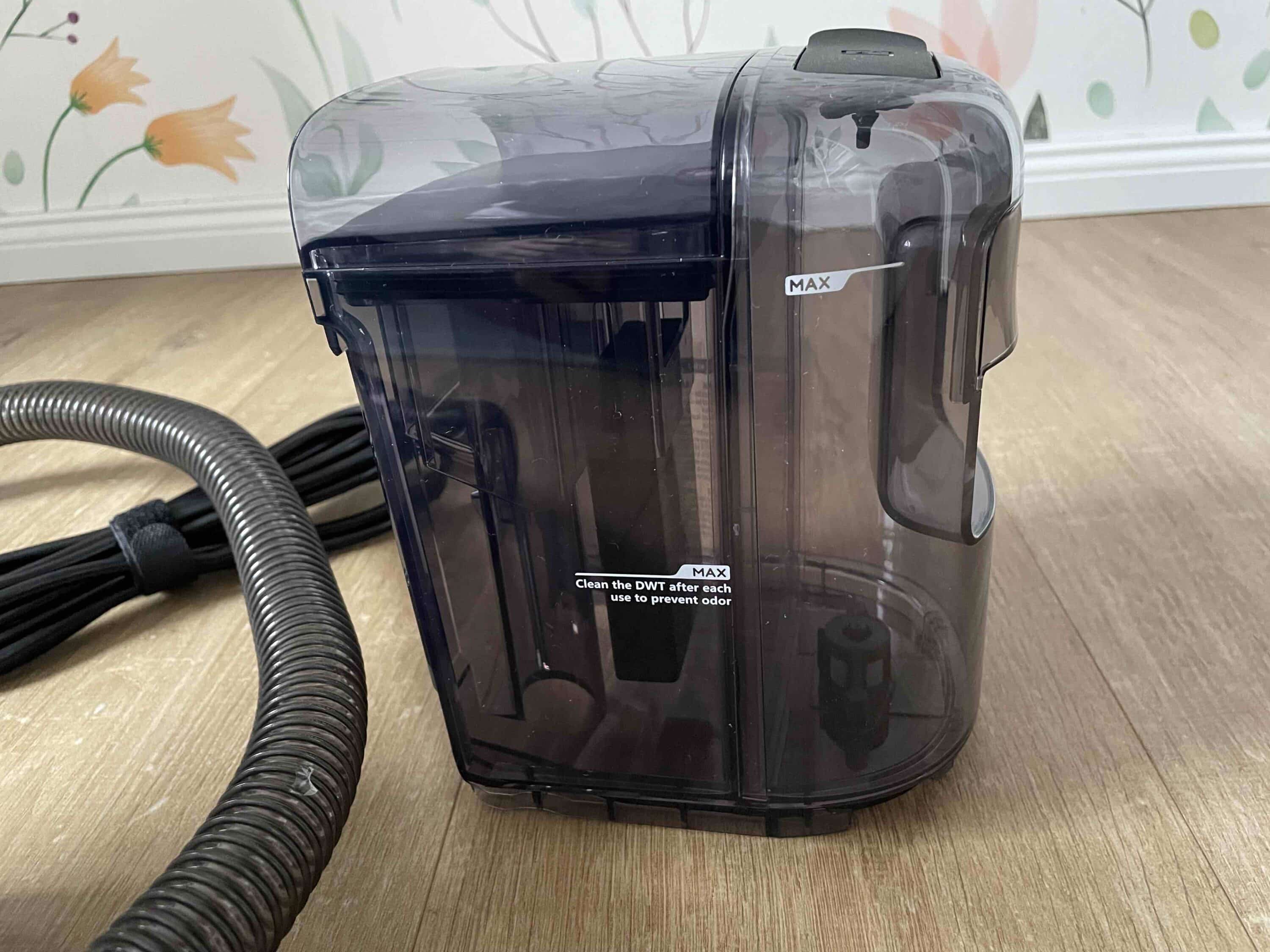 After all, very few vehicle models have a classic Schuko socket. If you don’t have an external socket on the wall of your home, you will unfortunately have to do without this really helpful cleaning option. According to Tineco, the operating volume of the carpet cleaner is 82 dB. This is a solid value, but anything but whisper-quiet. For comparison: TÜV recommends a volume of between 70 and 75 dB.