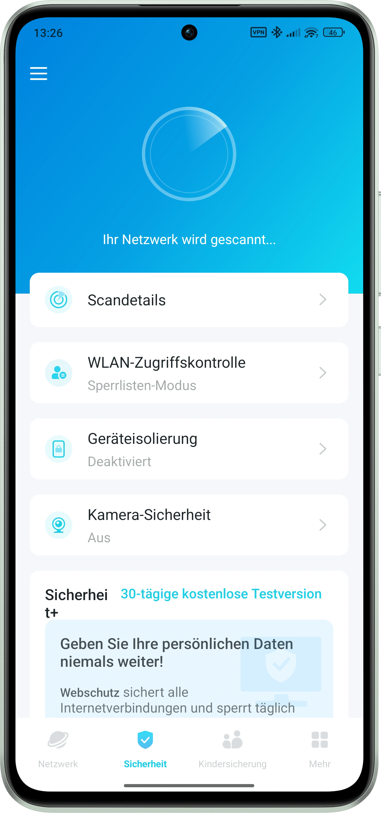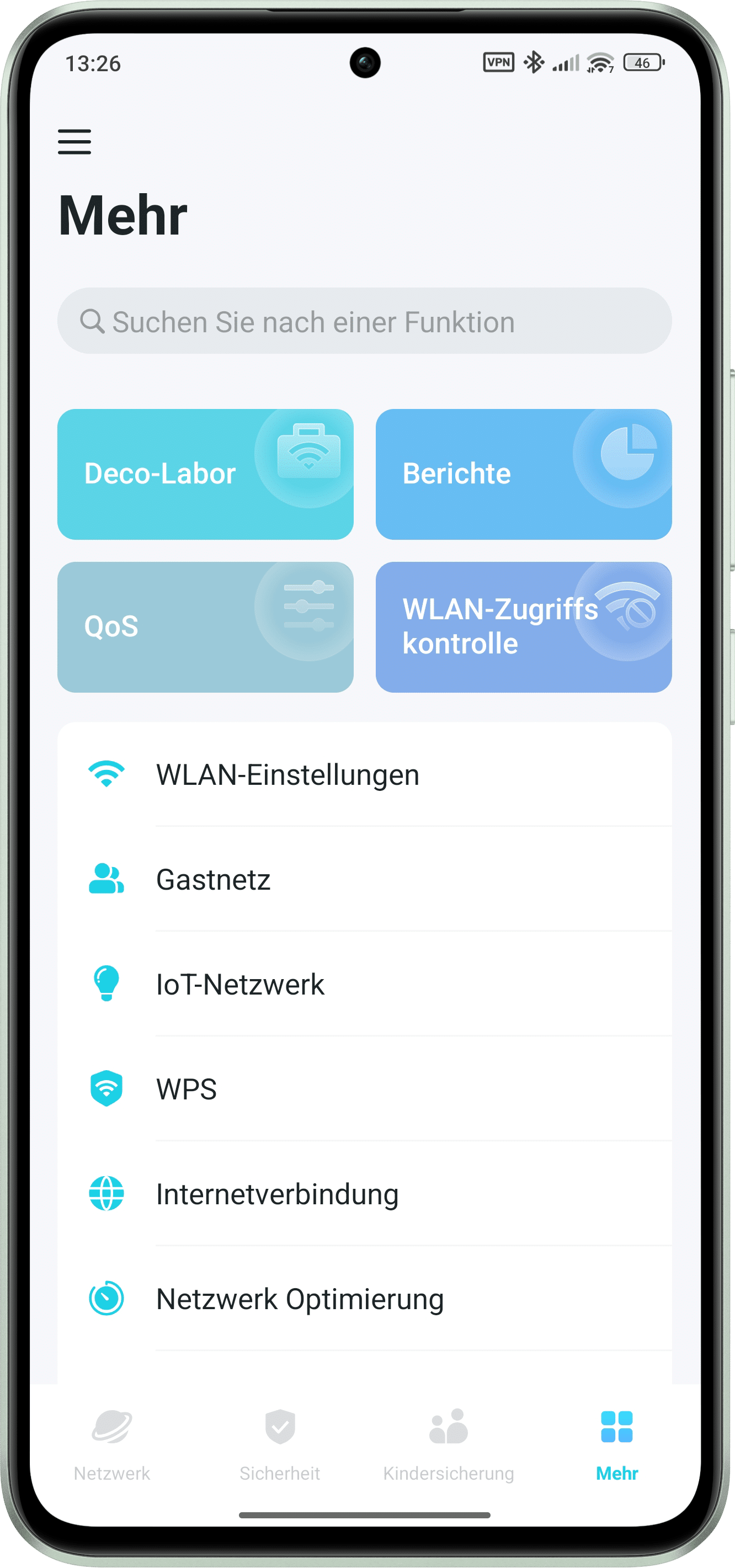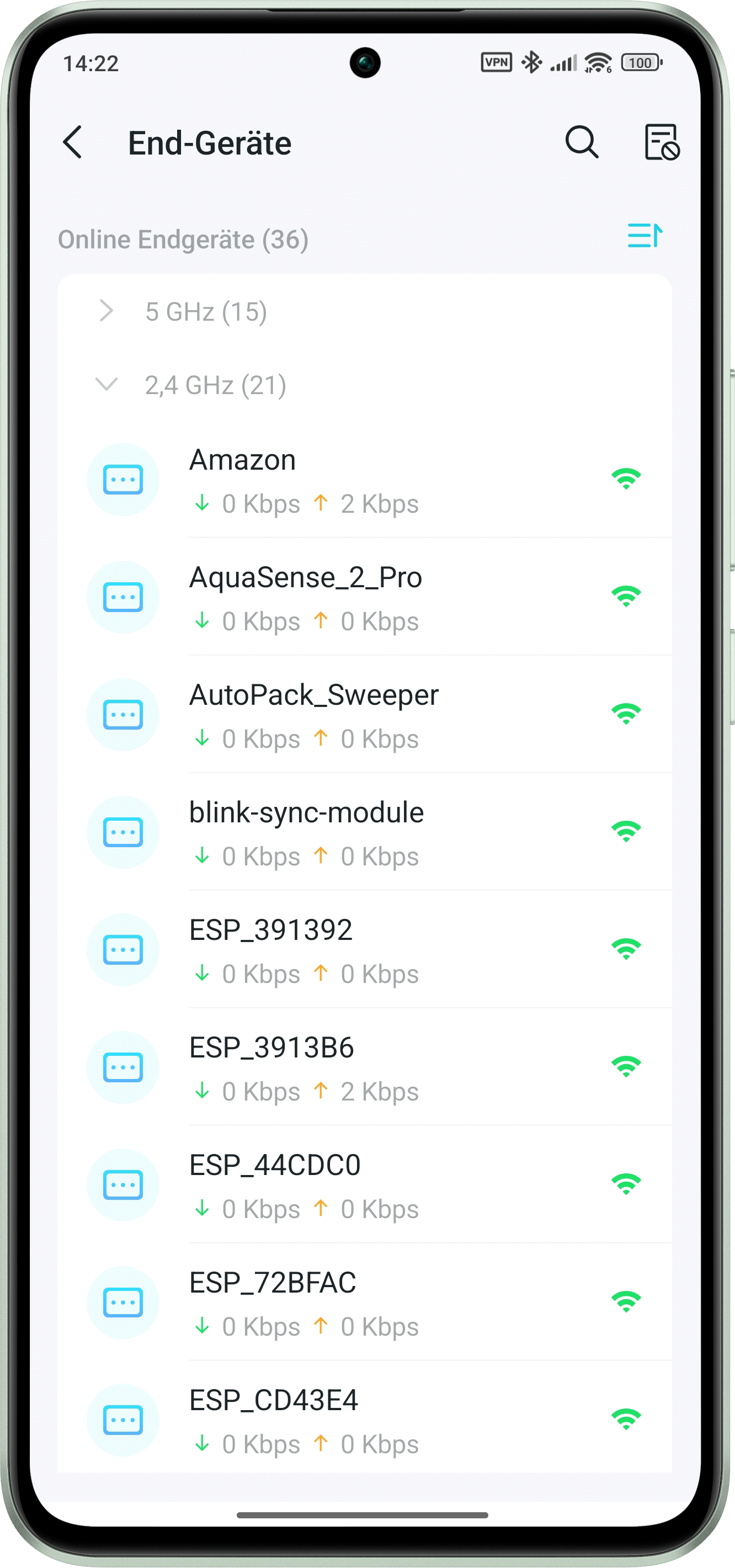 As with the previous models, the Deco app is also the digital tool for setting up and administering the Deco BE65. The app scores points with its tidy, contemporary design, which should make it easy to get started even for less experienced users. In addition, the app remains the central control unit even after the initial installation. In the “Network” section, the connected Deco units, including the network topology and all active end devices, are clearly displayed. In addition, speed tests can be carried out here or settings can be made to the existing Wi-Fi.
