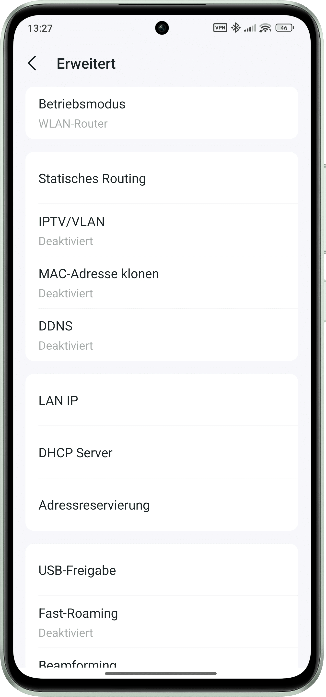 A look at the “More” section of the Deco app shows that TP-Link provides a variety of extras with the Deco BE65. These include setting up a separate guest network or a special network environment for IoT devices. We are already familiar with these functions from the Deco XE75. The “Advanced” section, on the other hand, contains lesser-known configuration options, such as the choice between operating modes, beamforming and fast roaming. Static routing can also be set up here, certain IP addresses reserved or an IPTV VLAN created. In general, it is therefore worth taking a look here to optimize the WLAN.