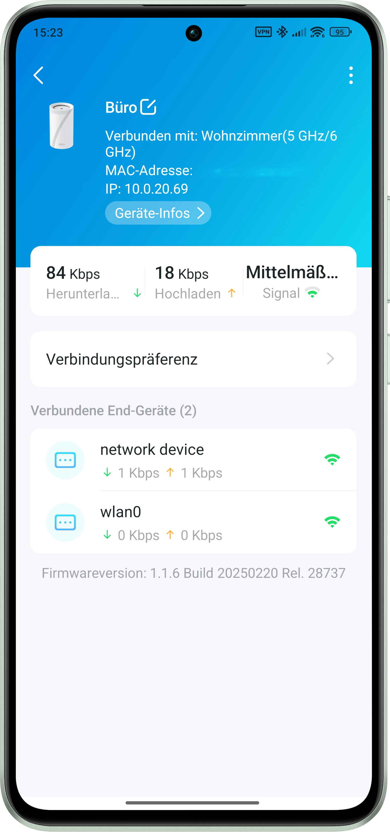 The smooth communication of the Deco units is also impressive here, providing solid speeds overall with good coverage. Incidentally, the additional 6 GHz band can also be configured as a dedicated mesh channel via the app if it is not required by end devices in everyday use. This means that the bandwidth is only available to the three nodes. With the WiFi 7 standard, you are also on the safe side in the long term.