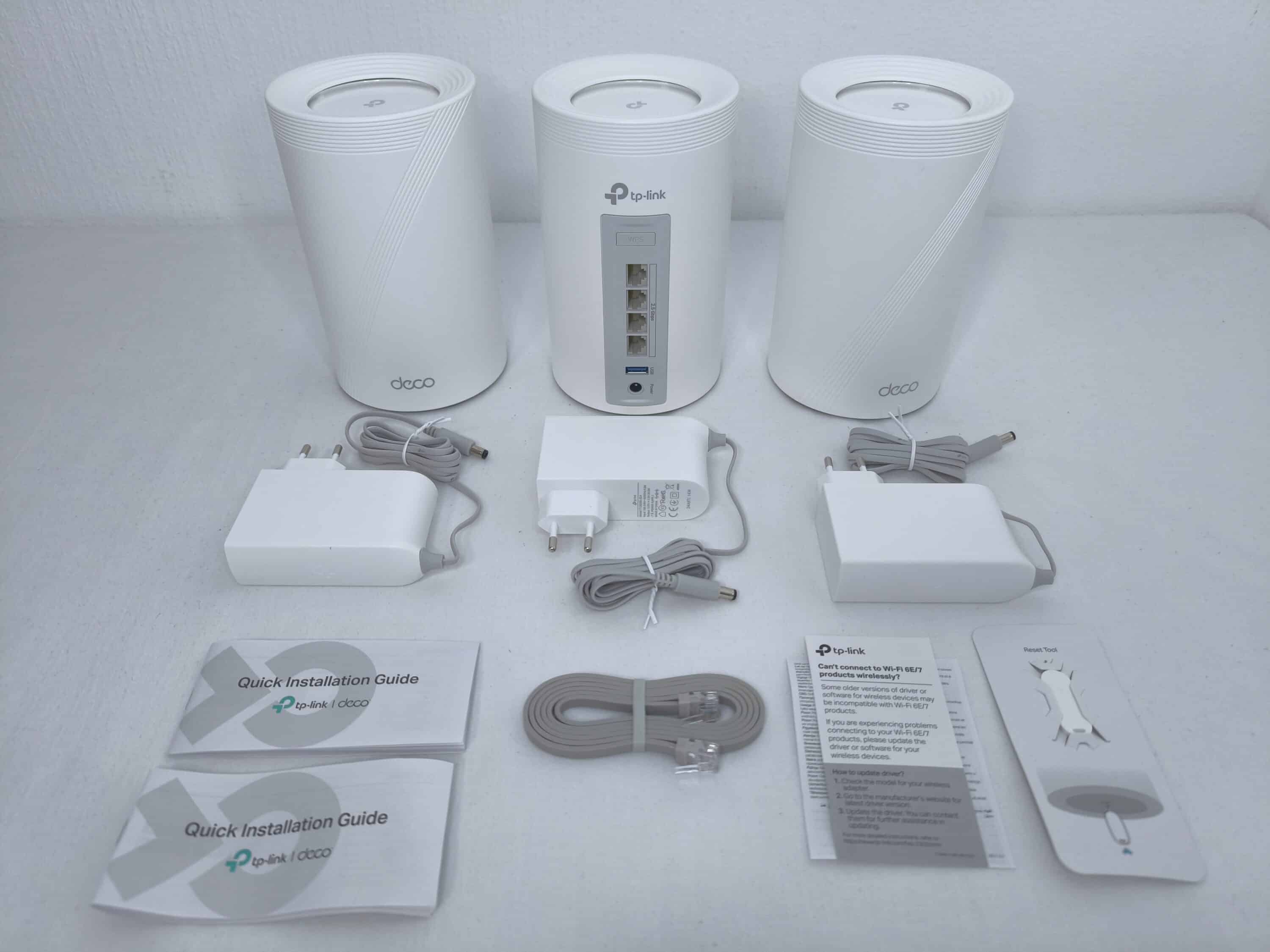 The TP-Link Deco BE65 set includes three mesh units, each with its own power supply unit and an RJ45 Ethernet cable for LAN connection. To set up an optimal mesh connection, it is recommended to connect at least one or ideally several of the units to the router via LAN. The scope of delivery is completed by a recovery tool, a quick start guide and some enclosed information sheets, as already known from other Deco models.