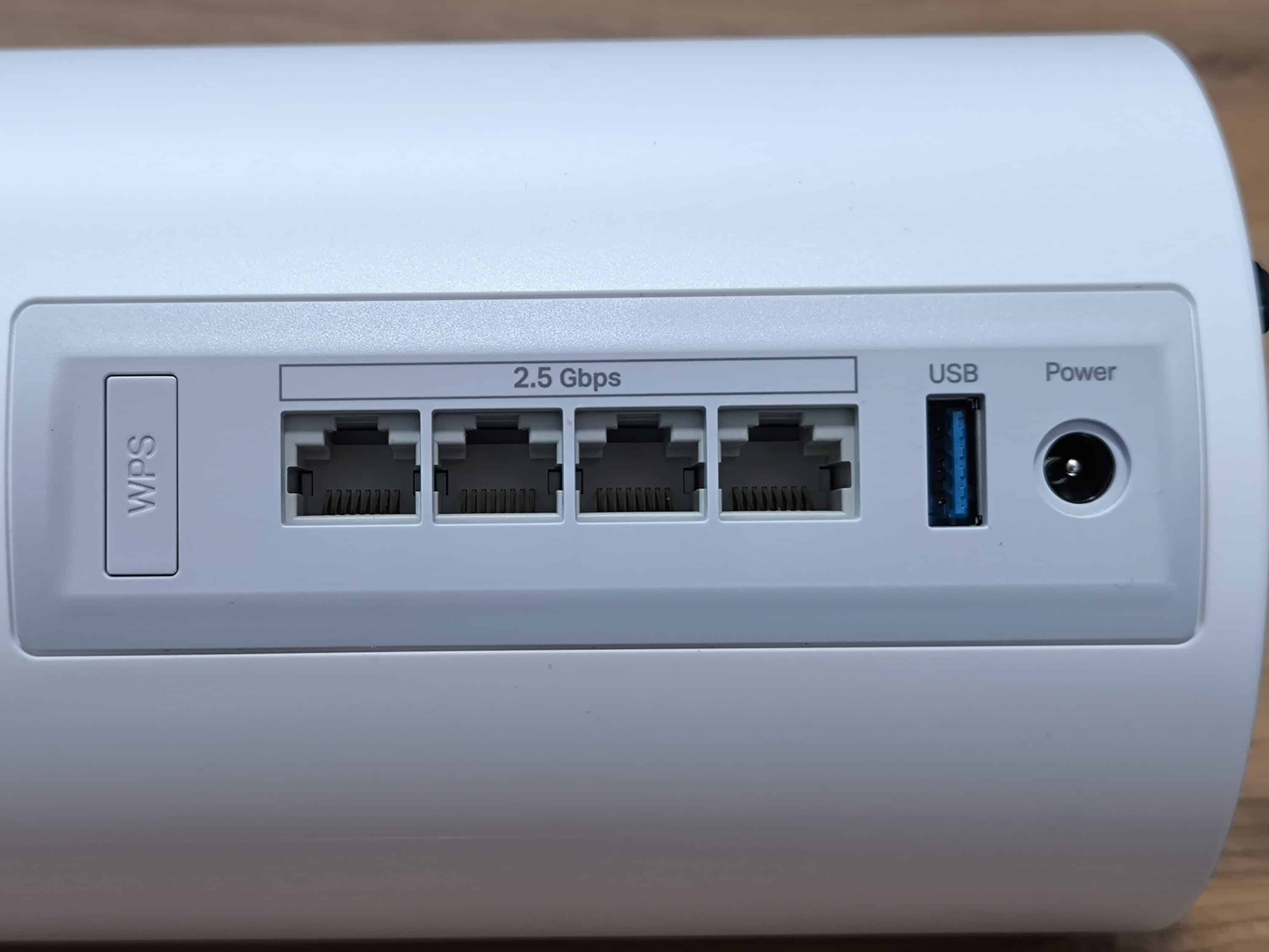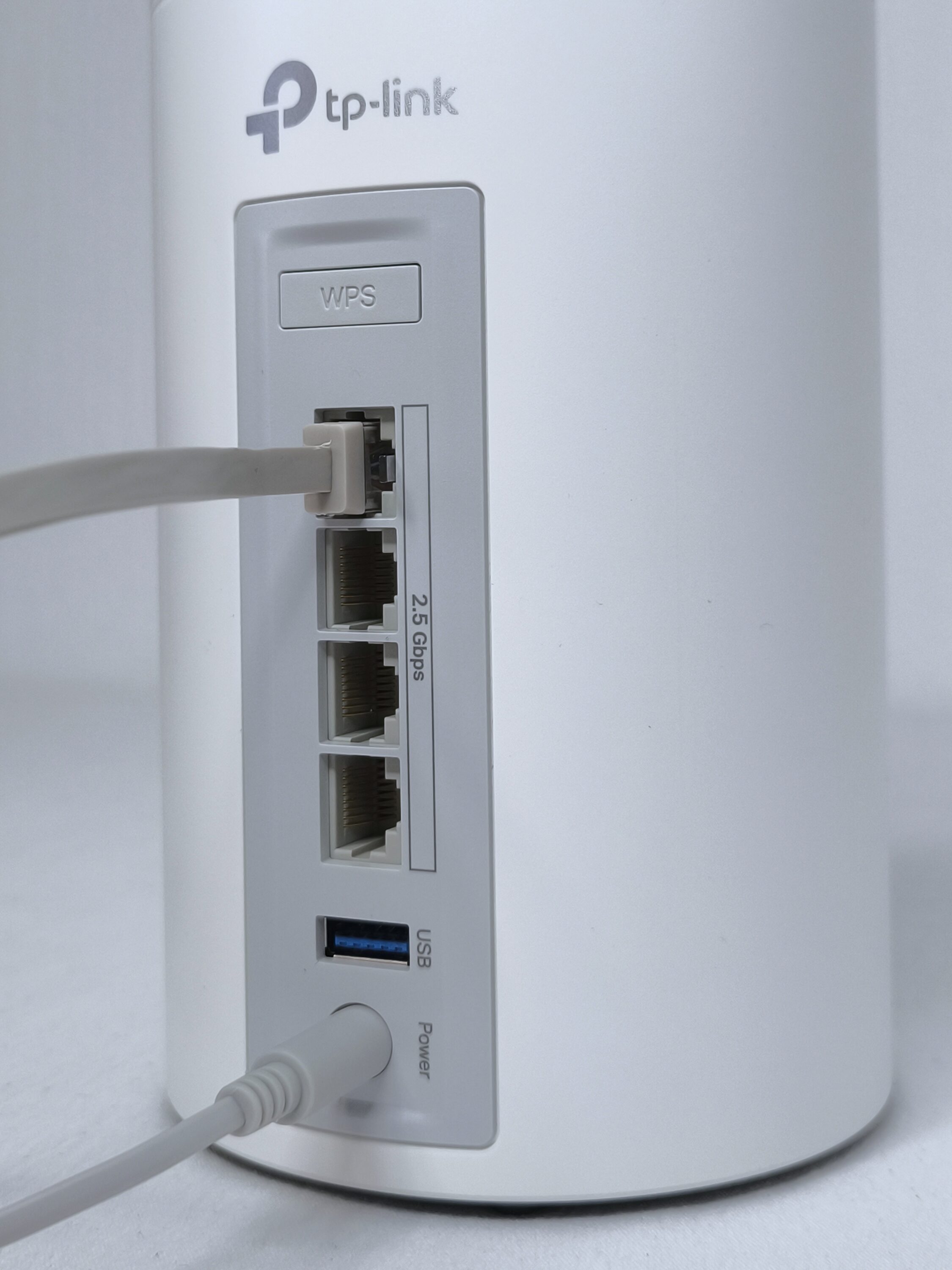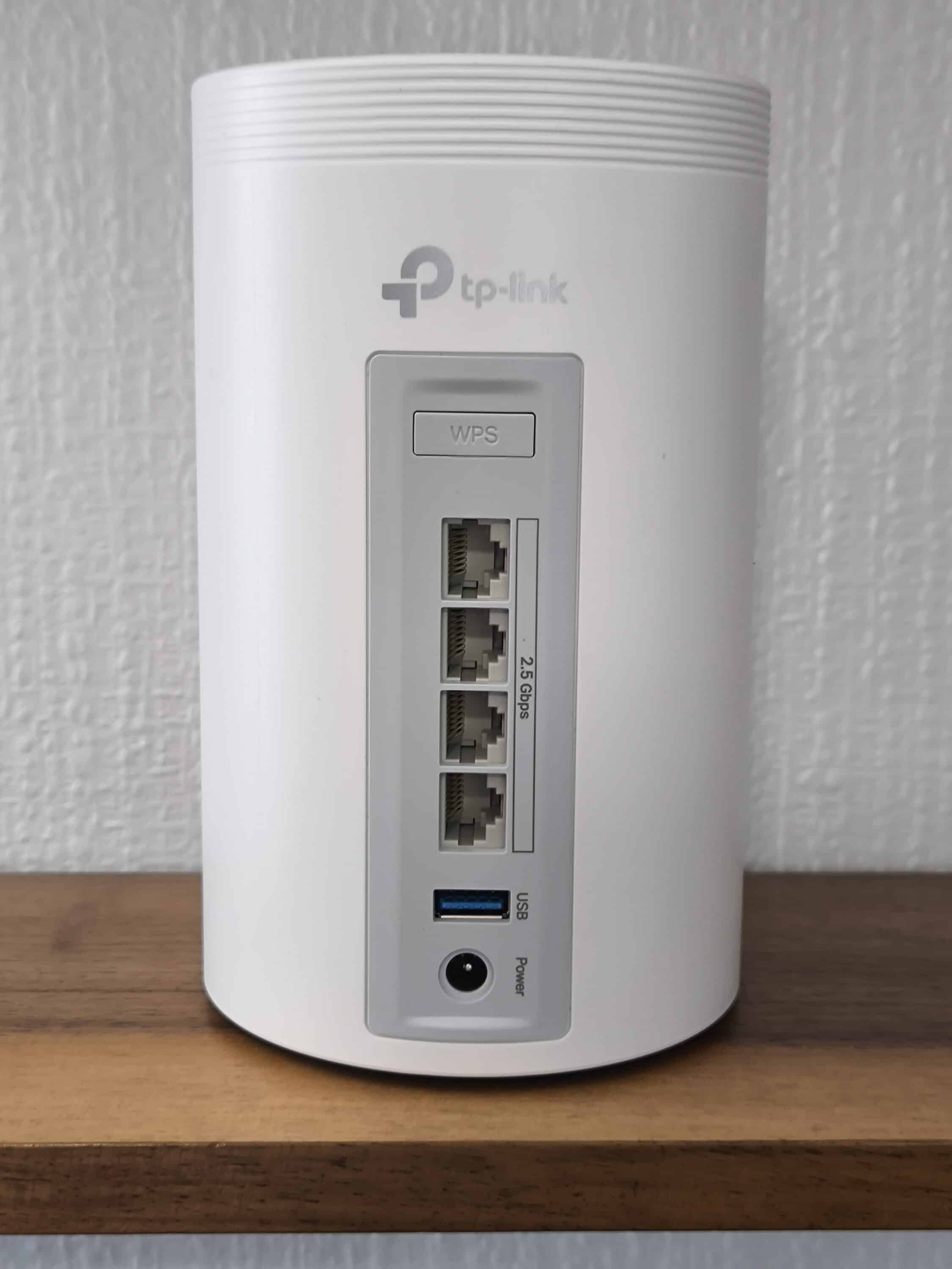 Looking at the connections, the eye wanders to the rear of the Deco BE65. Here you will find a total of four 2.5 Gigabit ports, a USB 3.0 port for connecting a storage device for remote access and, last but not least, the mains connection. Also worth mentioning on this model is the dedicated WPS button, which the Deco XE75 and X1500 (our review) have not yet been able to offer. Other features can be found on the lower side. A reset button and the small LED light for the current system status can be found there. After switching on, it initially appears yellow, while a blue light flashes during setup. If there is an active Internet connection, the LED lights up blue continuously. Under stable Internet conditions, the LED switches to green; in problematic cases, however, it lights up red constantly. This makes it possible to see at a glance which phase the Deco BE65 is currently in.