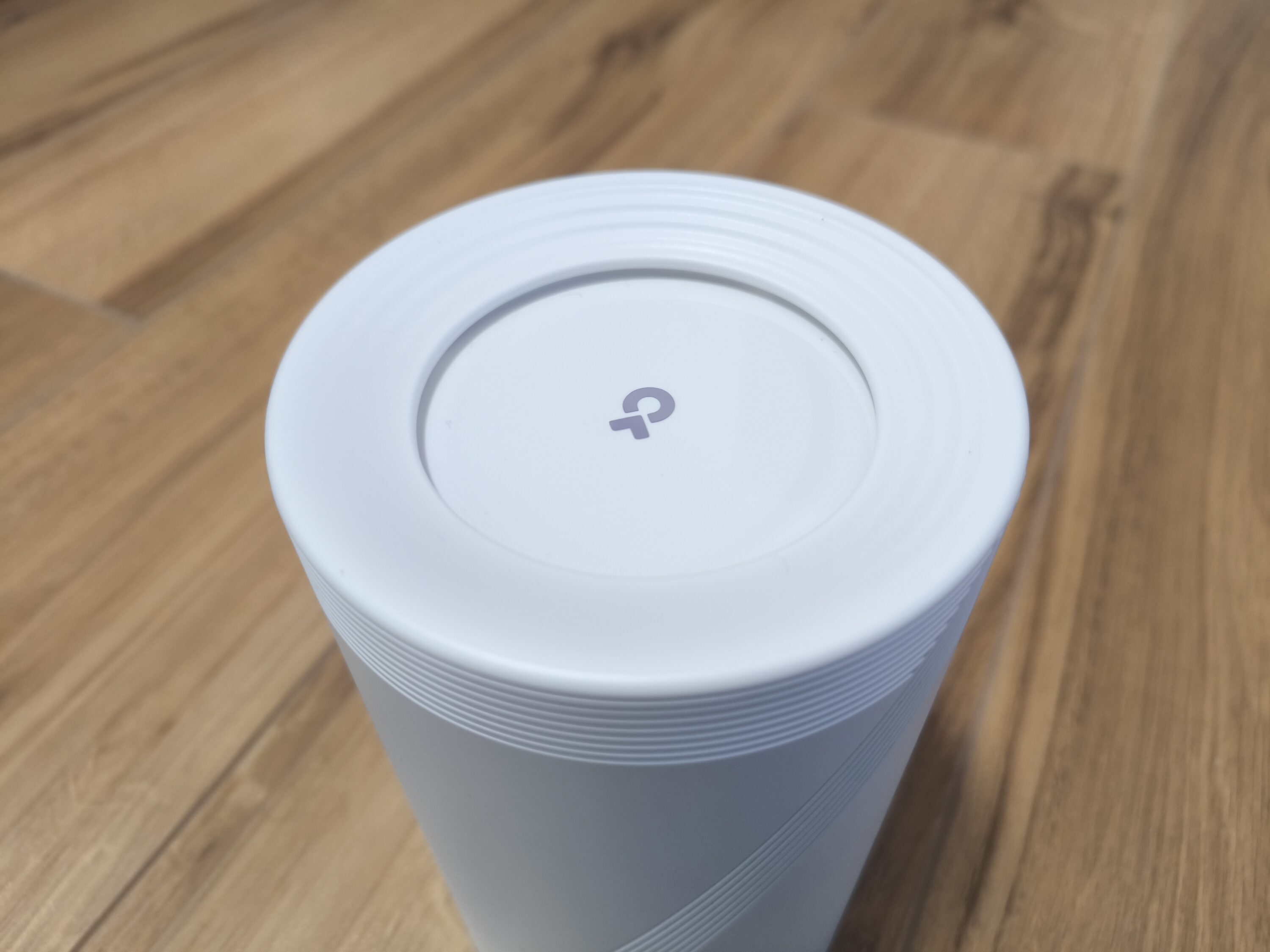 The TP-Link Deco BE65 features a simple, cylindrical design that is strongly reminiscent of the previous models. This impression is underlined by the matt white plastic surface, which gives the mesh system an unobtrusive aesthetic. With a height of around 17.4 cm, the BE65s appear extremely robust, which makes them look more like the XE75s than the smaller BE25s. Nevertheless, they should be able to be integrated unobtrusively into modern living and office environments. The top side is once again smooth and remains slightly concave. The TP-Link logo embedded in the middle is a subtle accent. As with the previous Deco models, there are no exposed LEDs or buttons on the front of the housing.