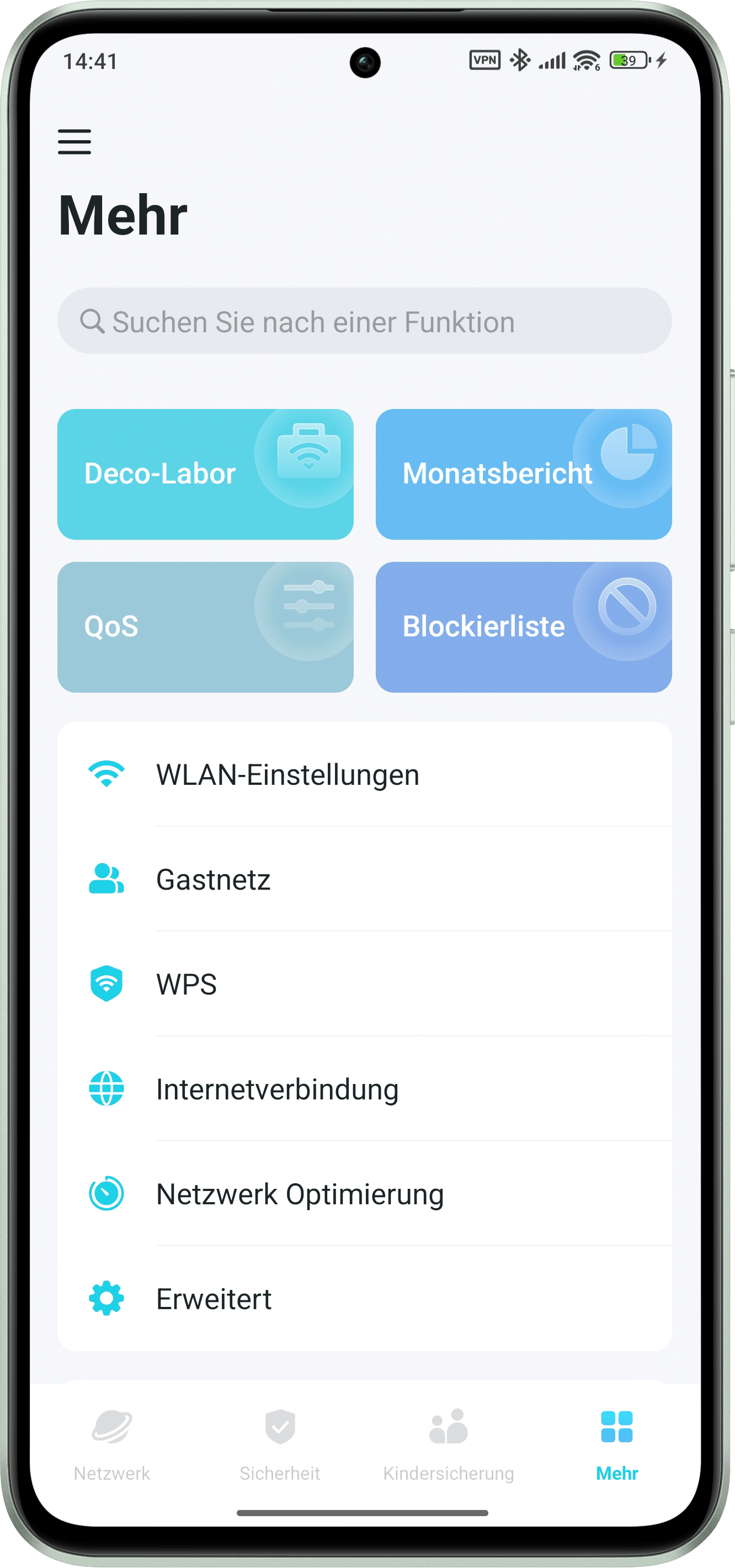 The Deco app, which serves as the system’s central control unit, is usually used for configuration. Thanks to its modern, tidy design, it is suitable for both tech-savvy and less experienced users. The “Network” section, for example, provides a clear display of the connected Deco units, including a network overview and all connected devices. There is also an integrated speed test and the option to conveniently adjust the Wi-Fi settings.
