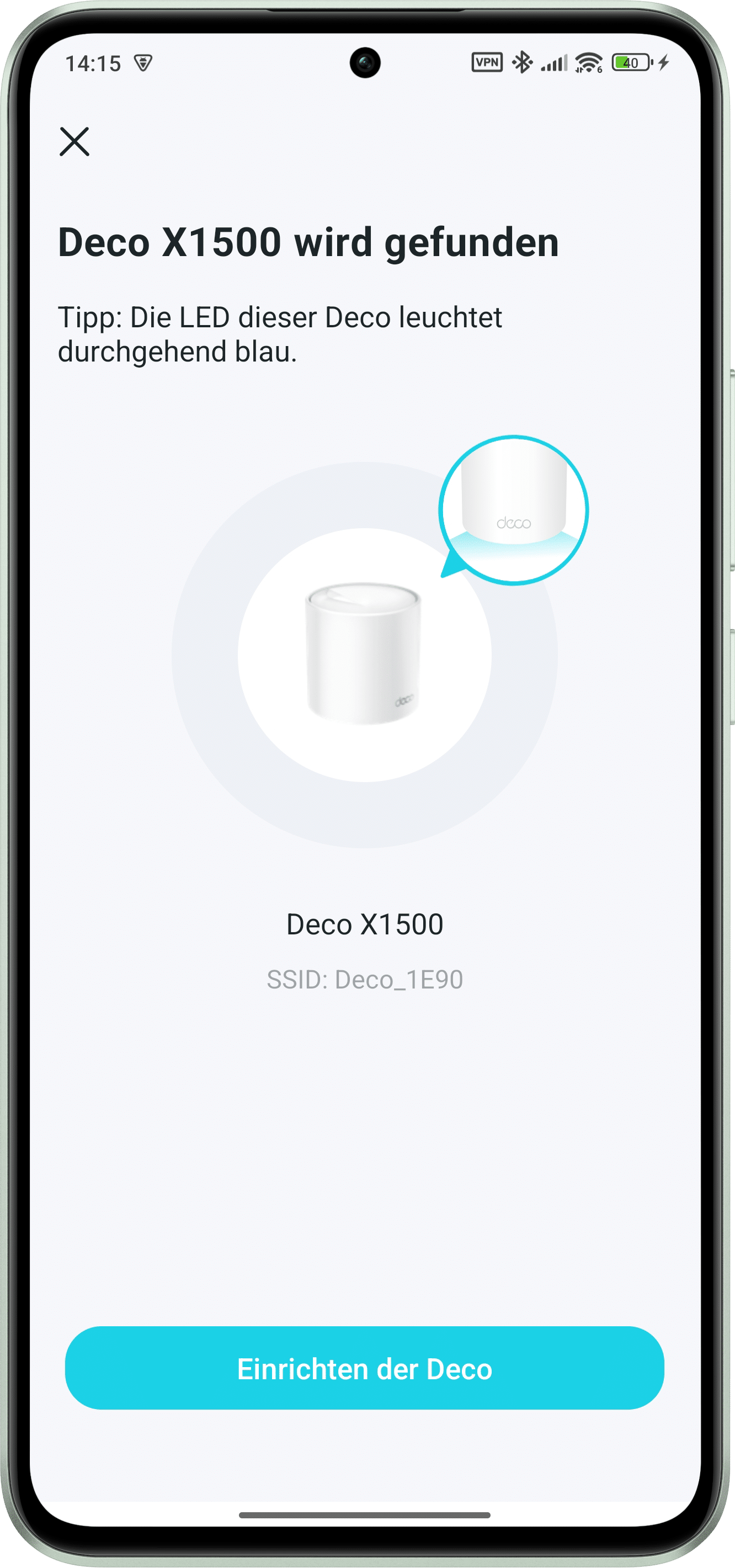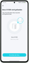 After logging in, you can either create a new network or add a Deco via the menu bar. Otherwise, the setup wizard starts by default during the initial setup. As a rule, the first Deco X1500 is first connected to the existing modem or Internet socket via LAN cable, followed by plugging in the enclosed power supply unit. The network is then automatically detected within the app. If desired, you can also scan the QR code on the underside of the device. To rule out any network problems from the outset, the modem should now be restarted once. The next step is to assign the Deco to a room and give it a Wi-Fi name and password. Once the configuration is complete, the smartphone connects directly to the new mesh network. At this point, the mesh system is fully set up.