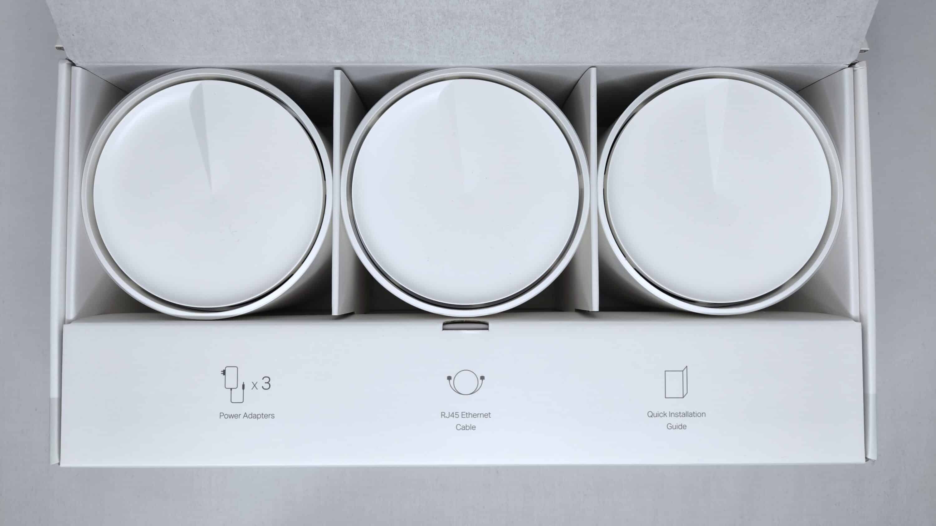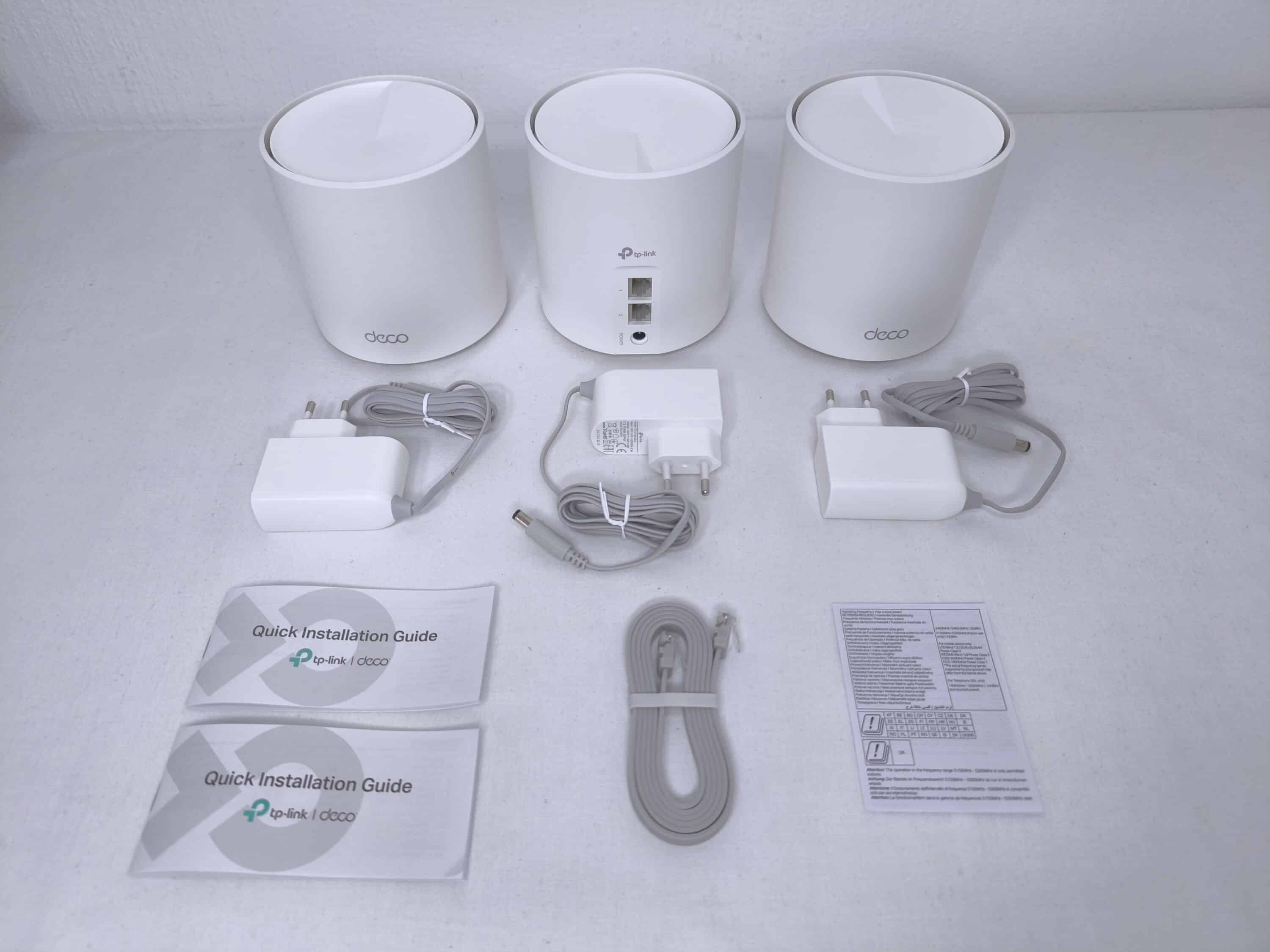 If you unpack the entire set and spread it out next to each other, the following individual parts are revealed. In addition to the three X1500 decoders mentioned above, there are a total of three power supply units and an RJ45 Ethernet cable. The latter is relevant for connecting at least one Deco via LAN. The scope of delivery is supplemented by the usual paper supplement, which contains the quick start guide and an overview of the device features.