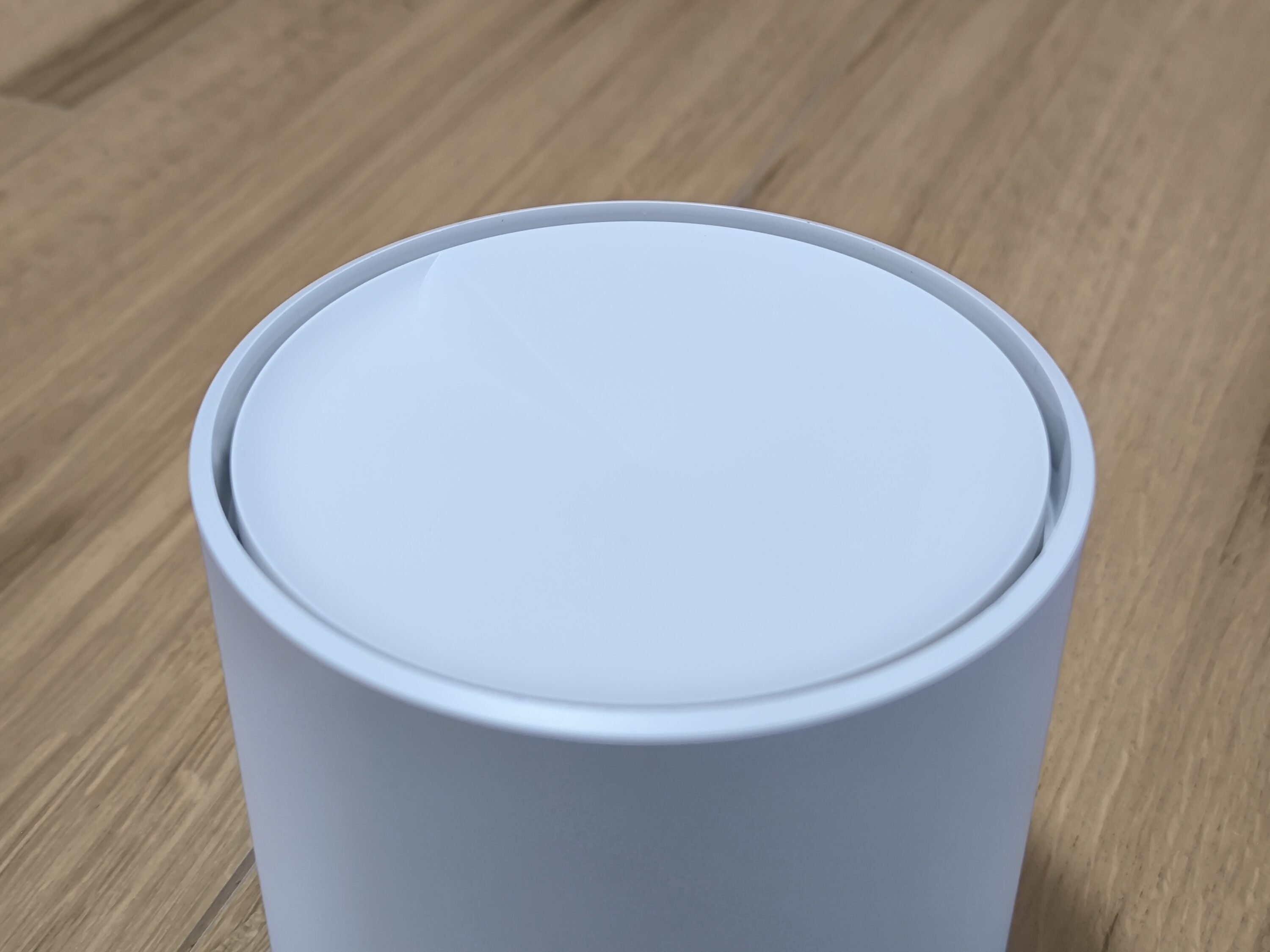 In terms of design, the TP-Link Deco X1500 are somewhat chunkier than the Deco BE25 (our test), as their construction significantly emphasizes their height. Nevertheless, the X1500 also fits into the pattern of simple and unobtrusive design. In this respect, these Decos can be described more as cylindrical with a matt white surface. An eye-catcher is the top, whose plastic surface is slightly concave and slopes gently towards the center. In short, it can be said that the Deco X1500 fits well into modern living and office environments. In addition, there are no LEDs or buttons on the top, giving it the minimalist look you would expect from a discreet technology device.