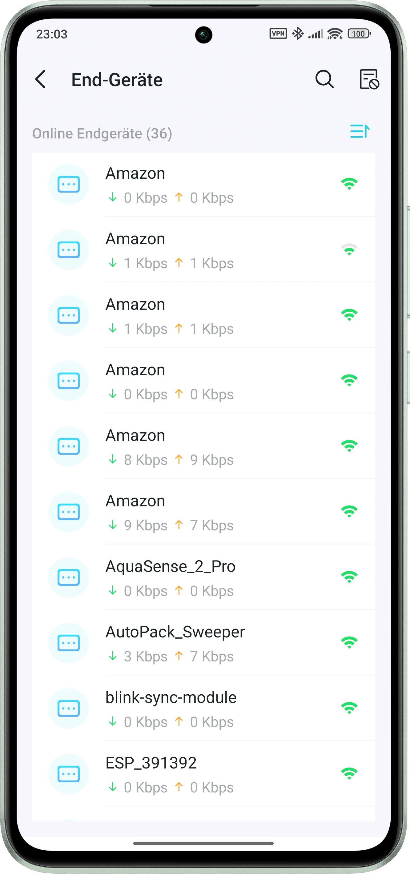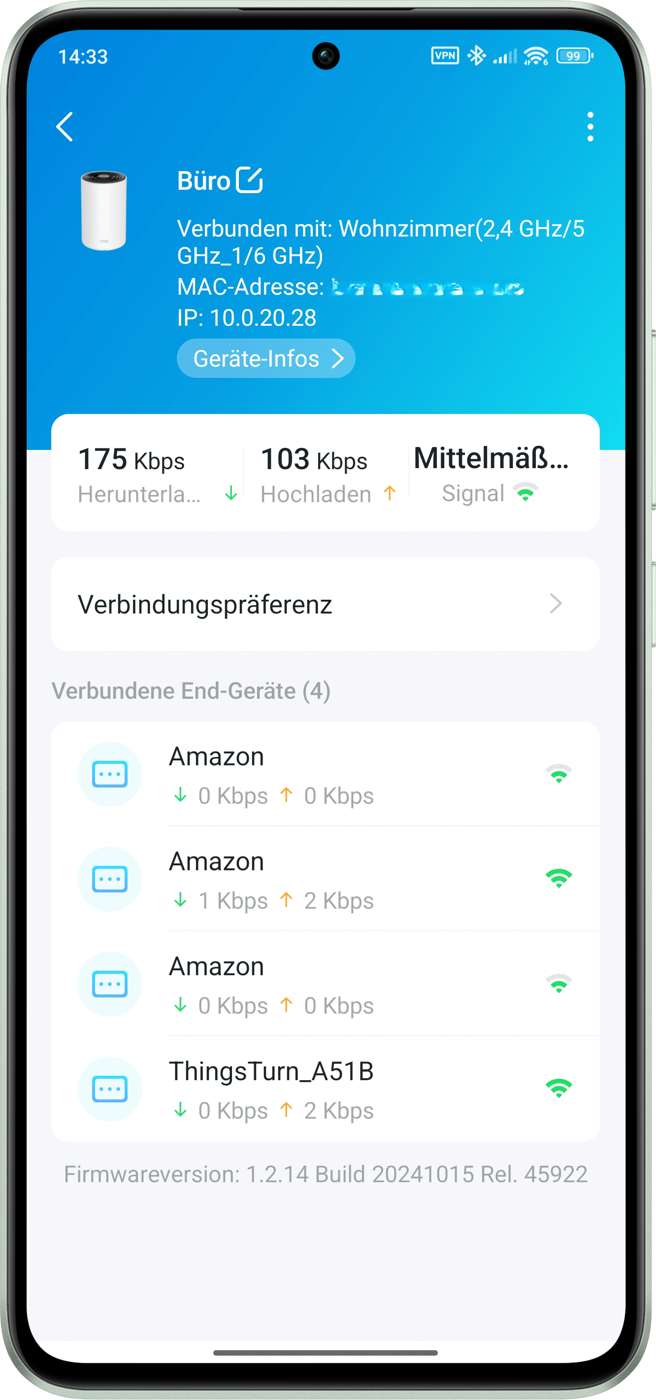 The TP-Link Deco XE75 also proves to be mature in the everyday test for covering a house. Thanks to the vertically distributed positioning across three floors, the WLAN signal works without any problems. Even in more distant rooms and outside the direct line of sight of a mesh unit, this test worked straight away. The signal strength on the smartphone was always at least good, in most cases even very good.