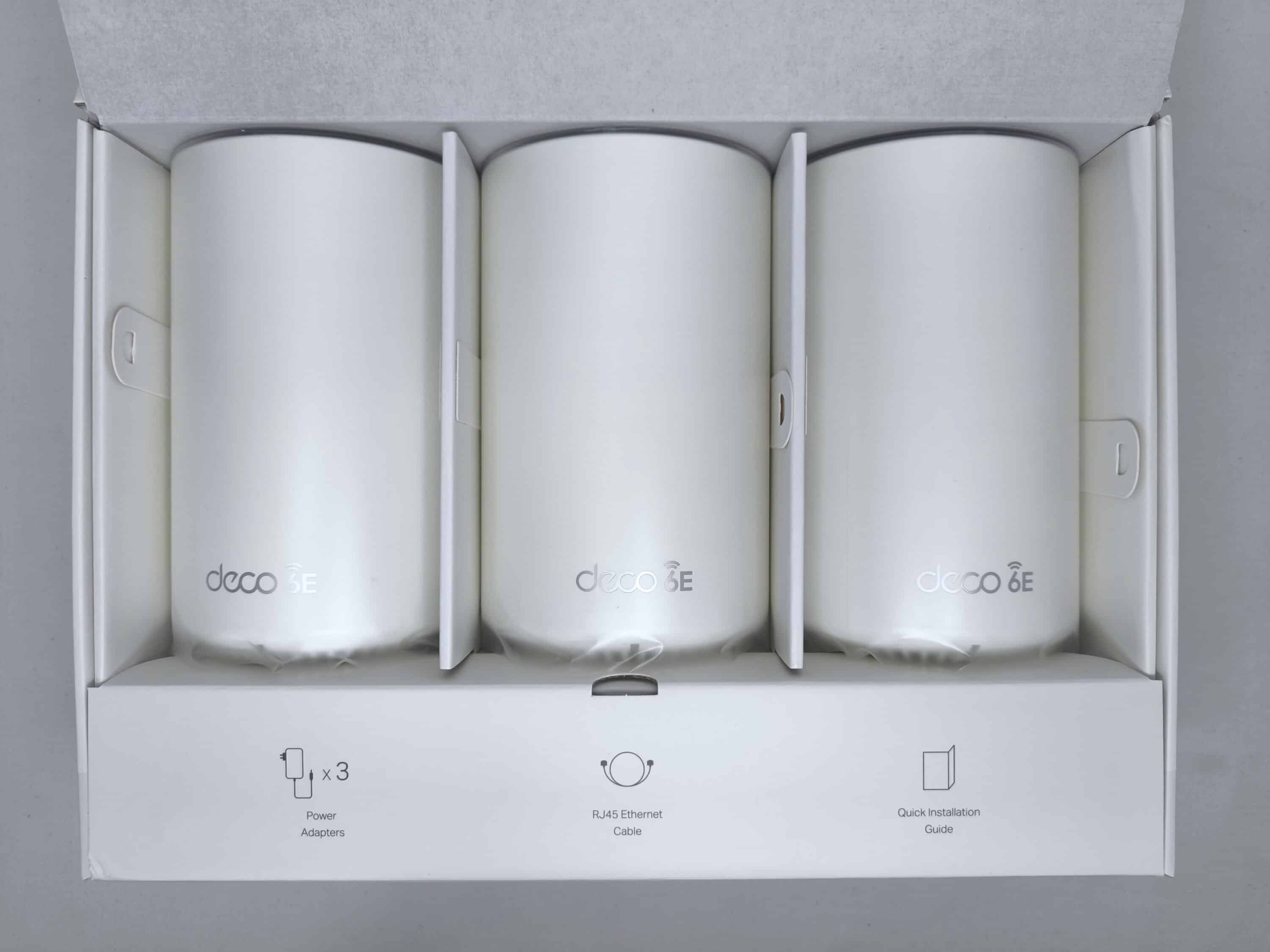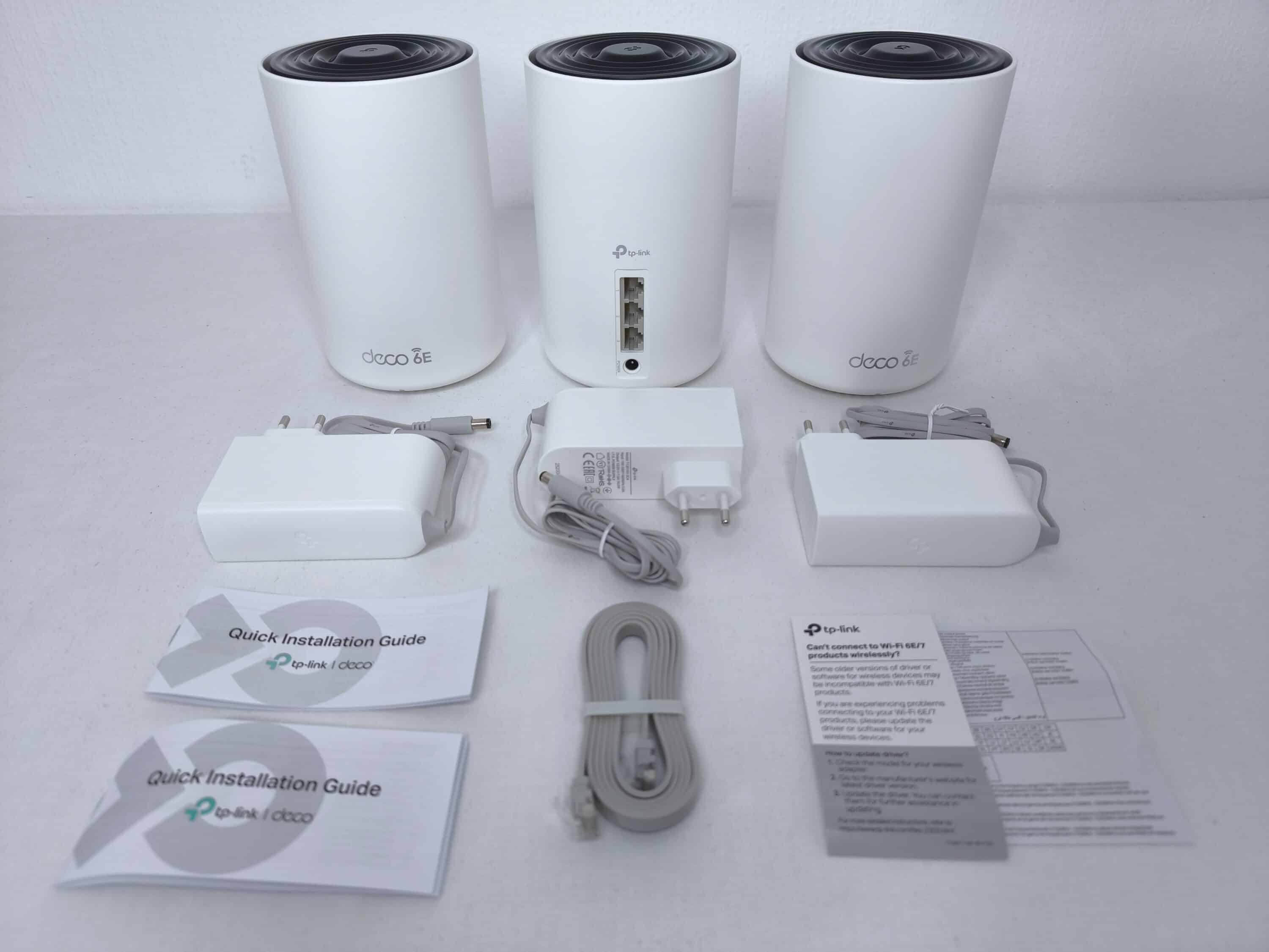 The TP-Link Deco X75 set consists of three Deco units, three power supply units and an RJ45 Ethernet cable. To ensure an optimal connection, at least or ideally several Deco units should be connected via LAN. The package is completed by the usual set of documents, consisting of a quick start guide and individual information sheets.