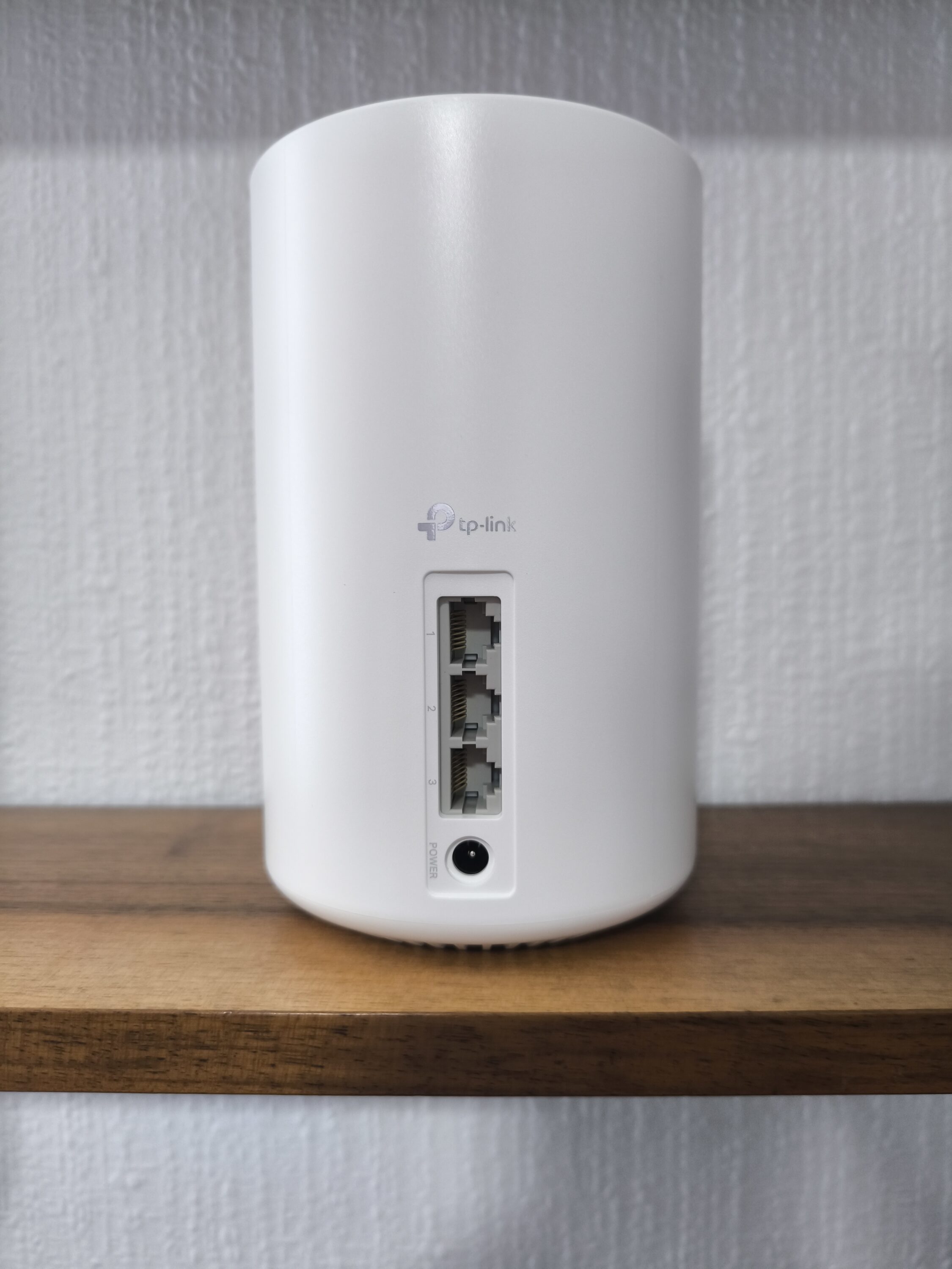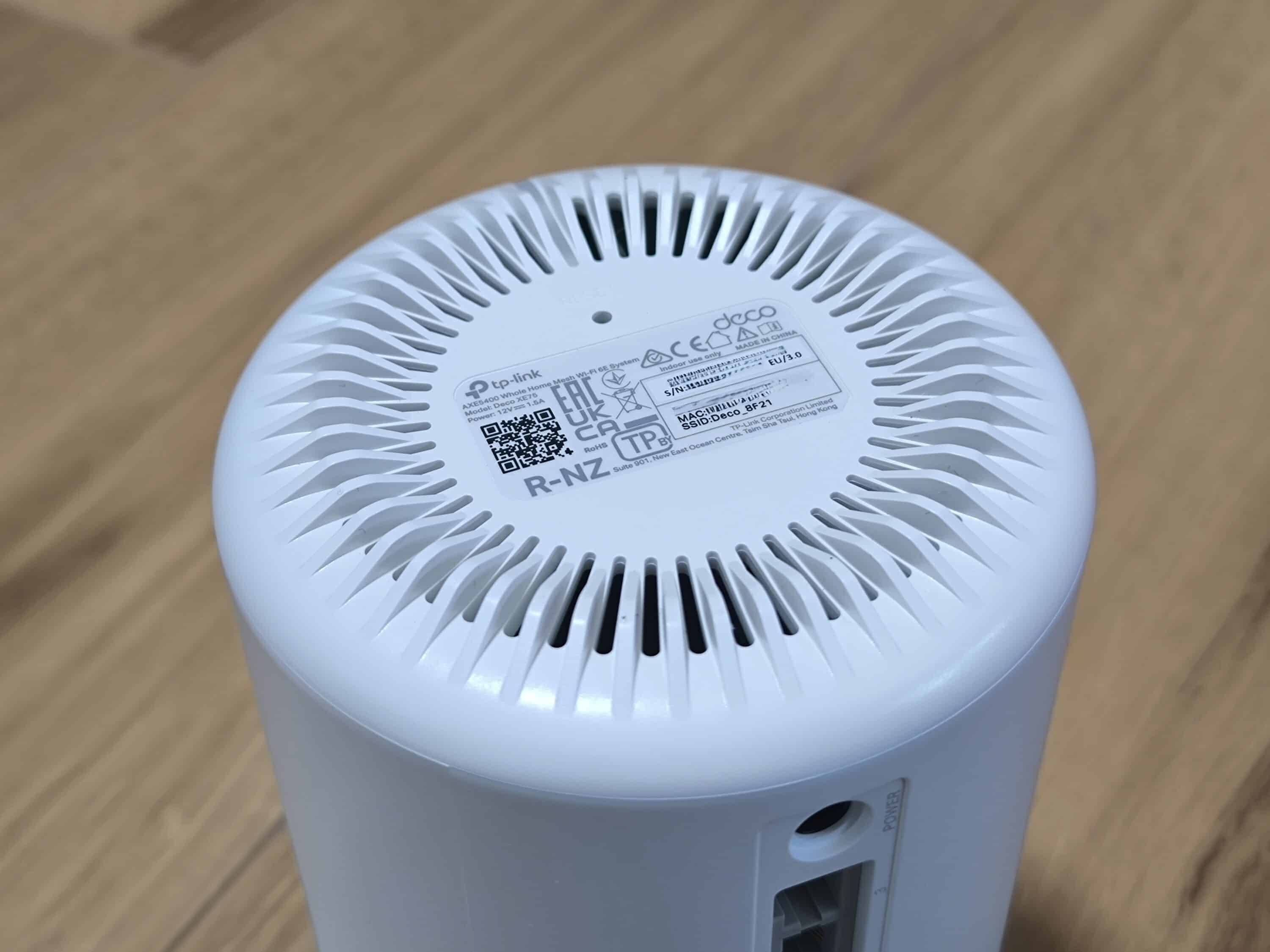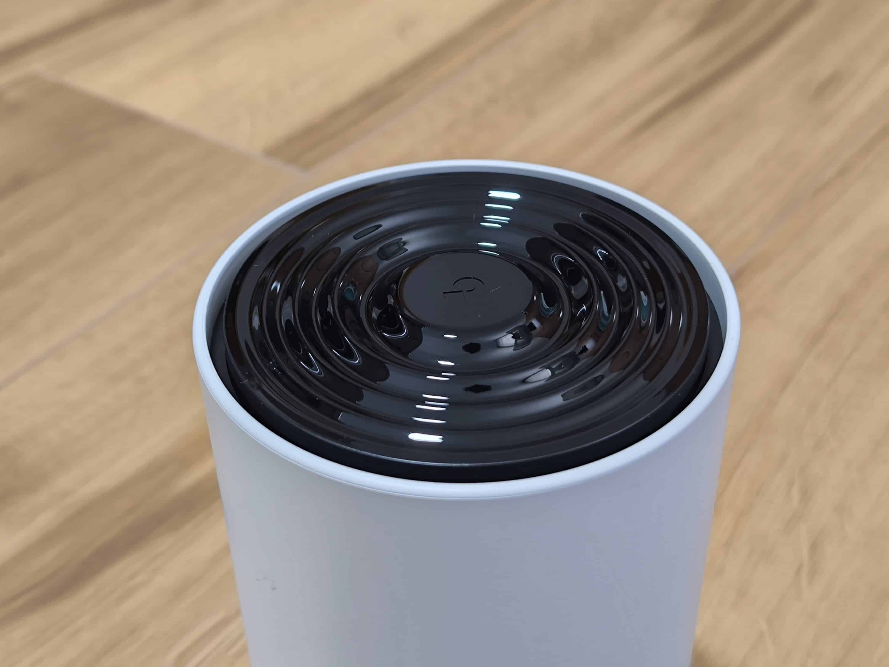 In contrast to the X1500 (our test), the TP-Link Deco XE75 has a more upmarket design, while the cylindrical shape and matt white surface are largely retained. The glossy black lid is particularly striking, with a grill-like pattern and central TP-Link logo on its circular surface. With this color scheme, the XE75 clearly stands out from the otherwise pure white device series. Similar designs are more likely to be found in smart speakers. But regardless of this, the XE75 also conveys a combination of minimalism and aesthetics.