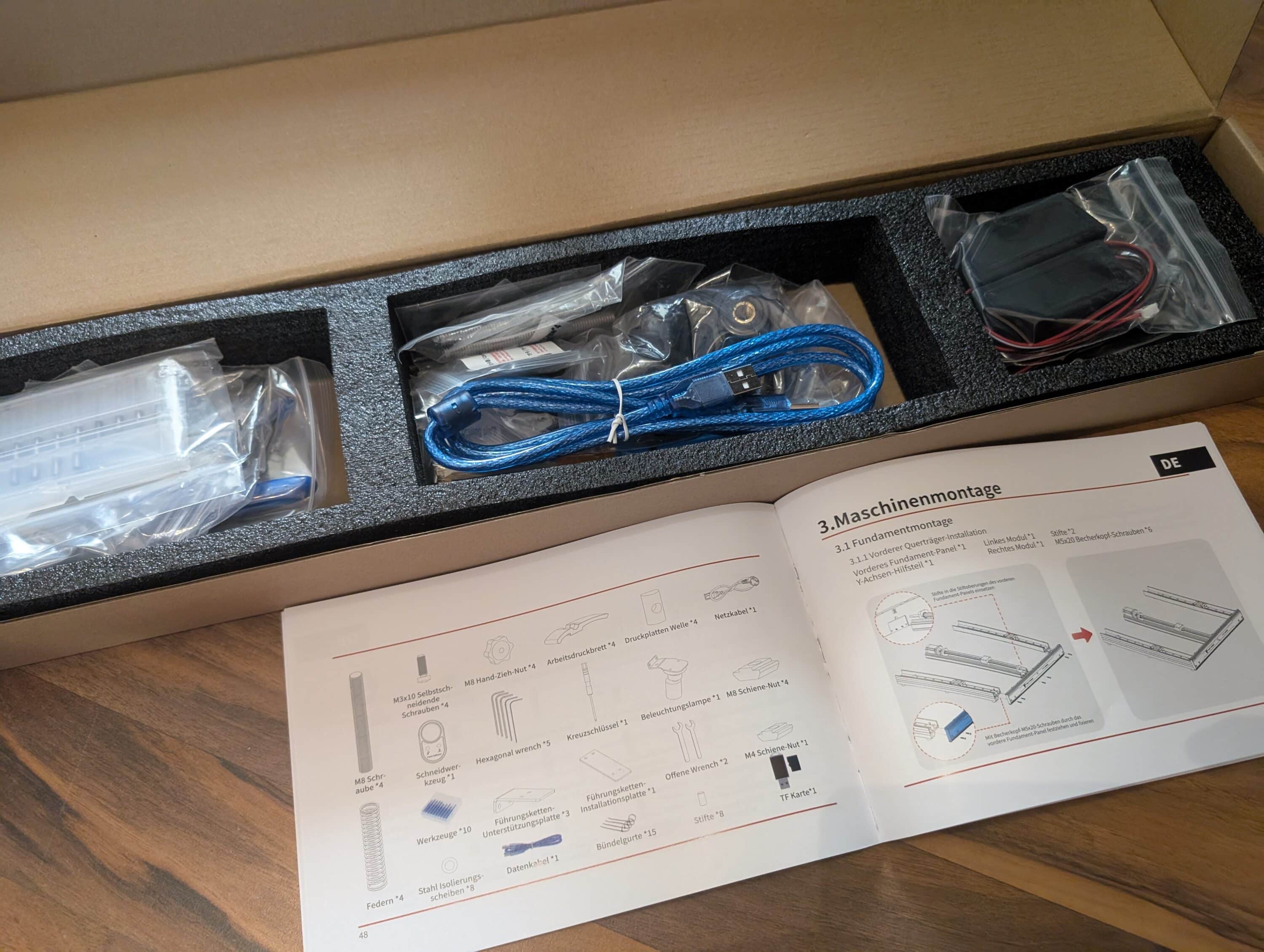 Assembling the Twotrees TTC-6050 for our test took time and patience. We needed a good 2.5 hours of pure assembly time, plus time to study the instructions and make minor adjustments. Anyone who has assembled a smaller CNC router before will find their way around more quickly, but it can be tricky in some places. The instructions guide you logically through the assembly, starting with the base frame. All aluminum profiles are precisely milled and fit together with millimeter precision. The connections are made using robust screw connections, which should remain stable even after prolonged use.